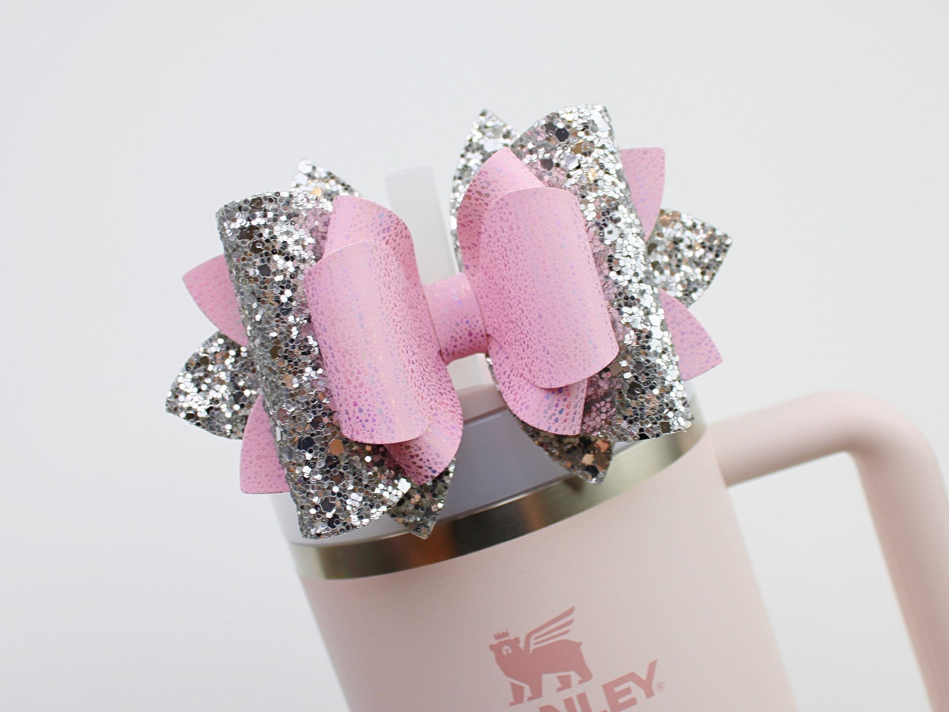 🎀 This Beautiful Bow is made out of faux leather, glitter fabric and designed to fit Stanley straws. Size: 4.5 inches. Each bow is handmade, ensuring a unique touch in every creation. 🎨 Due to screen variations, actual colors may slightly differ. 📦 This listing is for the bow only.Â