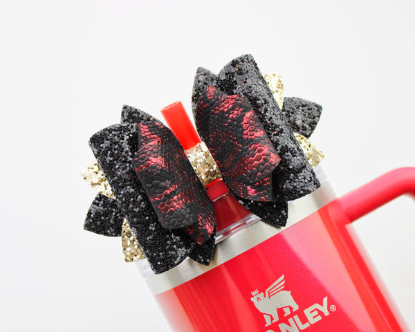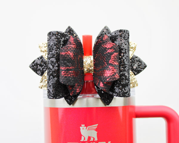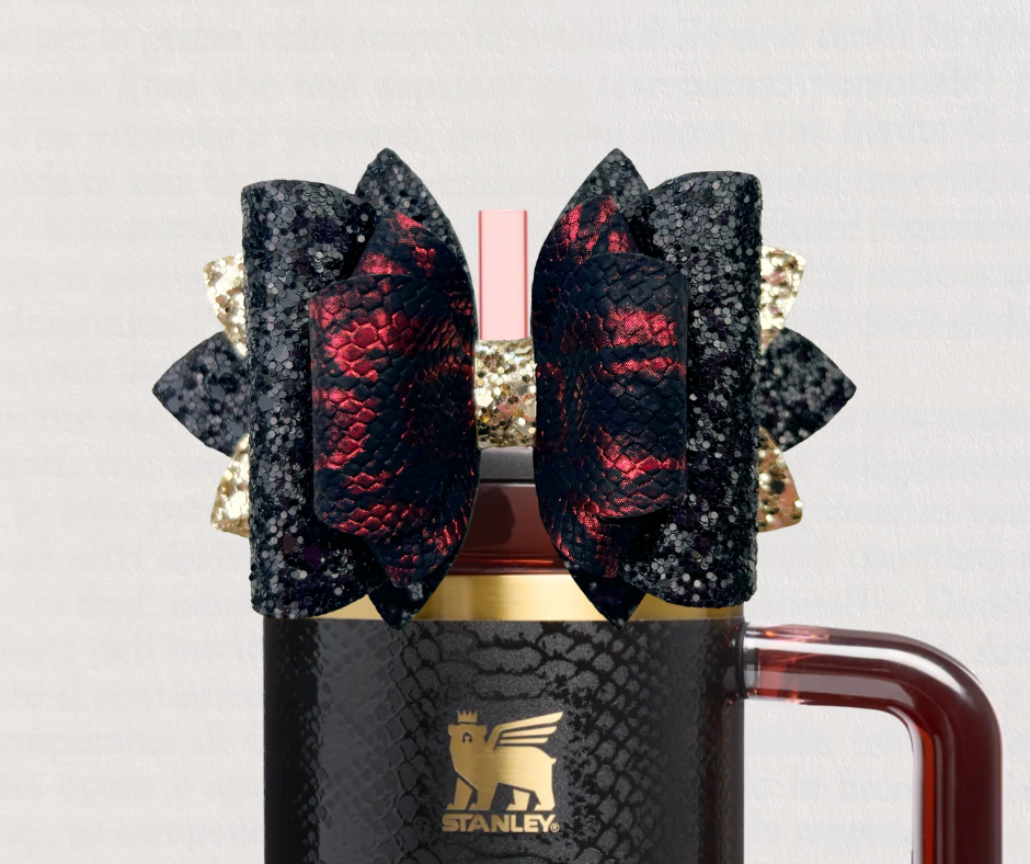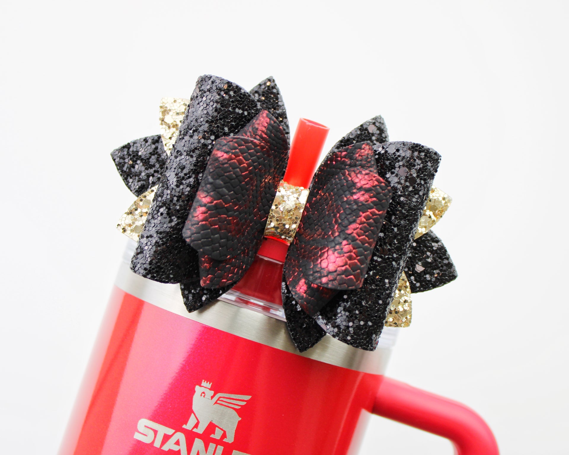 🎀 This Beautiful Bow is made out of faux leather, glitter fabric and designed to fit Stanley straws. Size: 4.5 inches. Each bow is handmade, ensuring a unique touch in every creation. 🎨 Due to screen variations, actual colors may slightly differ. 📦 This listing is for the bow only.