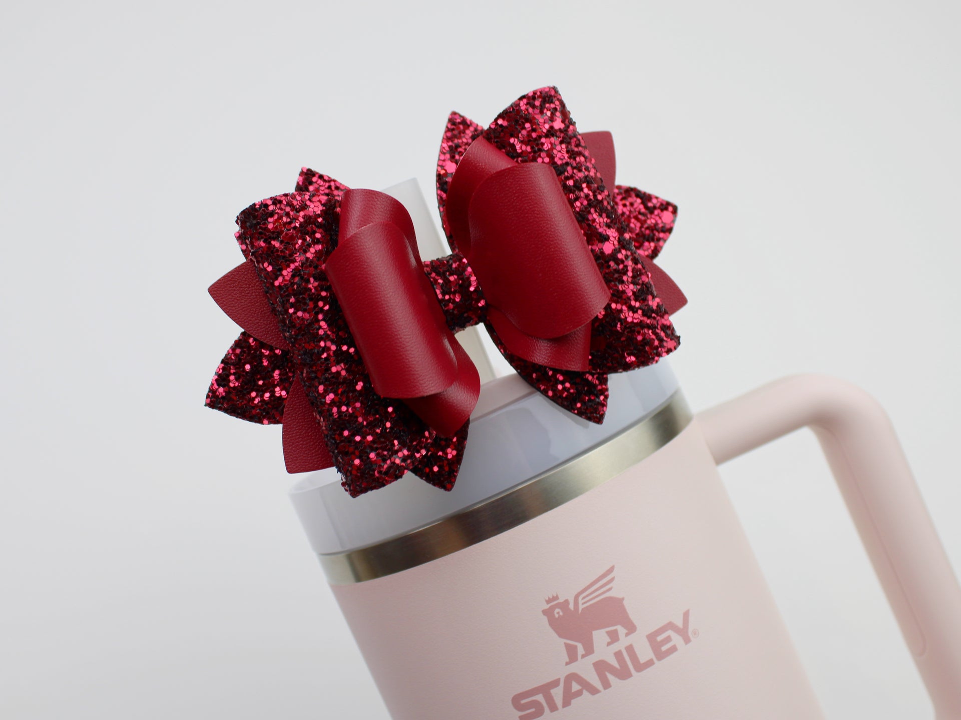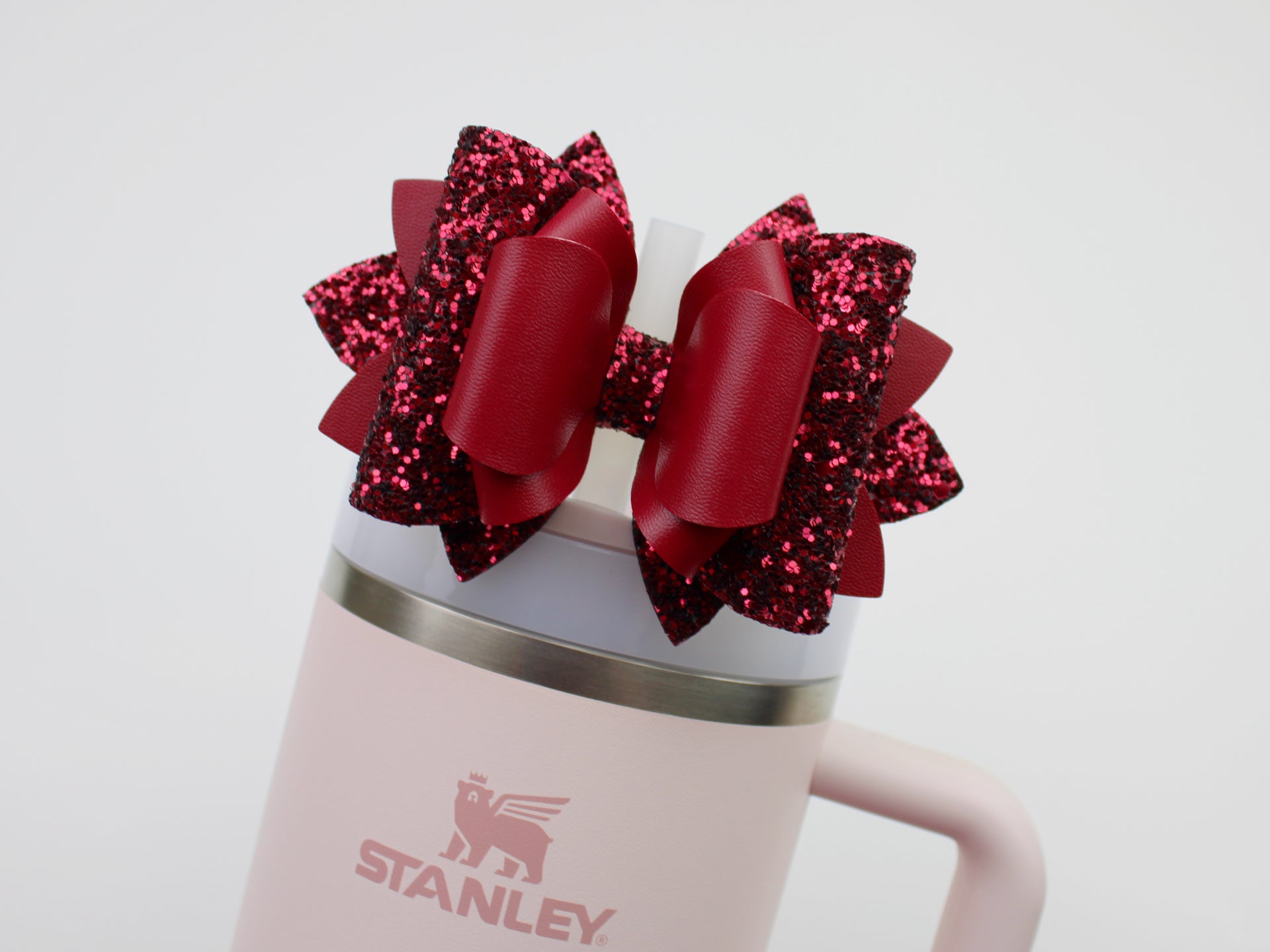 🎀 This Beautiful Bow is made out of faux leather, glitter fabric and designed to fit Stanley straws. Size: 4.5 inches. Each bow is handmade, ensuring a unique touch in every creation. 🎨 Due to screen variations, actual colors may slightly differ. 🎀 This listing is for the bow only.