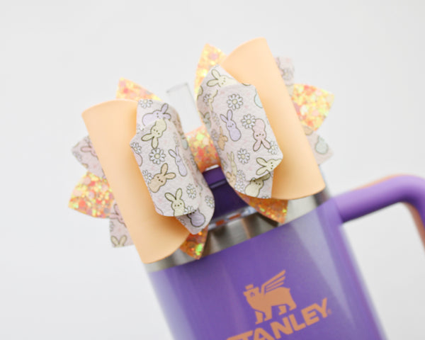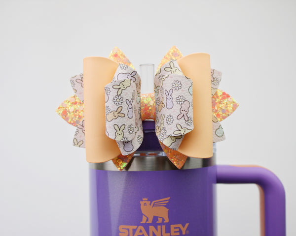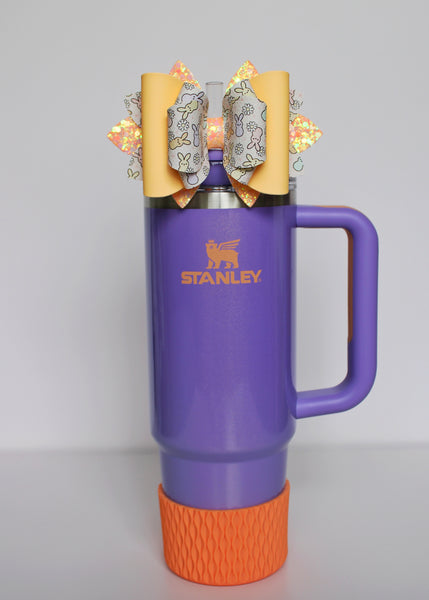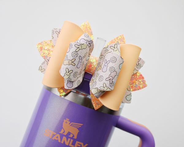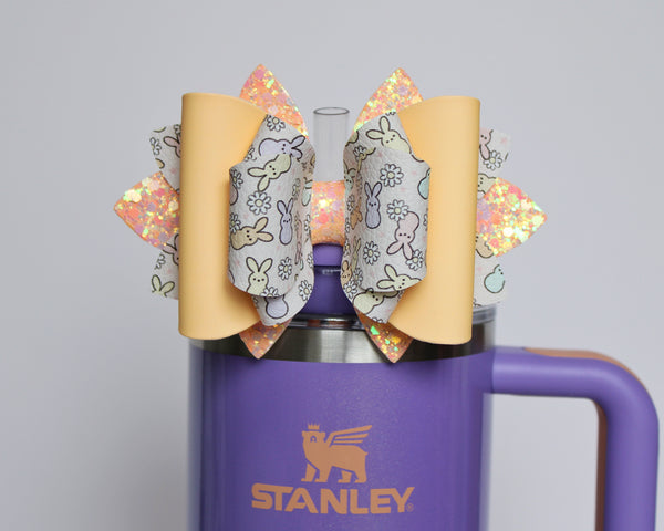 🎀 This Beautiful Bow is made out of faux leather, glitter fabric and designed to fit Stanley straws. Size: 4.5 inches. Each bow is handmade, ensuring a unique touch in every creation. 🎨 Due to screen variations, actual colors may slightly differ. 📦 This listing is for the bow only.