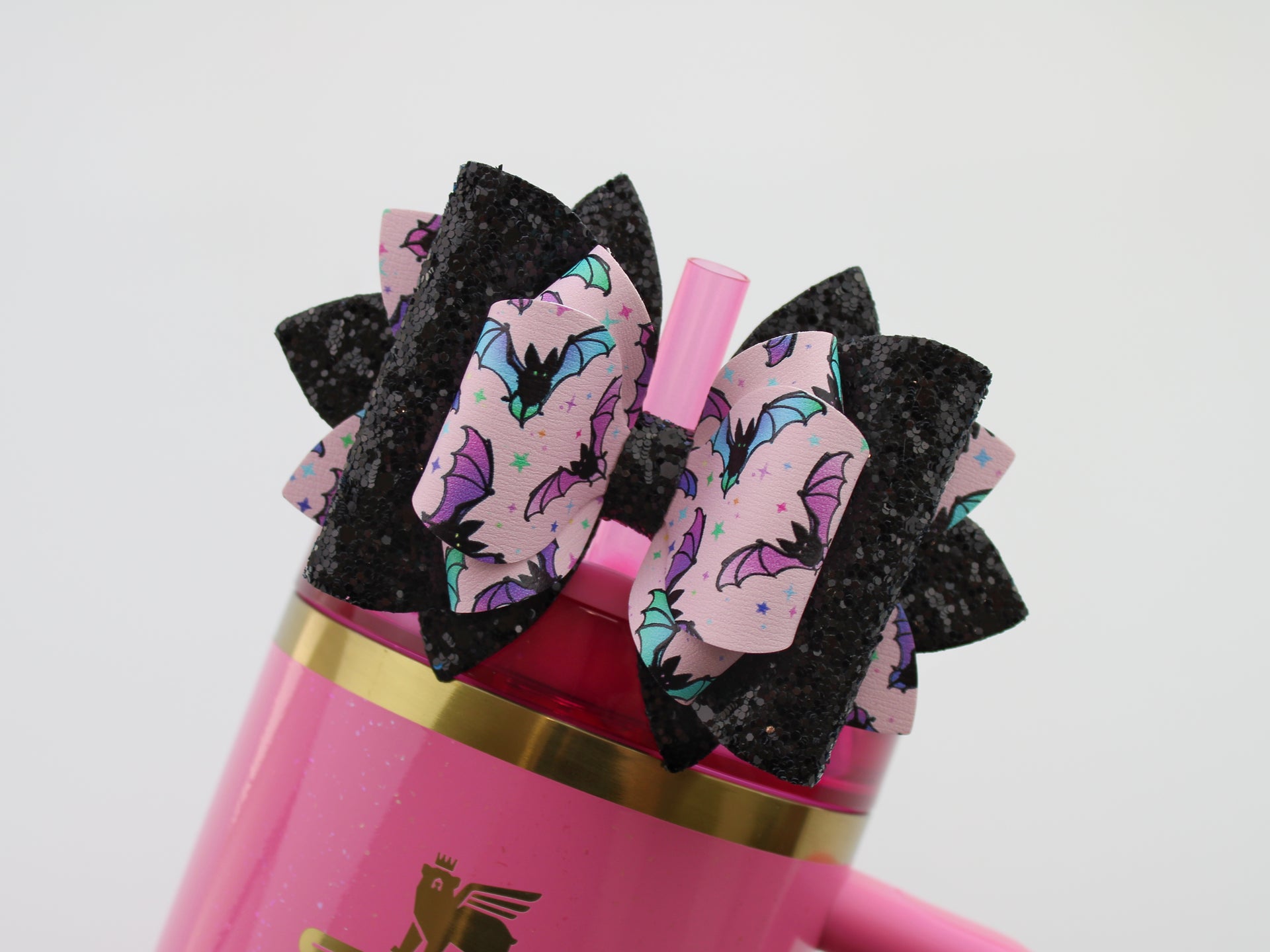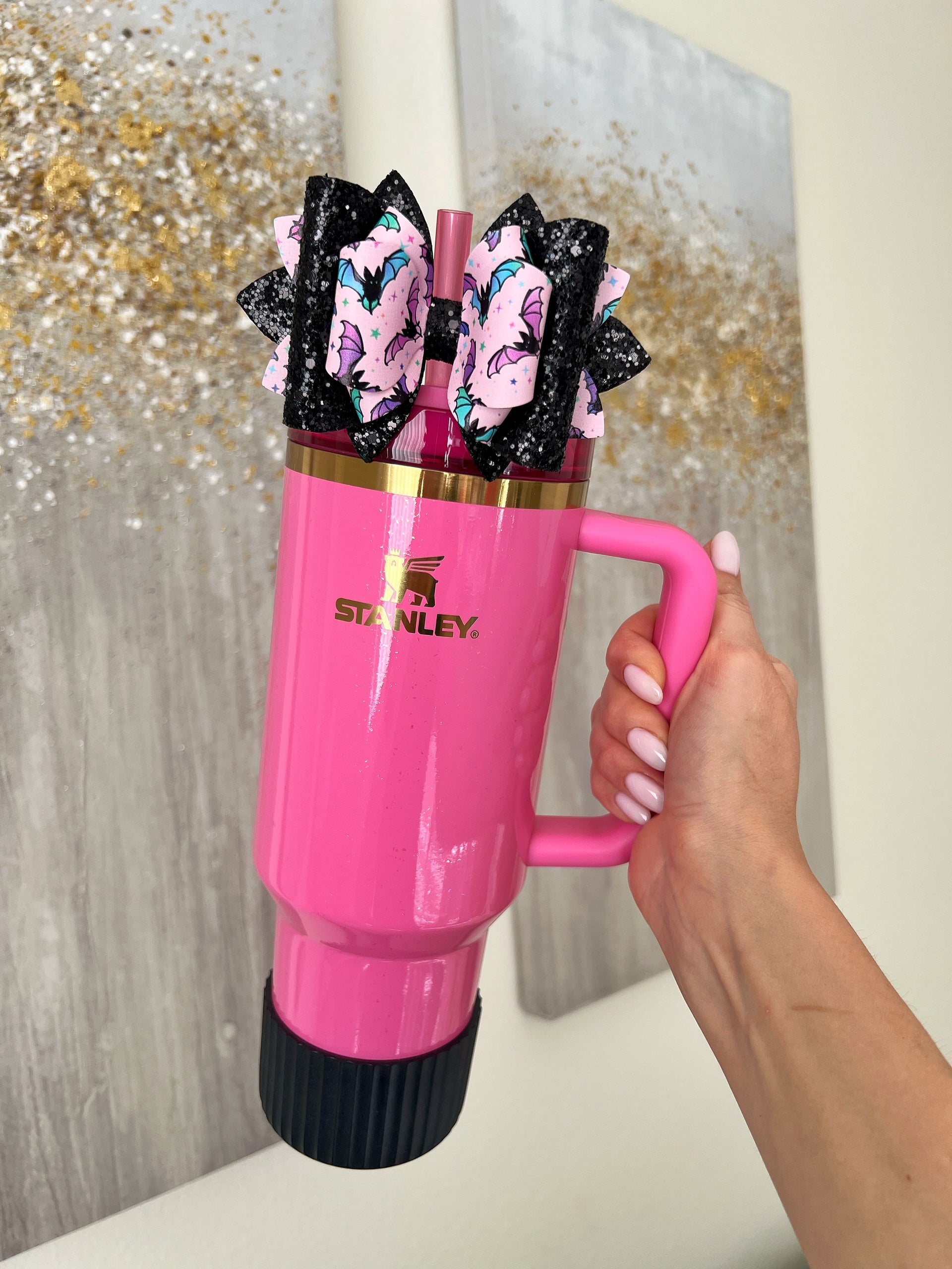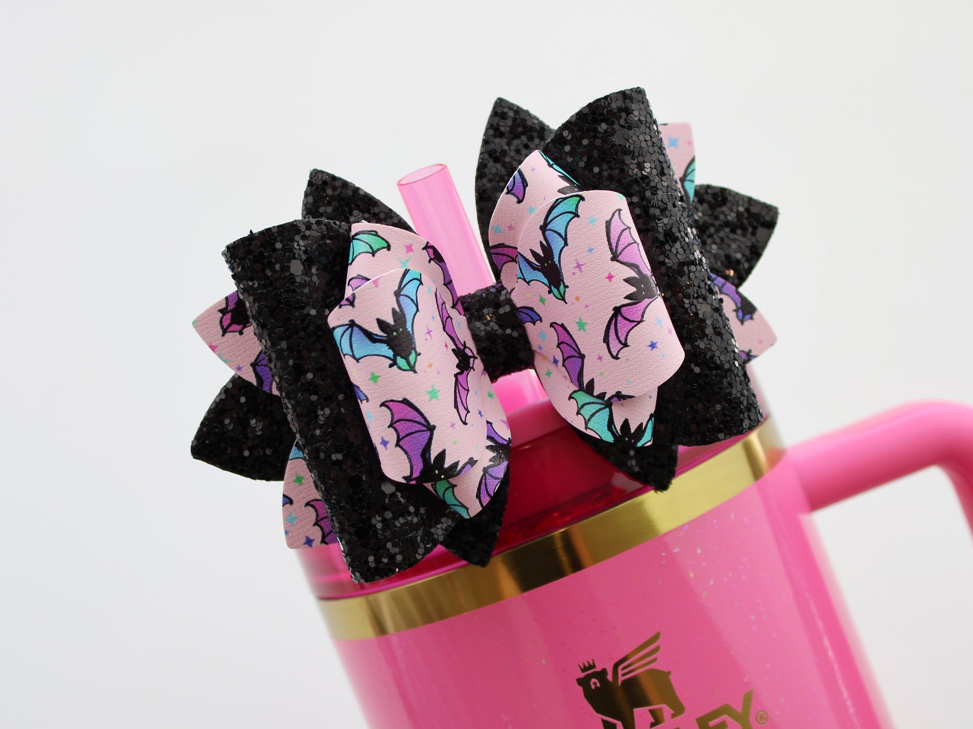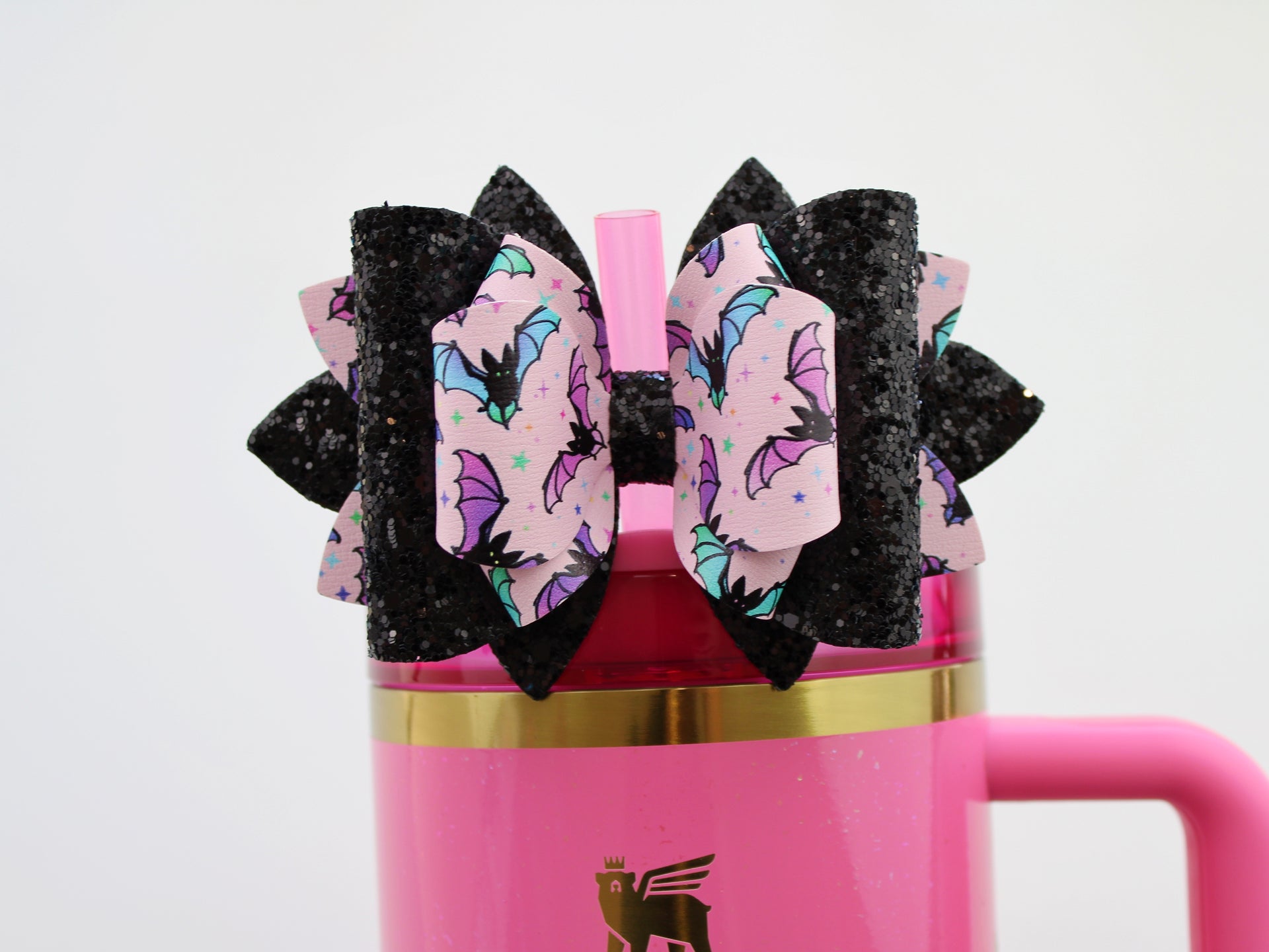 🎀 This Beautiful Bow is made out of faux leather, glitter fabric and designed to fit Stanley straws. Size: 4.5 inches. Each bow is handmade, ensuring a unique touch in every creation. 🎨 Due to screen variations, actual colors may slightly differ. 📦 This listing is for the bow only.