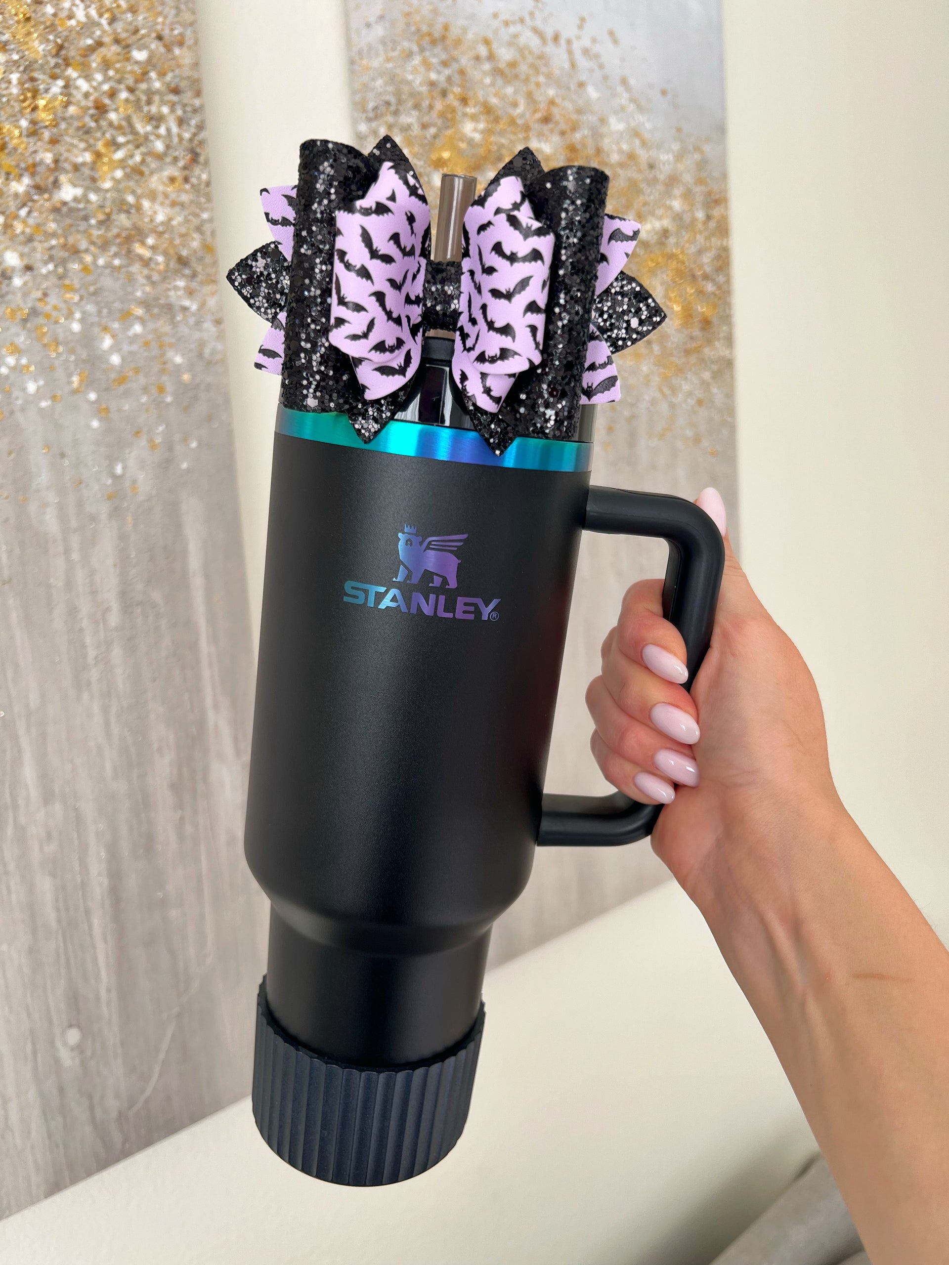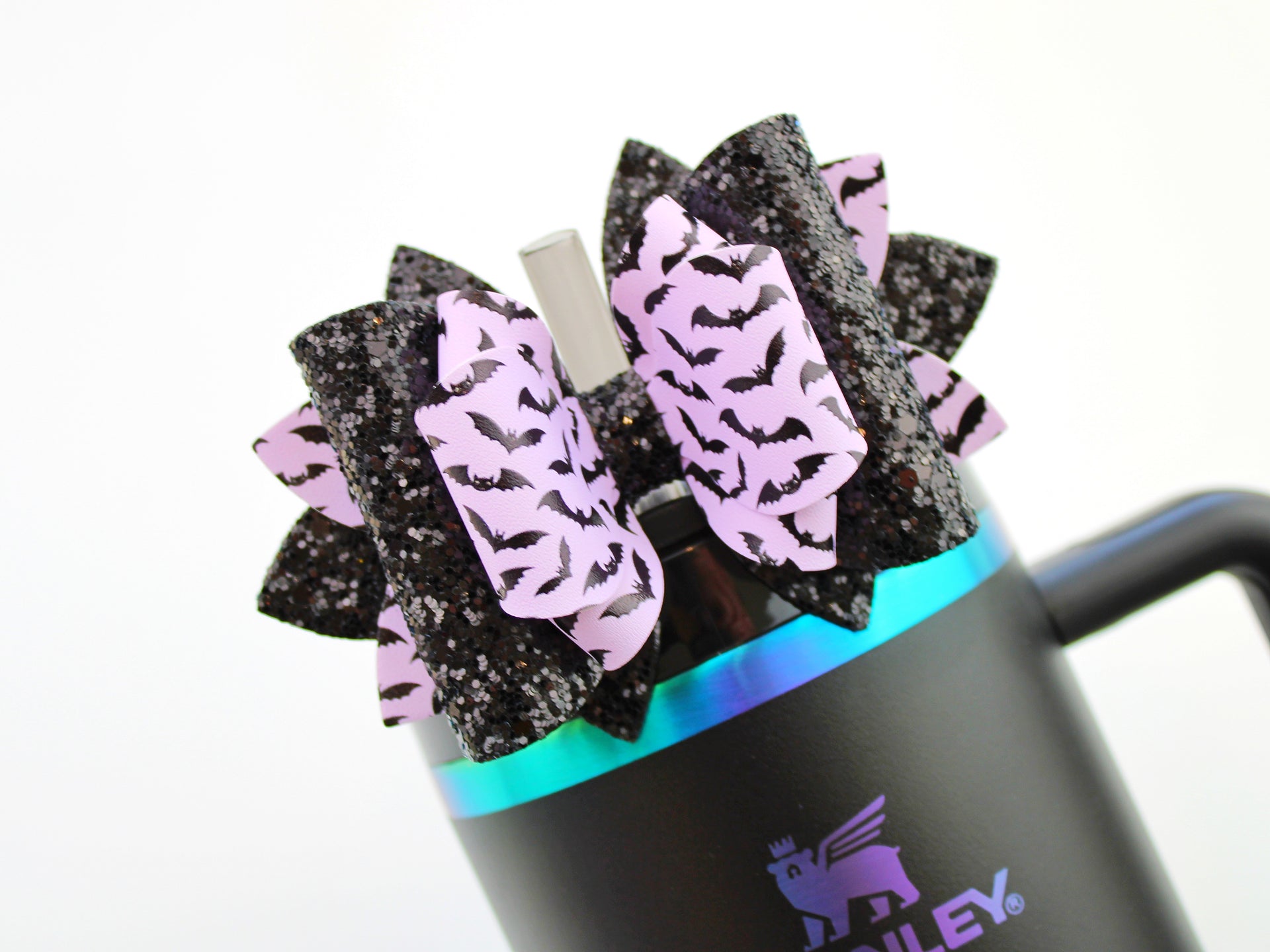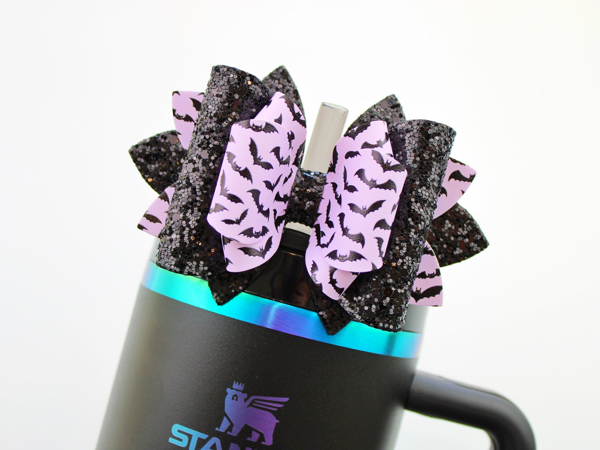 🎀 This Beautiful Bow is made out of faux leather, glitter fabric and designed to fit Stanley straws. Size: 4.5 inches. Each bow is handmade, ensuring a unique touch in every creation. 🎨 Due to screen variations, actual colors may slightly differ. 📦 This listing is for the bow only.