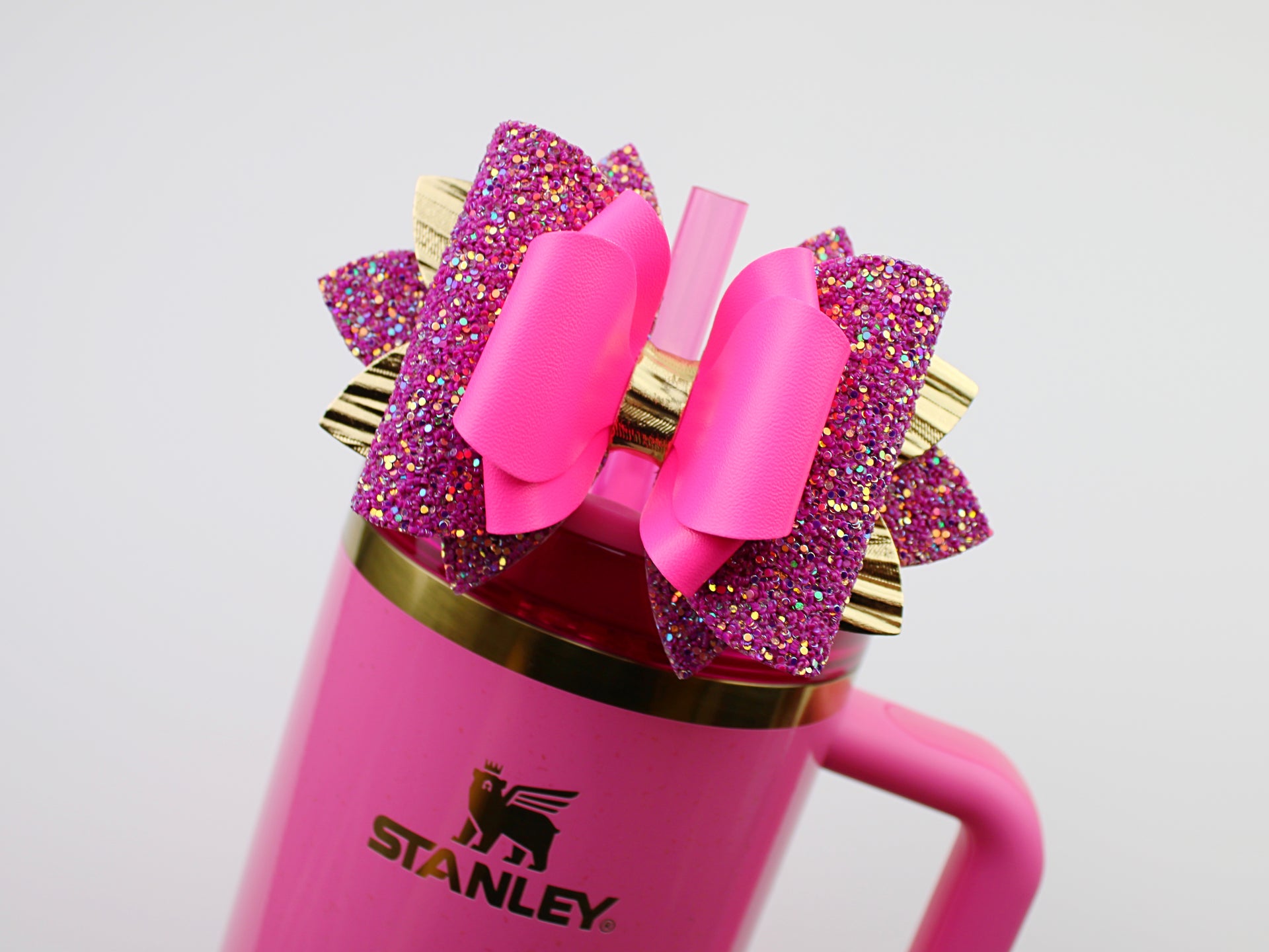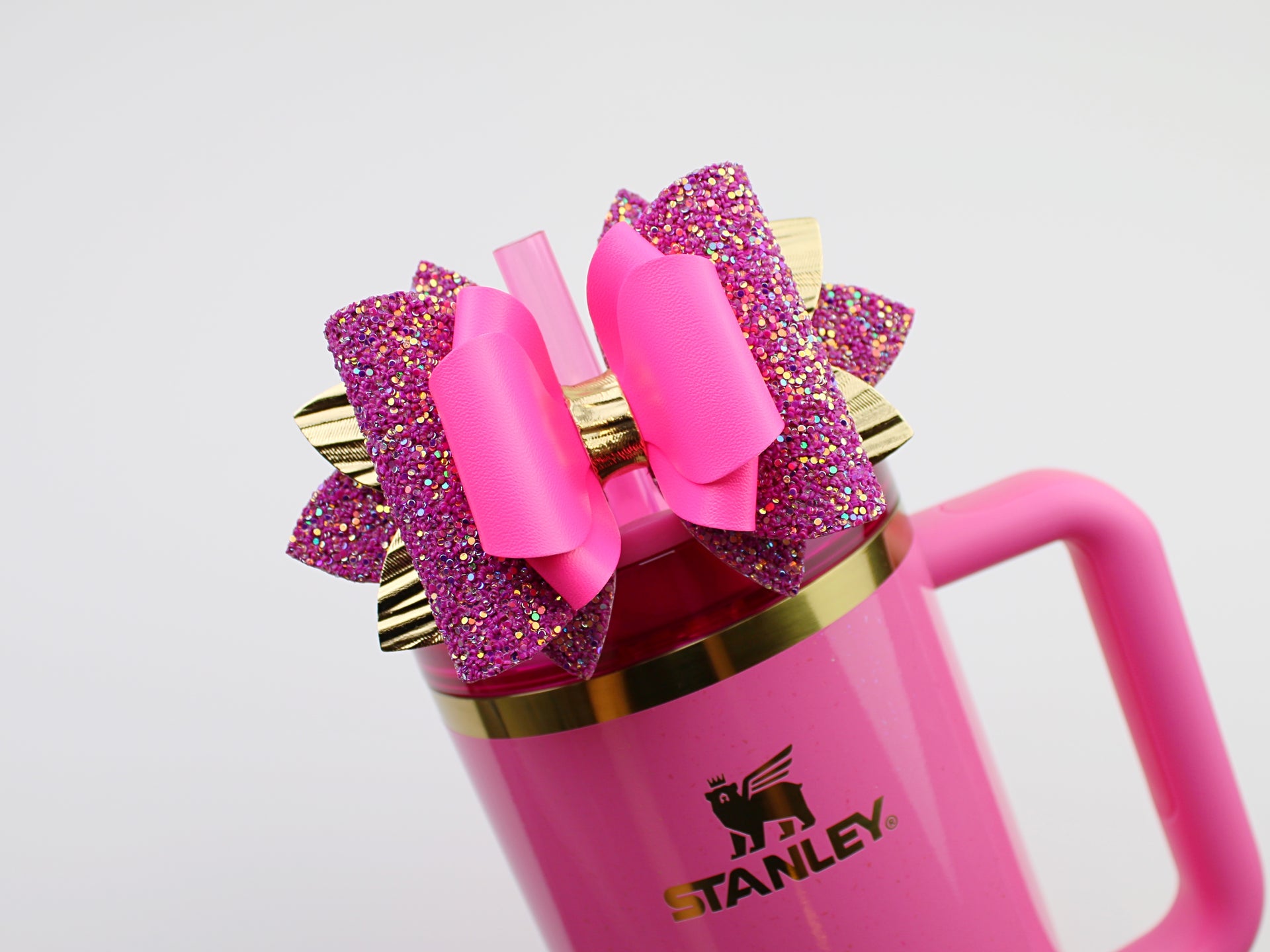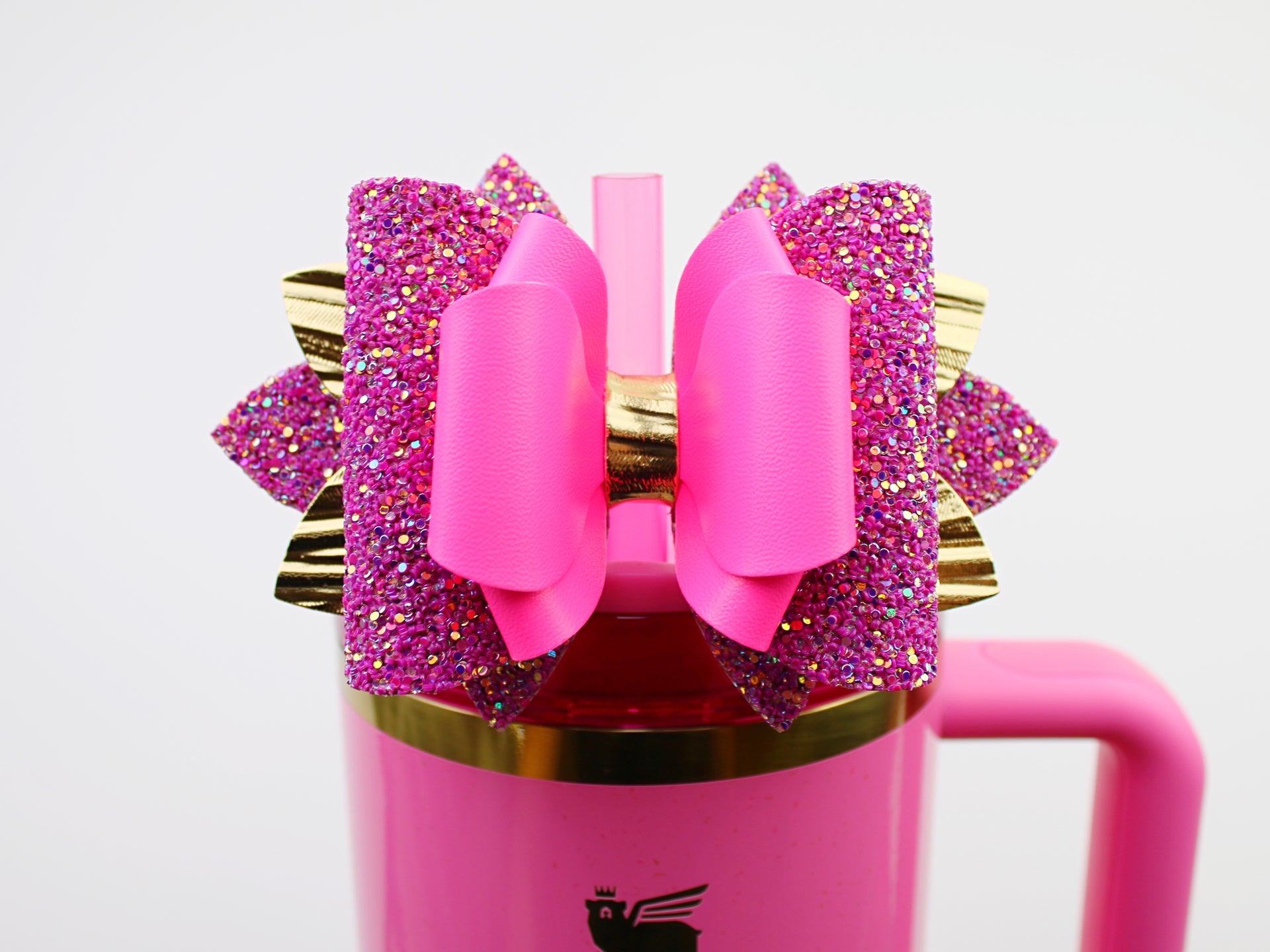 🎀 This Beautiful Bow is made out of faux leather, glitter fabric and designed to fit Stanley straws. Size: 4.5 inches. Each bow is handmade, ensuring a unique touch in every creation. 🎨 Due to screen variations, actual colors may slightly differ. 📦 This listing is for the bow only.Â