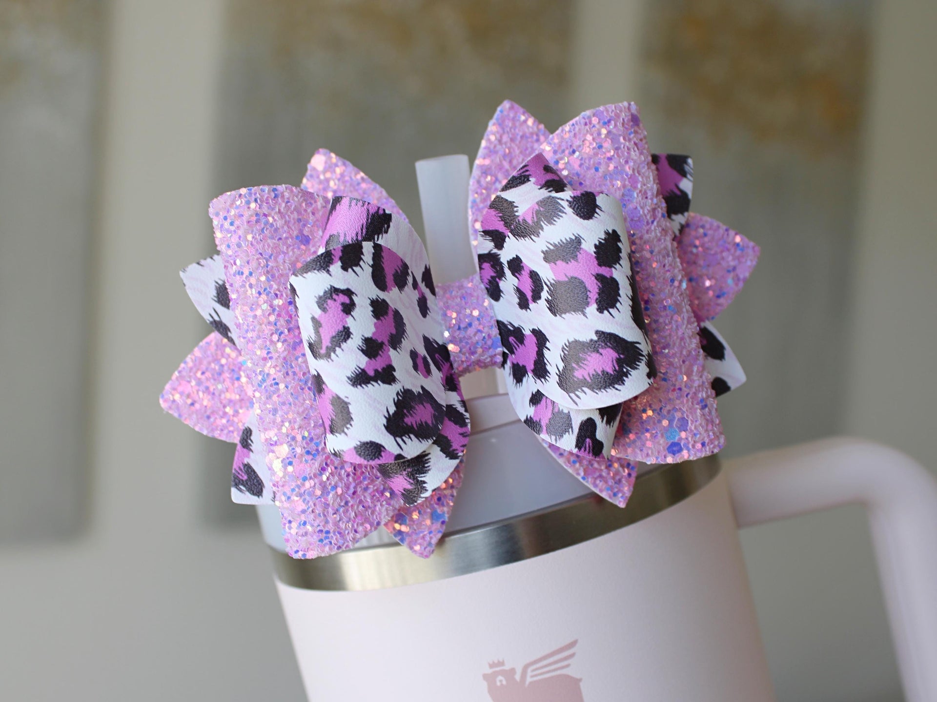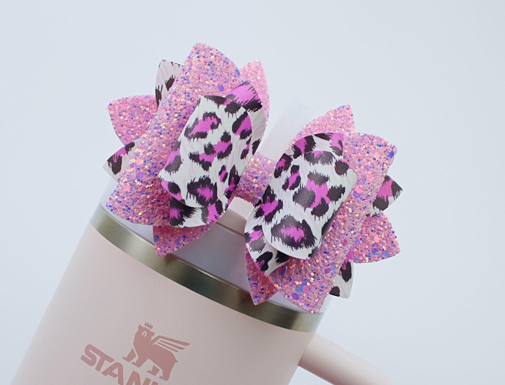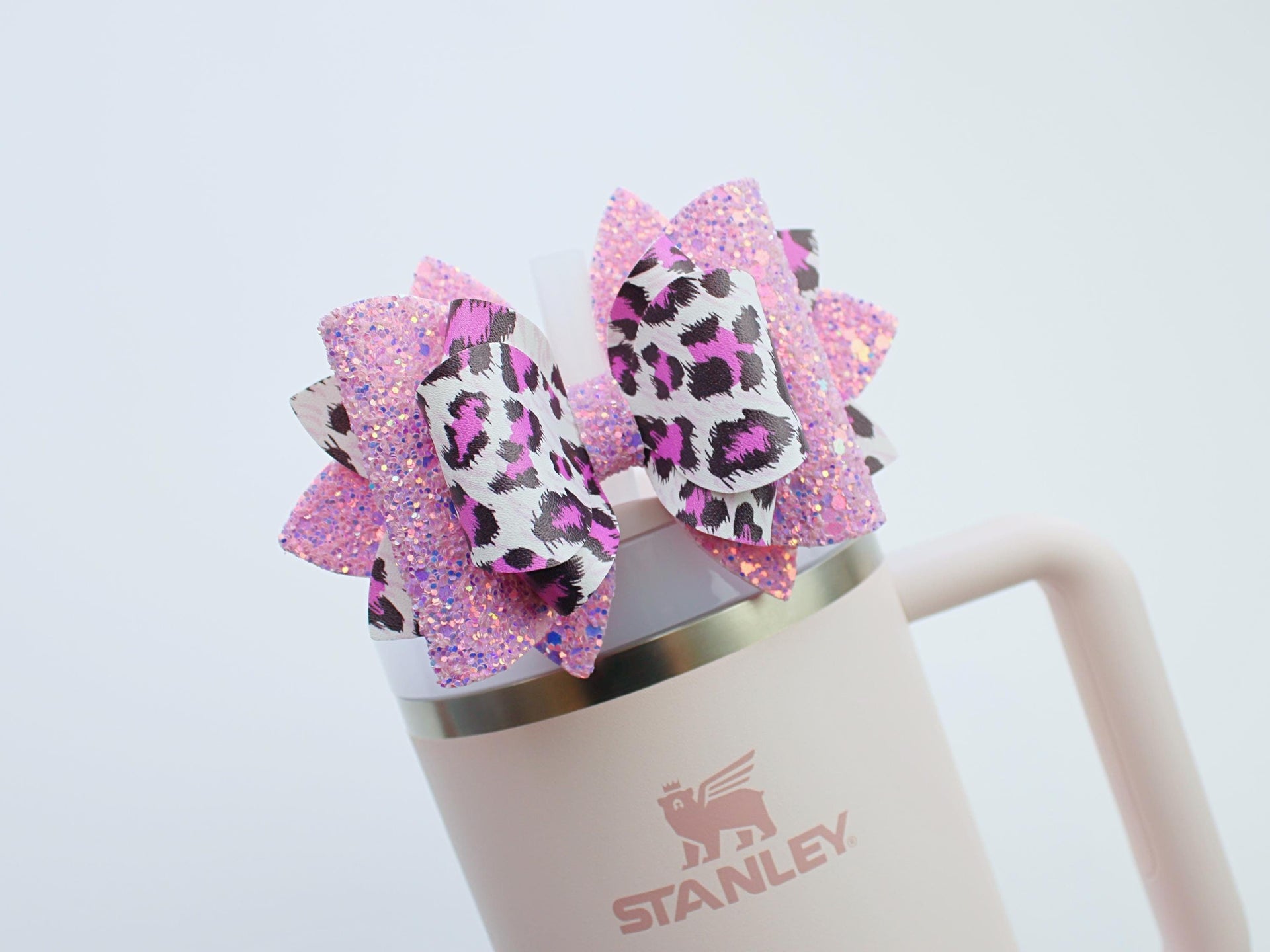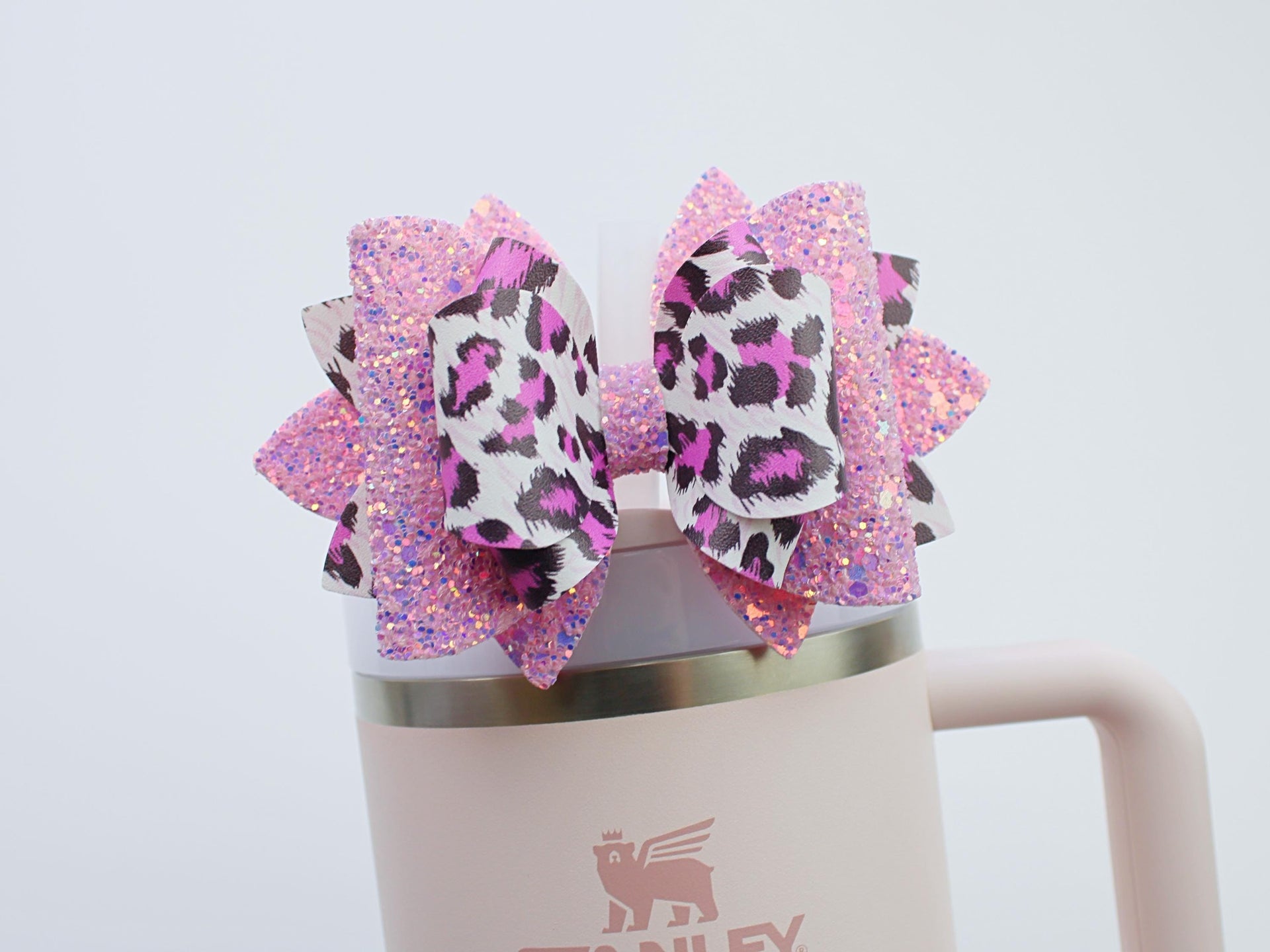 🎀 This Beautiful Bow is made out of faux leather, glitter fabric and designed to fit Stanley straws. Size: 4.5 inches. Each bow is handmade, ensuring a unique touch in every creation. 🎨 Due to screen variations, actual colors may slightly differ. 📦 This listing is for the bow only.Â