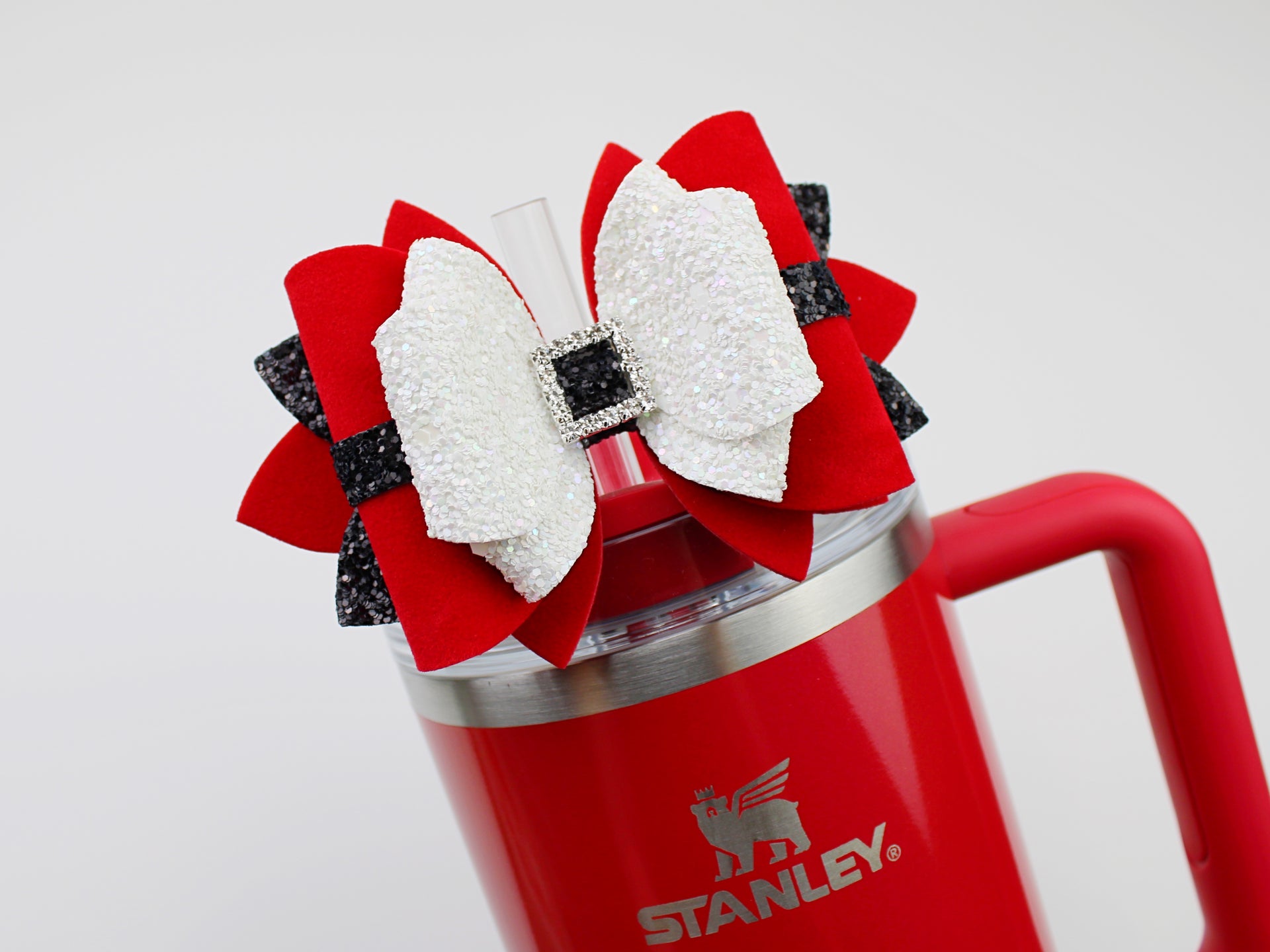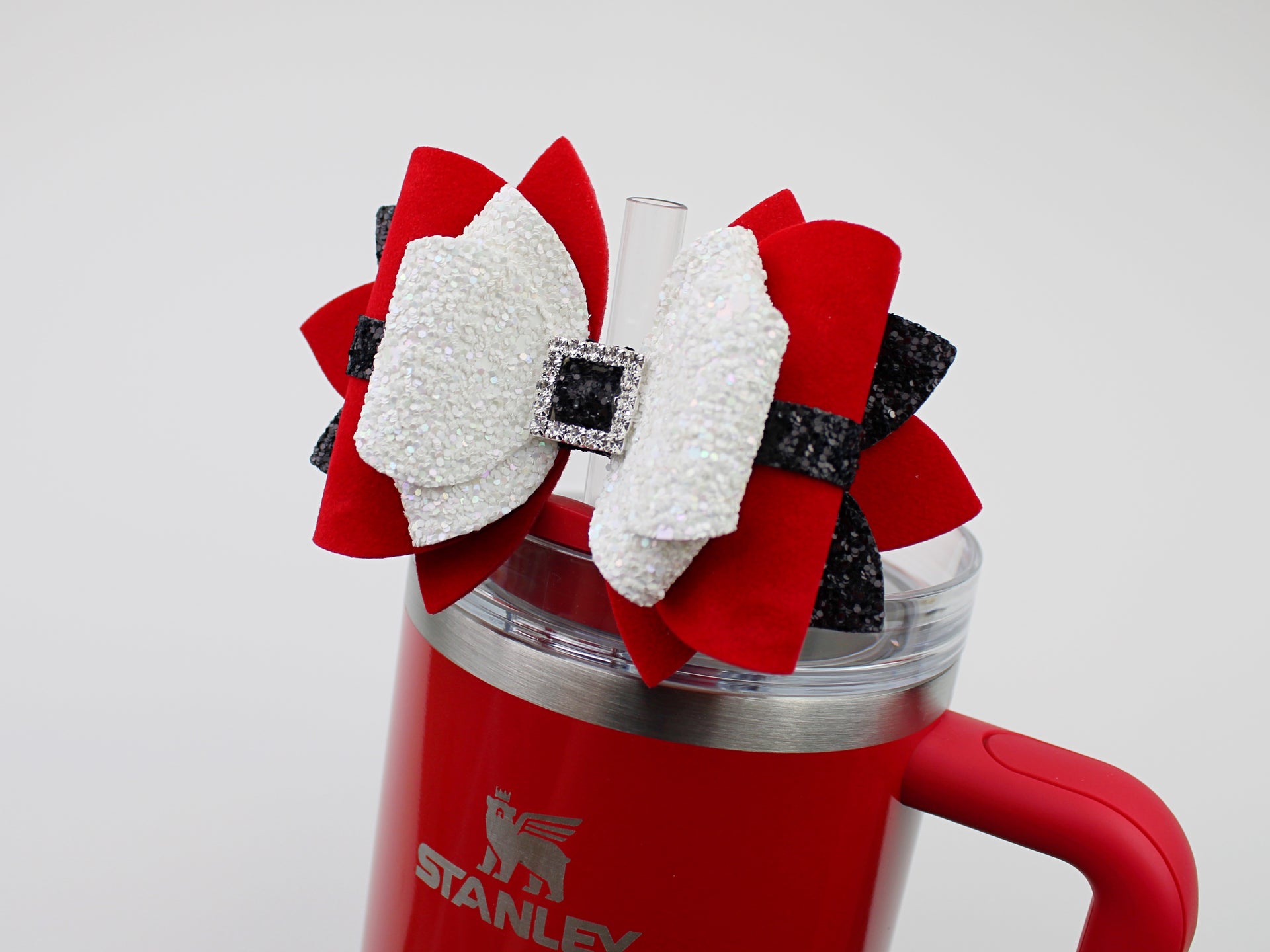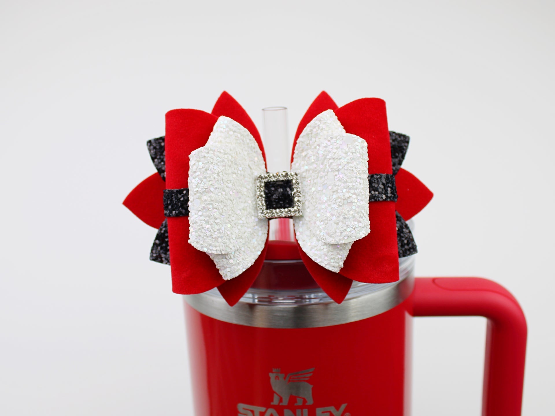 🎀 This Beautiful Bow is made out of faux leather, glitter fabric and designed to fit Stanley straws. Size: 4.5 inches. Each bow is handmade, ensuring a unique touch in every creation. 🎨 Due to screen variations, actual colors may slightly differ. 📦 This listing is for the bow only. Cup not included.Â