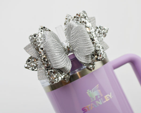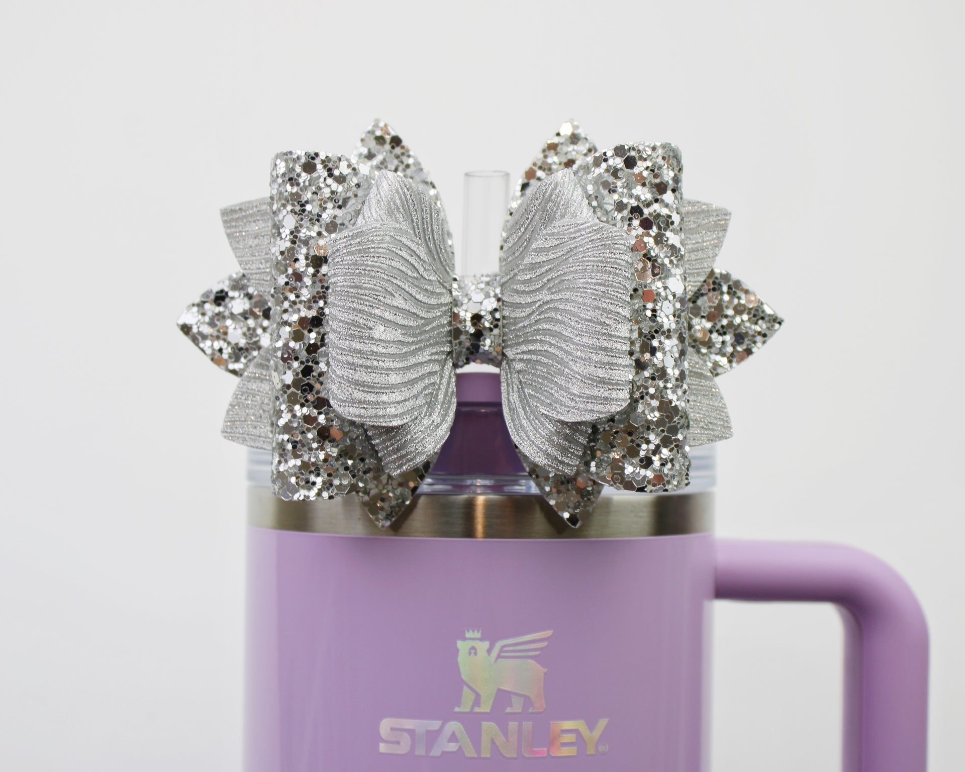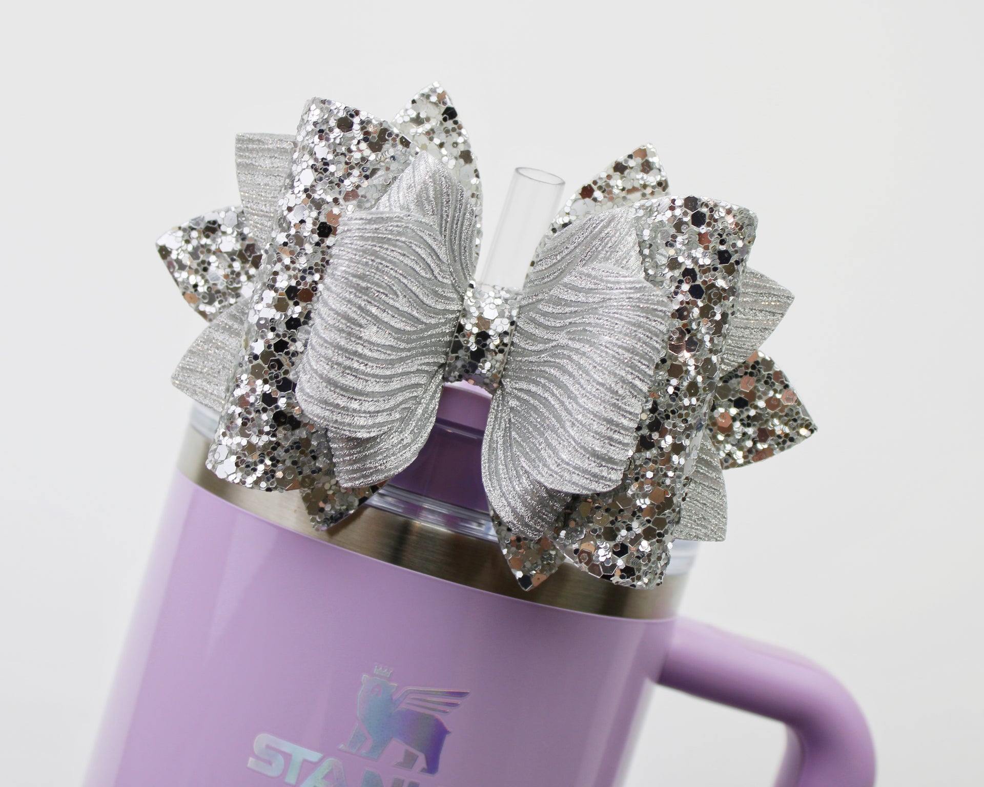 🎀 This Beautiful Bow is made out of faux leather, glitter fabric and designed to fit Stanley straws. Size: 4.5 inches. Each bow is handmade, ensuring a unique touch in every creation. 🎨 Due to screen variations, actual colors may slightly differ. 📦 This listing is for the bow only.