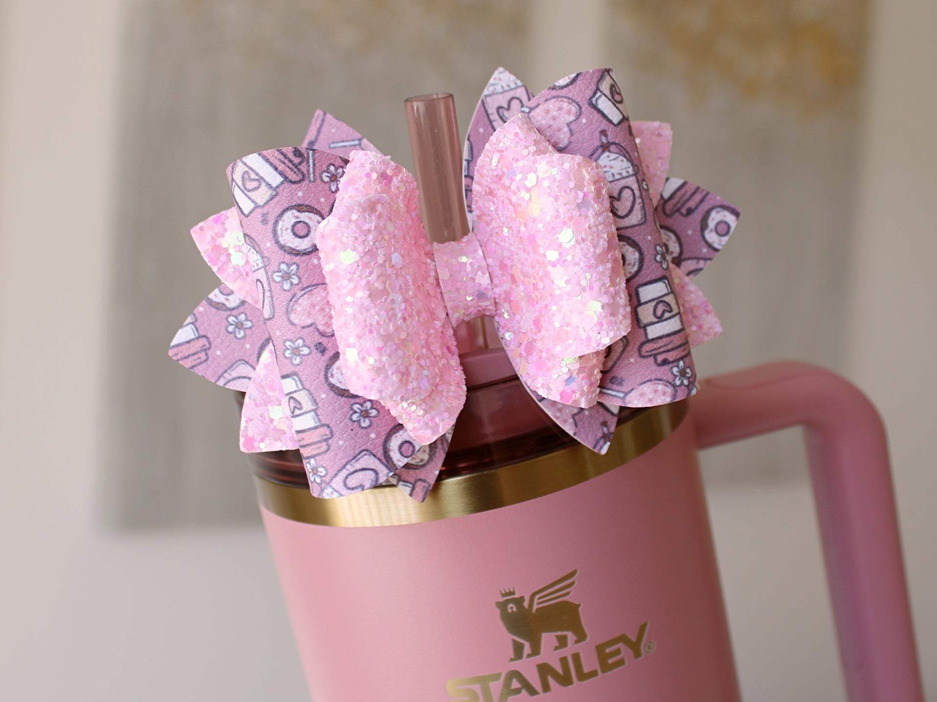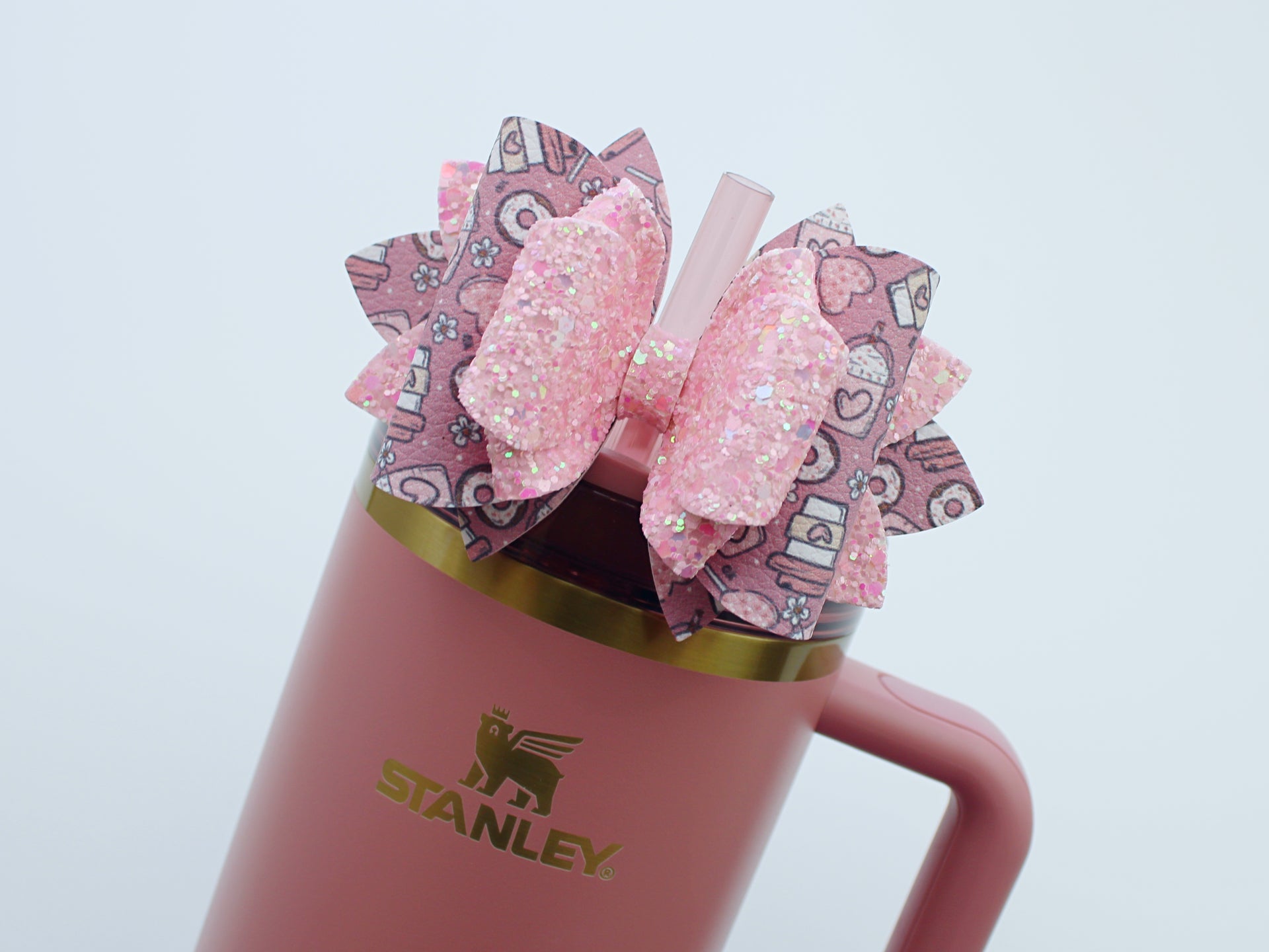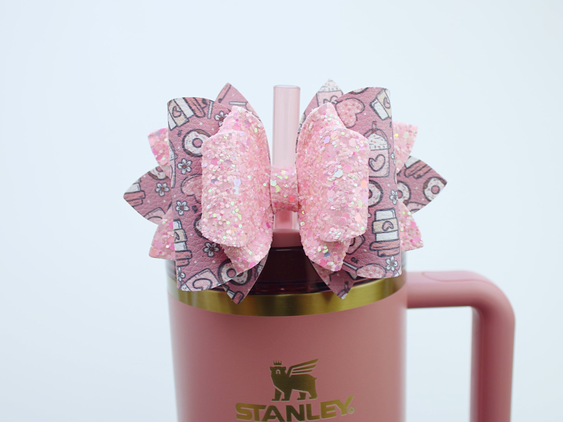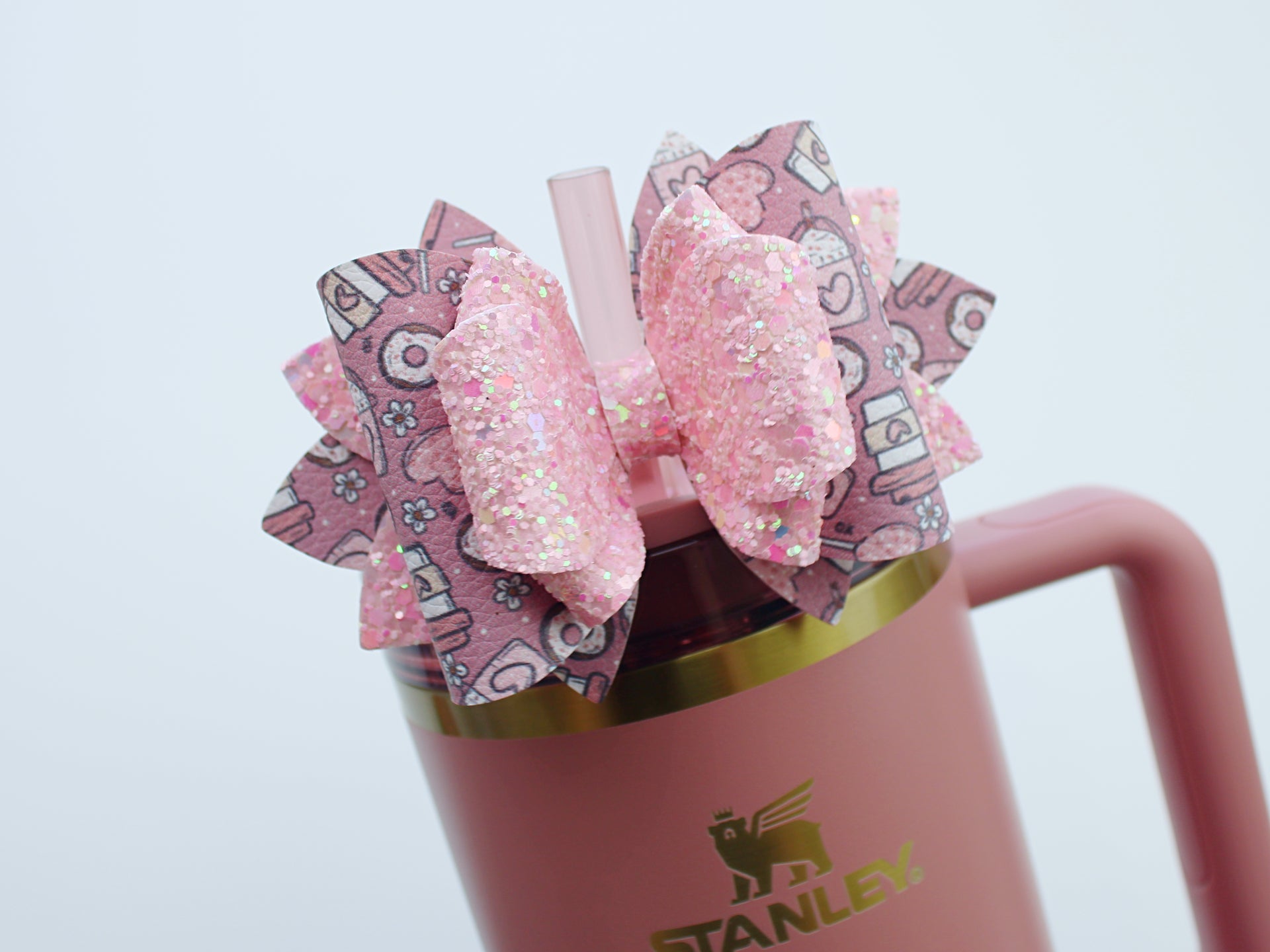 🎀 This Beautiful Bow is made out of faux leather, glitter fabric and designed to fit Stanley straws. Size: 4.5 inches. Each bow is handmade, ensuring a unique touch in every creation. 🎨 Due to screen variations, actual colors may slightly differ. 🎀 This listing is for the bow only.