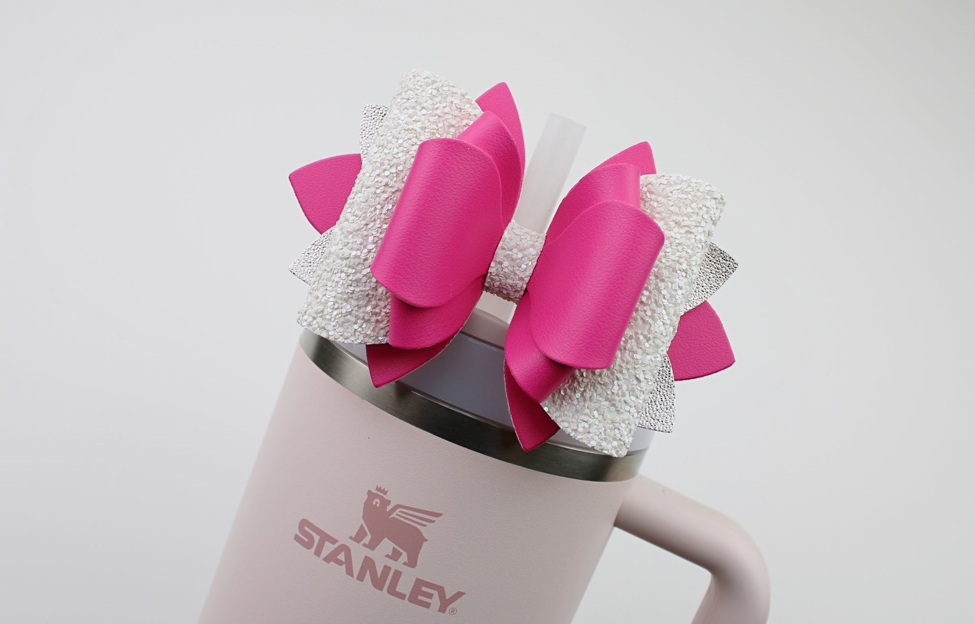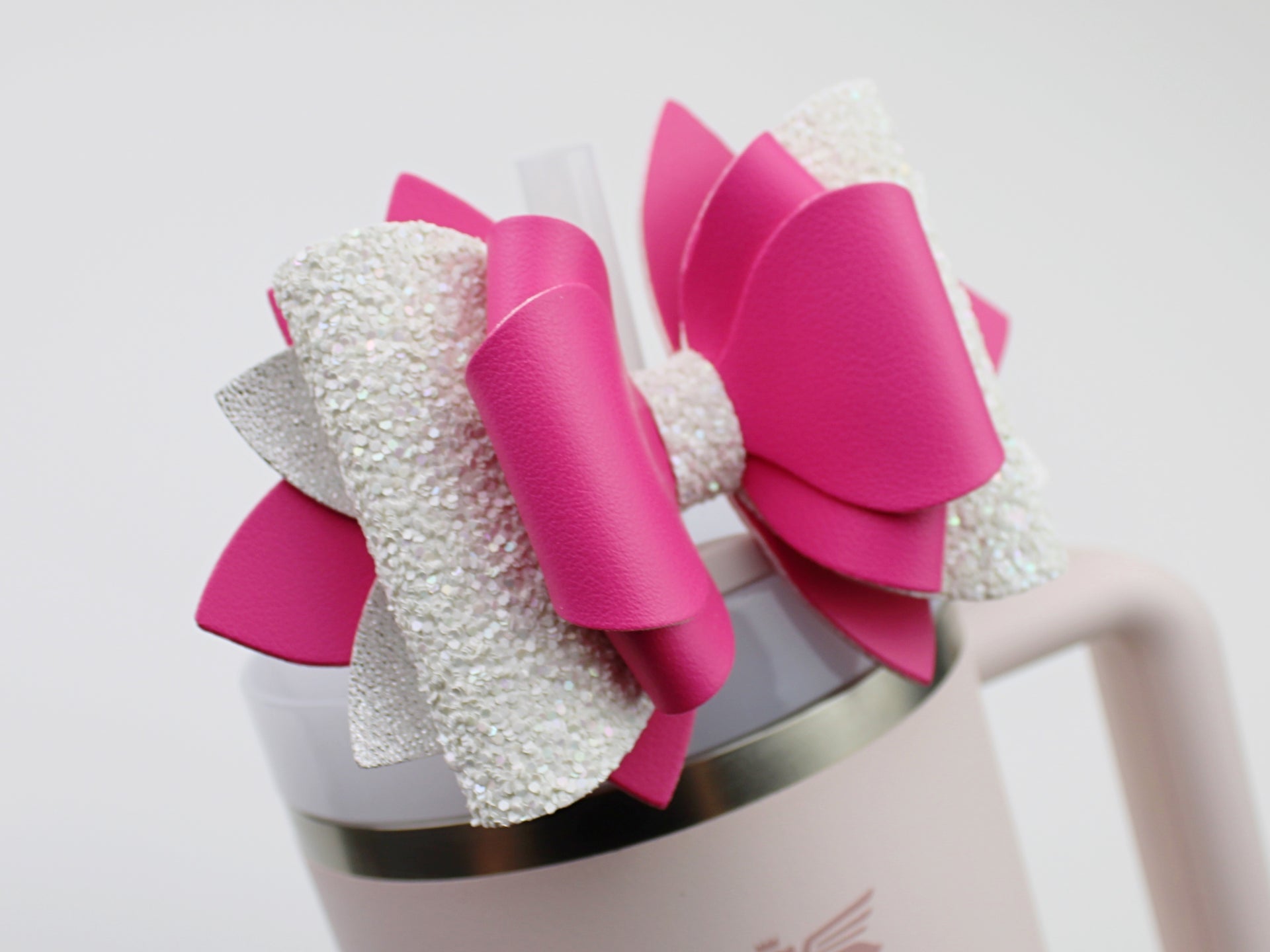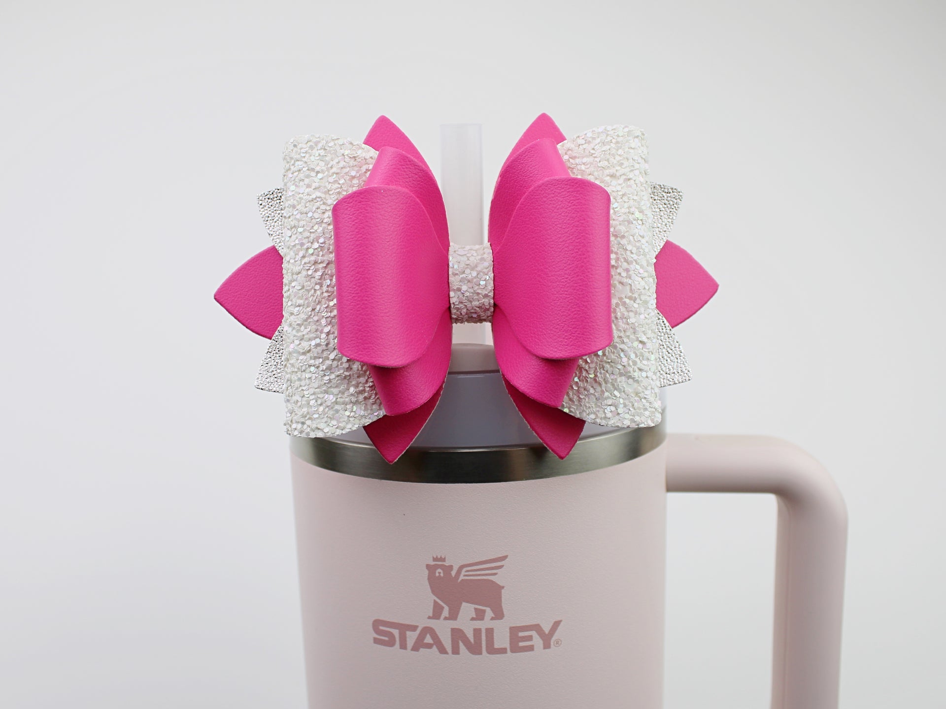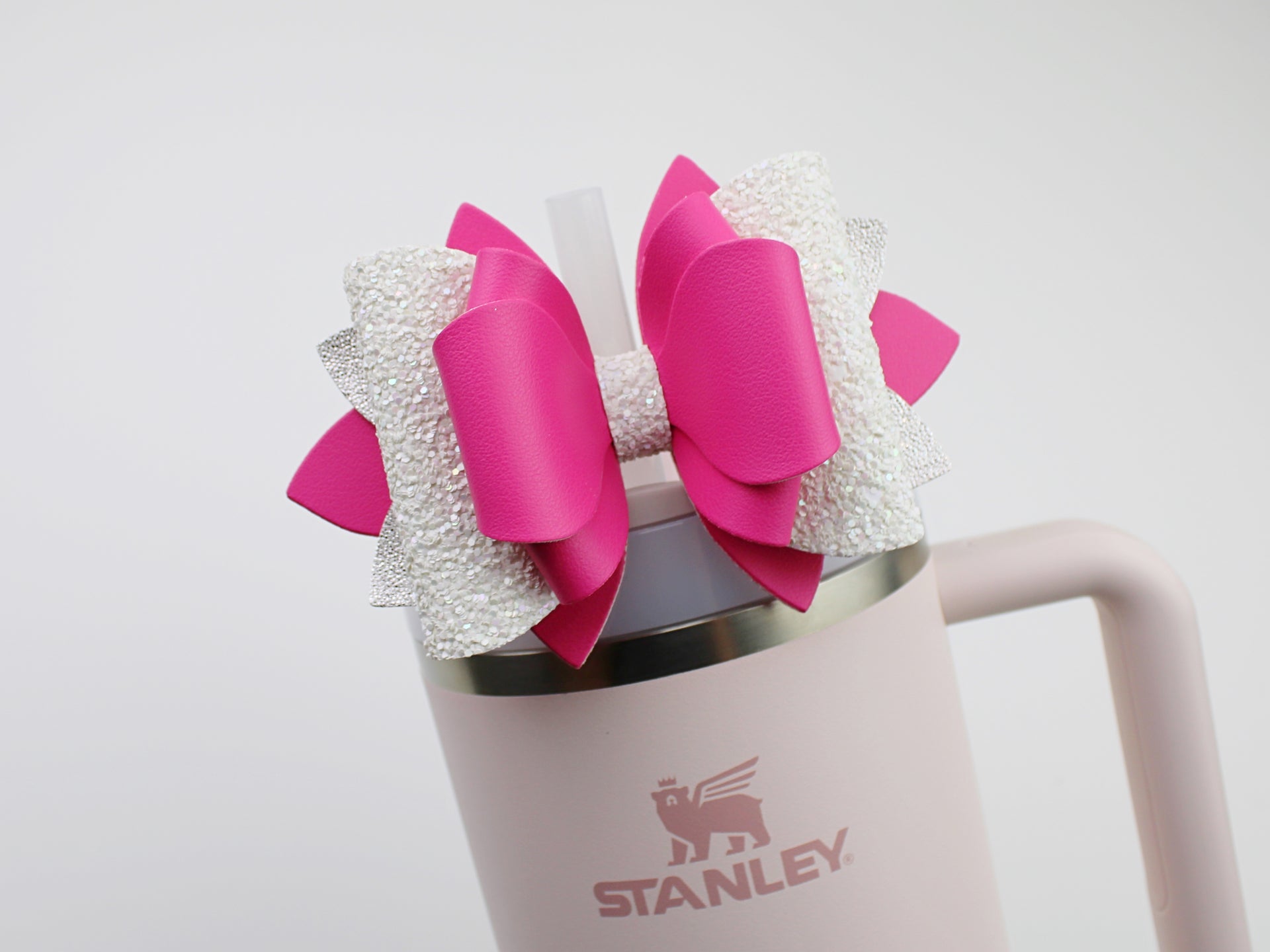 🎀 This Beautiful Bow is made out of faux leather, glitter fabric and designed to fit Stanley straws. Size: 4.5 inches. Each bow is handmade, ensuring a unique touch in every creation. 🎨 Due to screen variations, actual colors may slightly differ. 🎀 This listing is for the bow only.