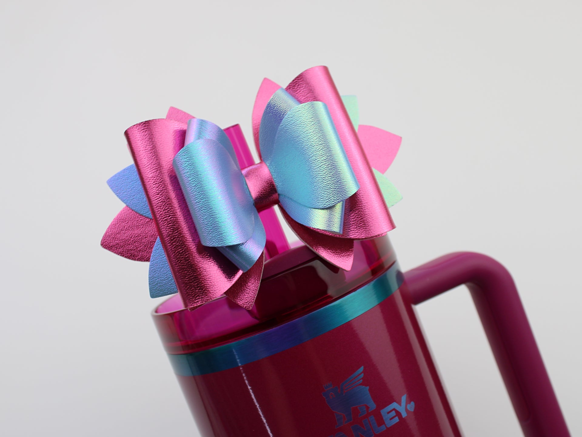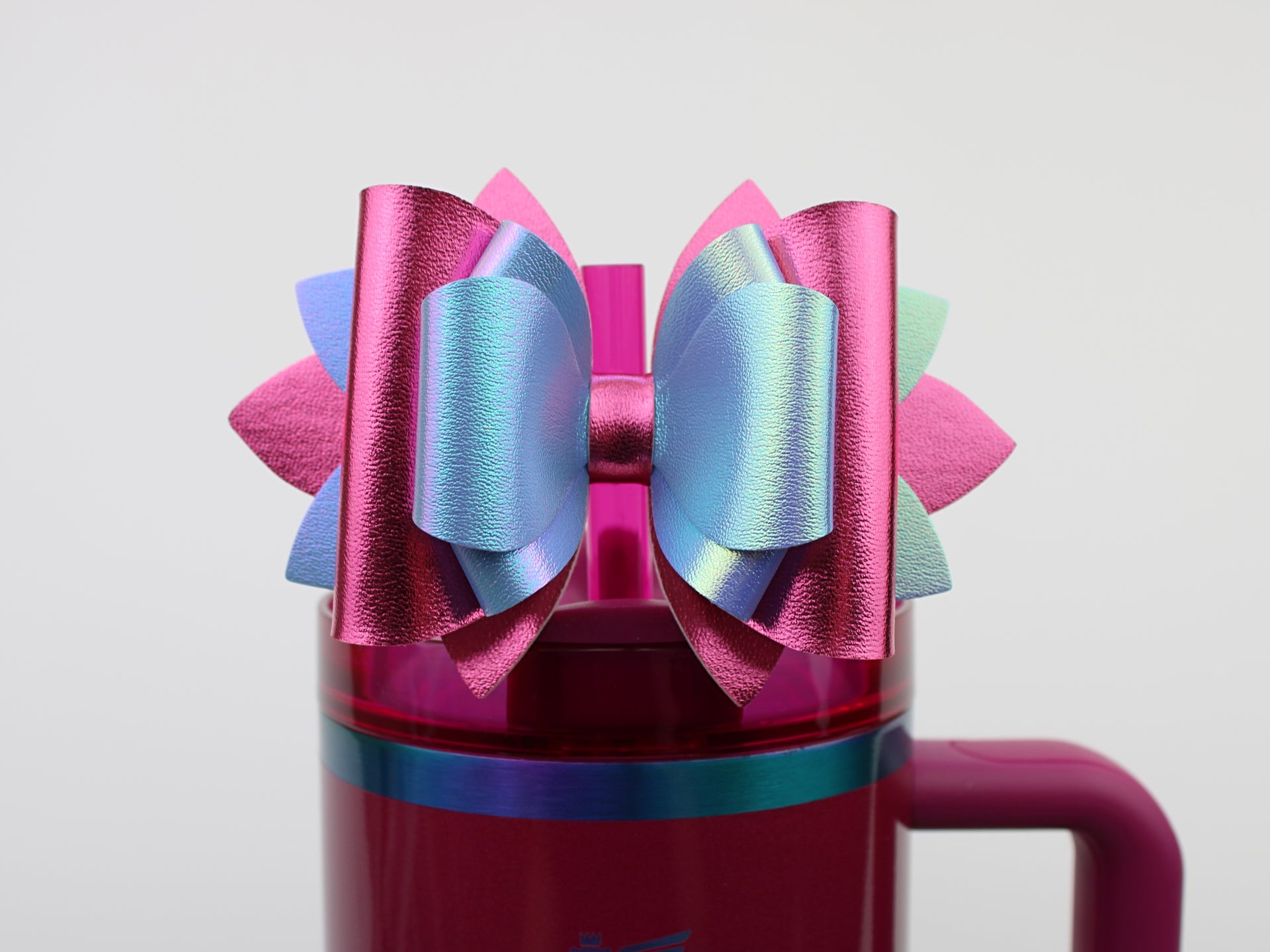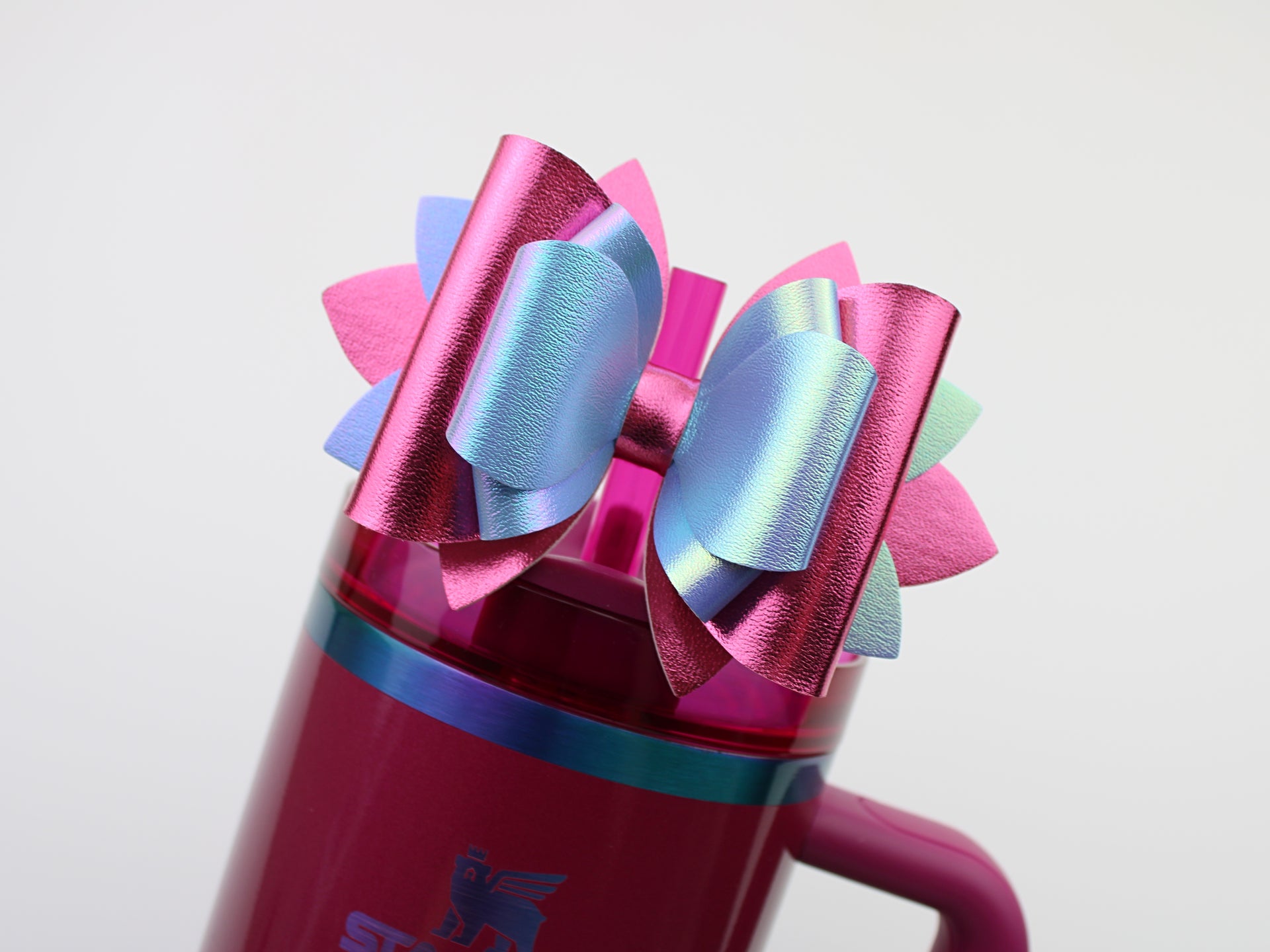 🎀 This Beautiful Bow is made out of faux leather, glitter fabric and designed to fit Stanley straws. Size: 4.5 inches. Each bow is handmade, ensuring a unique touch in every creation. 🎨 Due to screen variations, actual colors may slightly differ. 🎀 This listing is for the bow only.