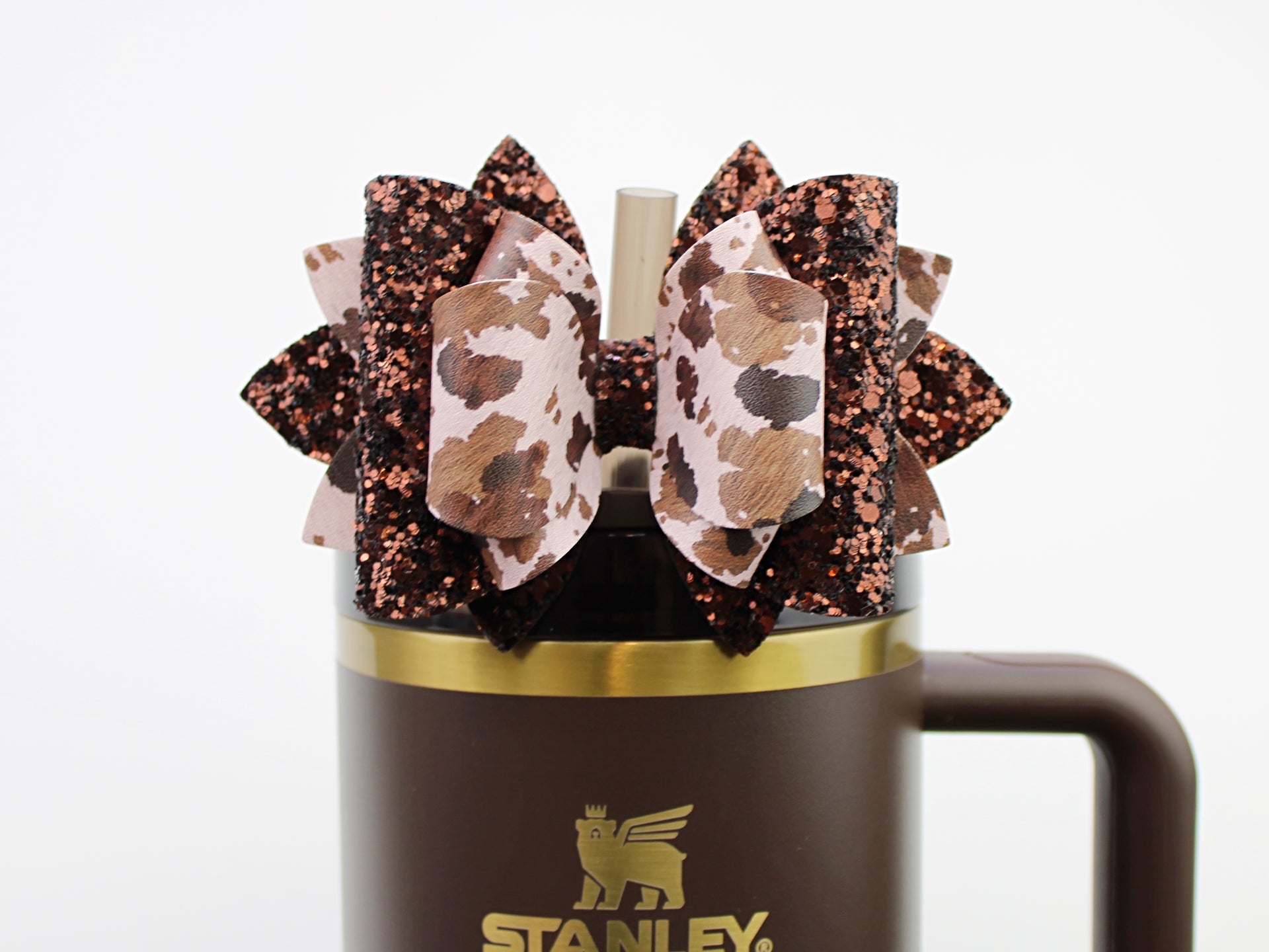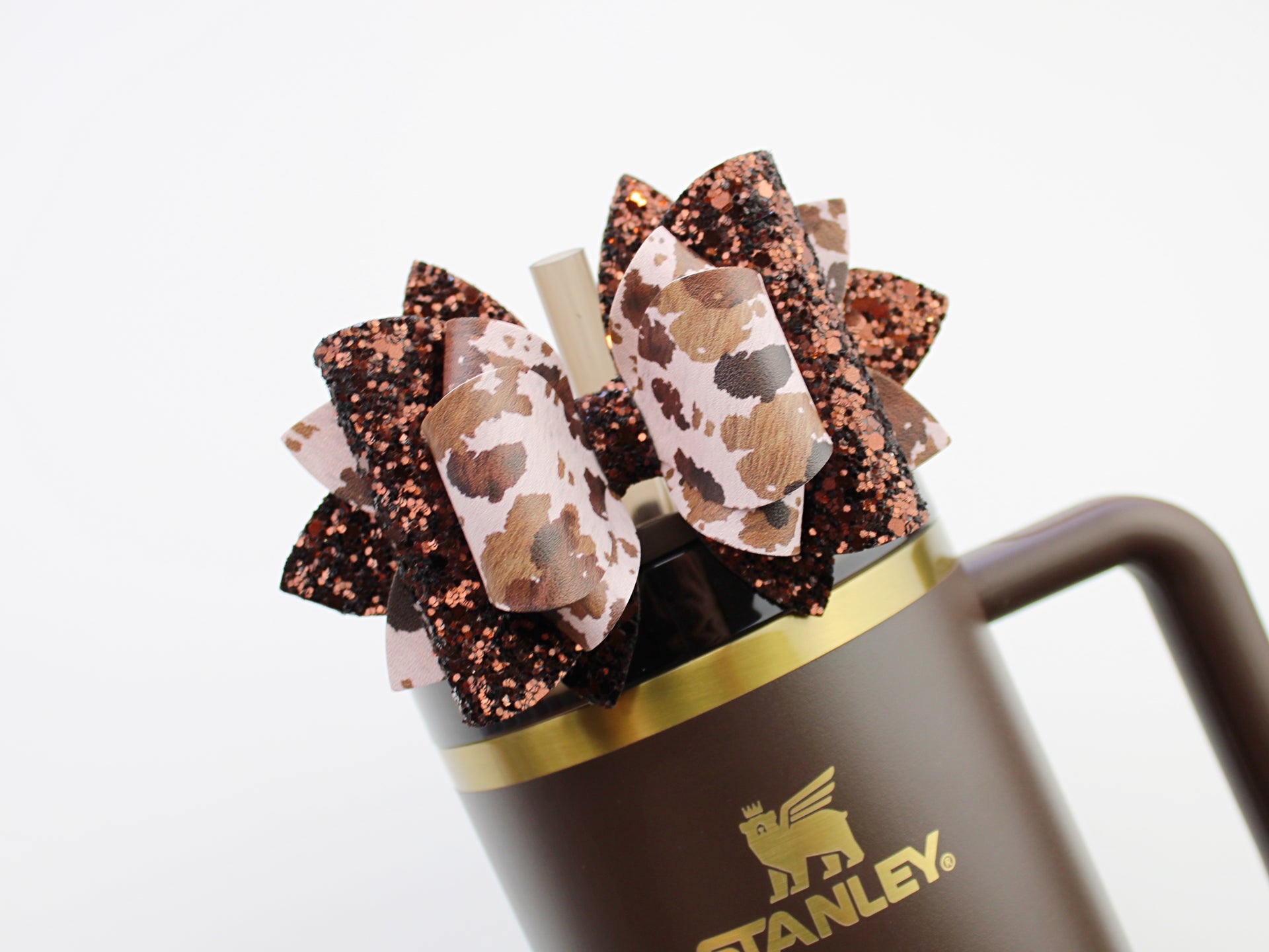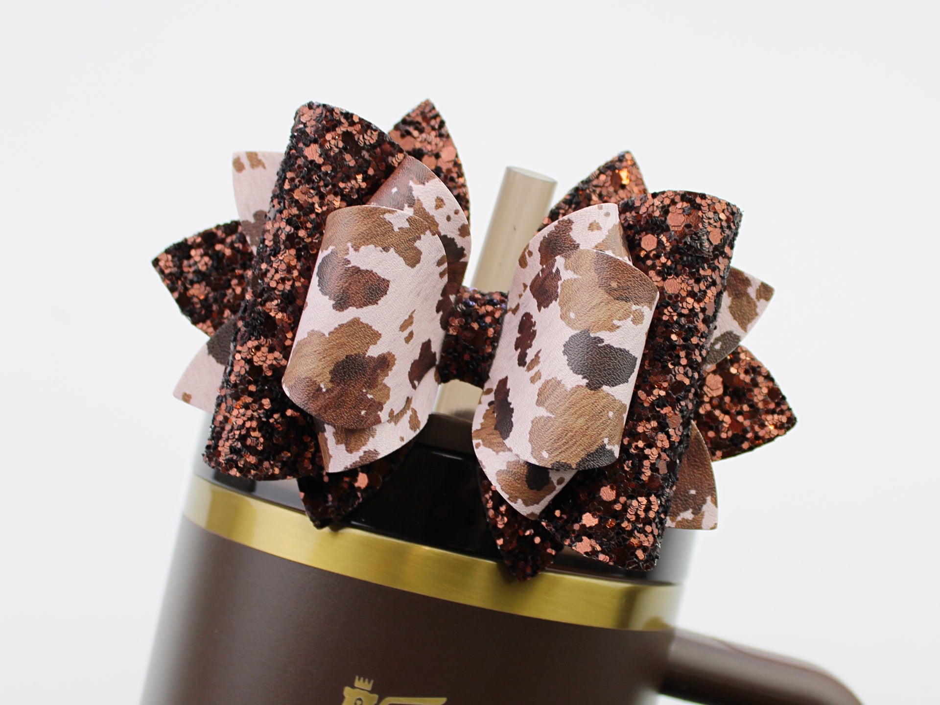 🎀 This Beautiful Bow is made out of faux leather, glitter fabric and designed to fit Stanley straws. Size: 4.5 inches. Each bow is handmade, ensuring a unique touch in every creation. 🎨 Due to screen variations, actual colors may slightly differ. 📦 This listing is for the bow only.