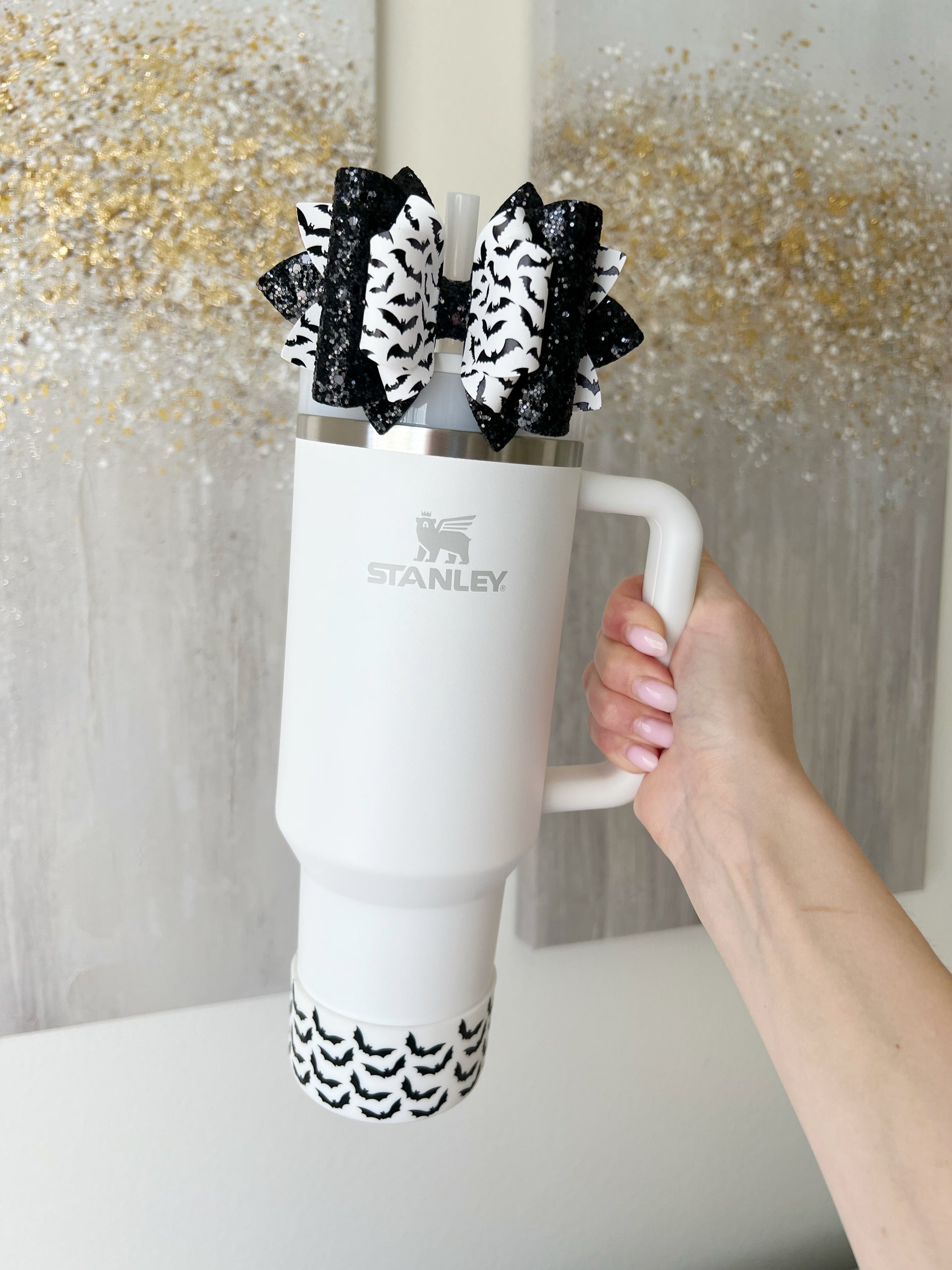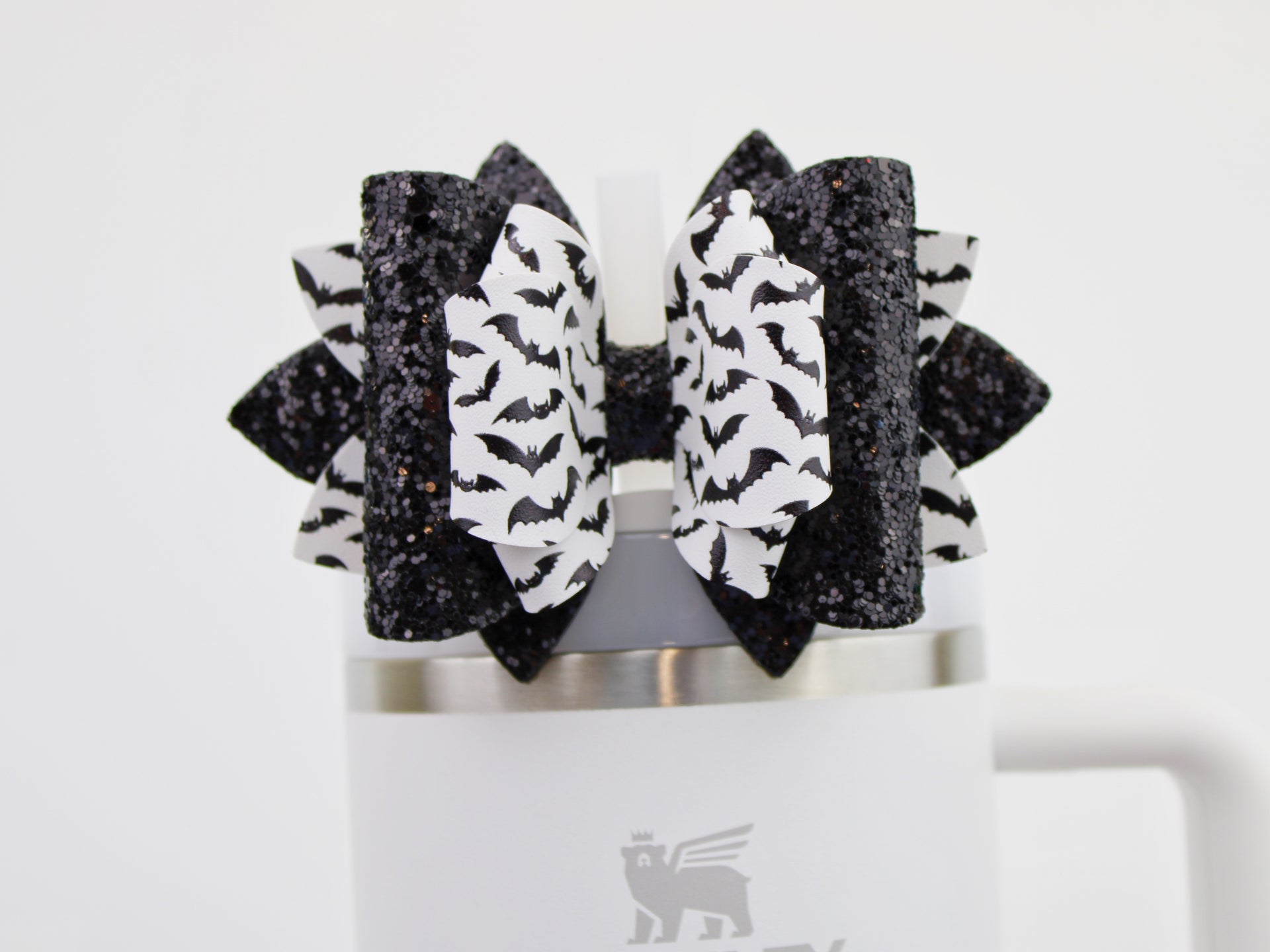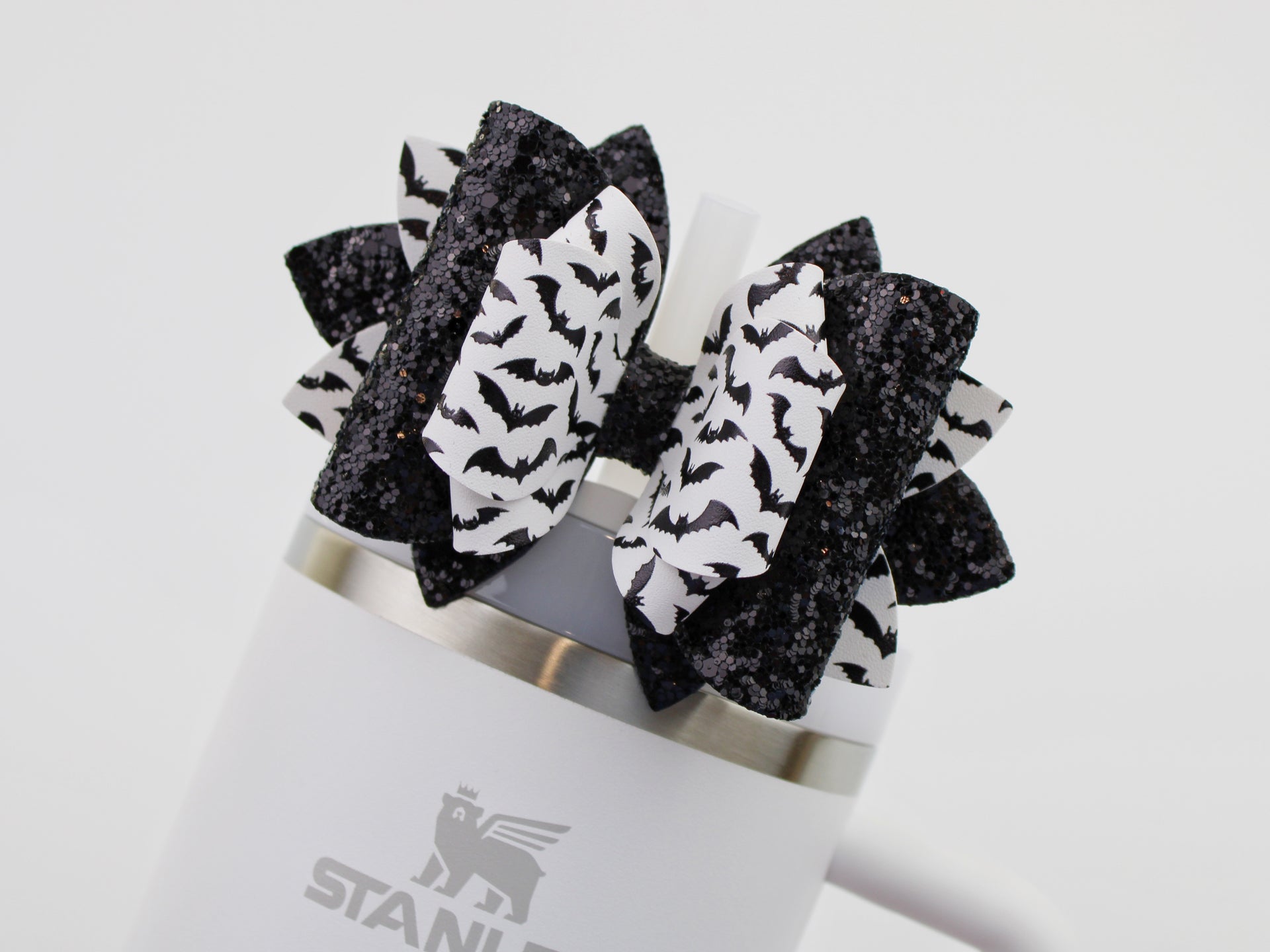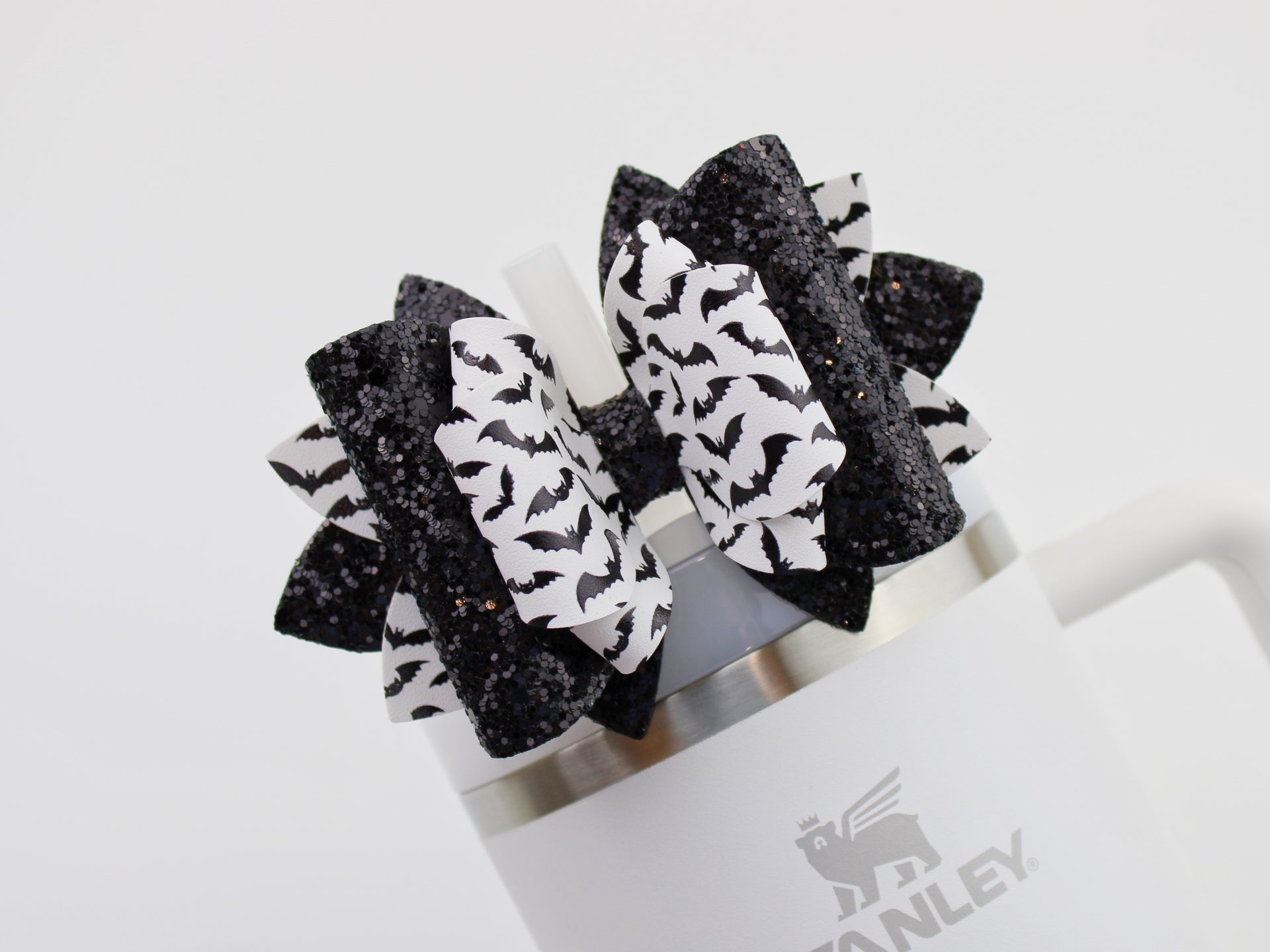 🎀 This Beautiful Bow is made out of faux leather, glitter fabric and designed to fit Stanley straws. Size: 4.5 inches. Each bow is handmade, ensuring a unique touch in every creation. 🎨 Due to screen variations, actual colors may slightly differ. 📦 This listing is for the bow only.