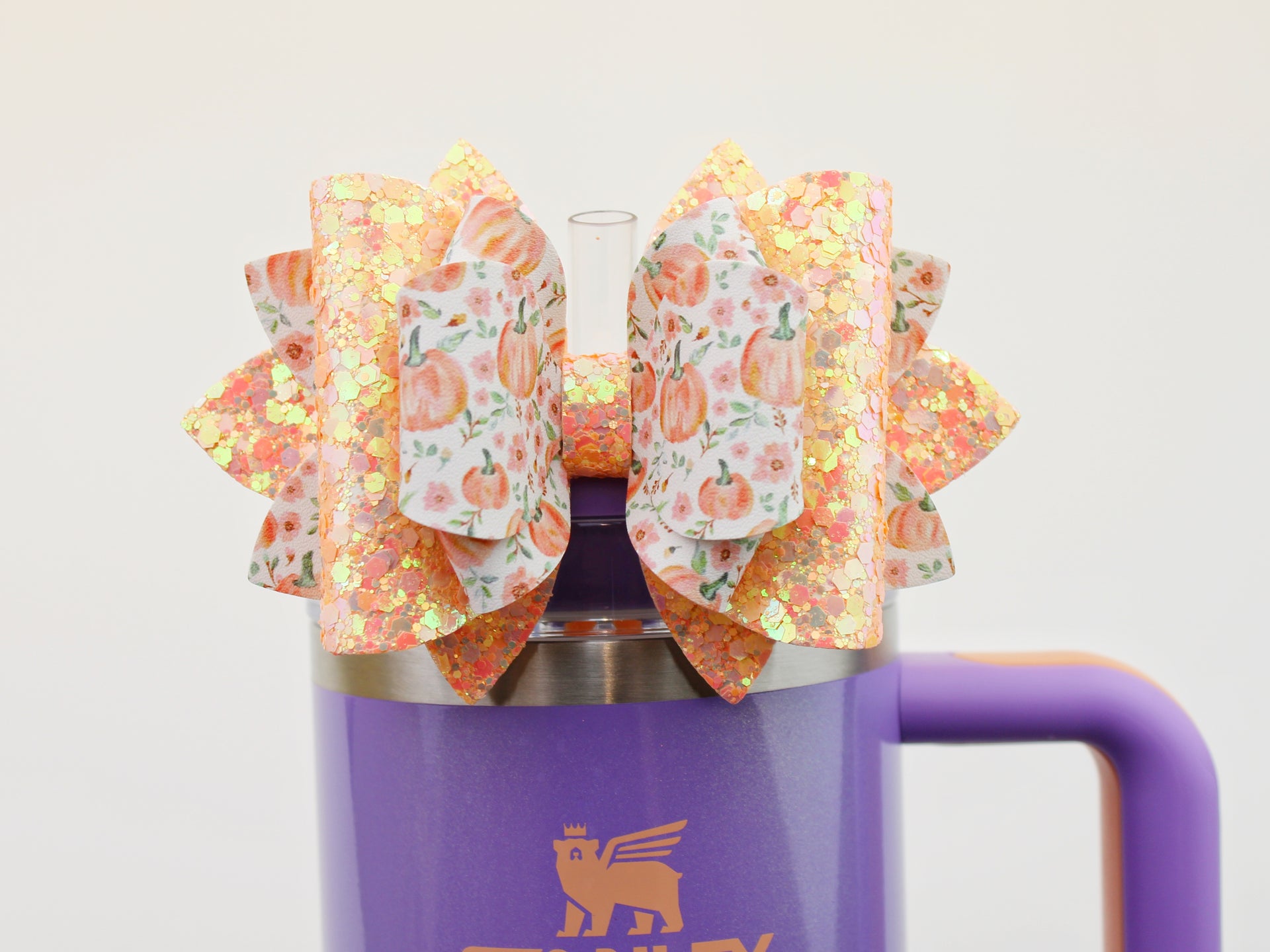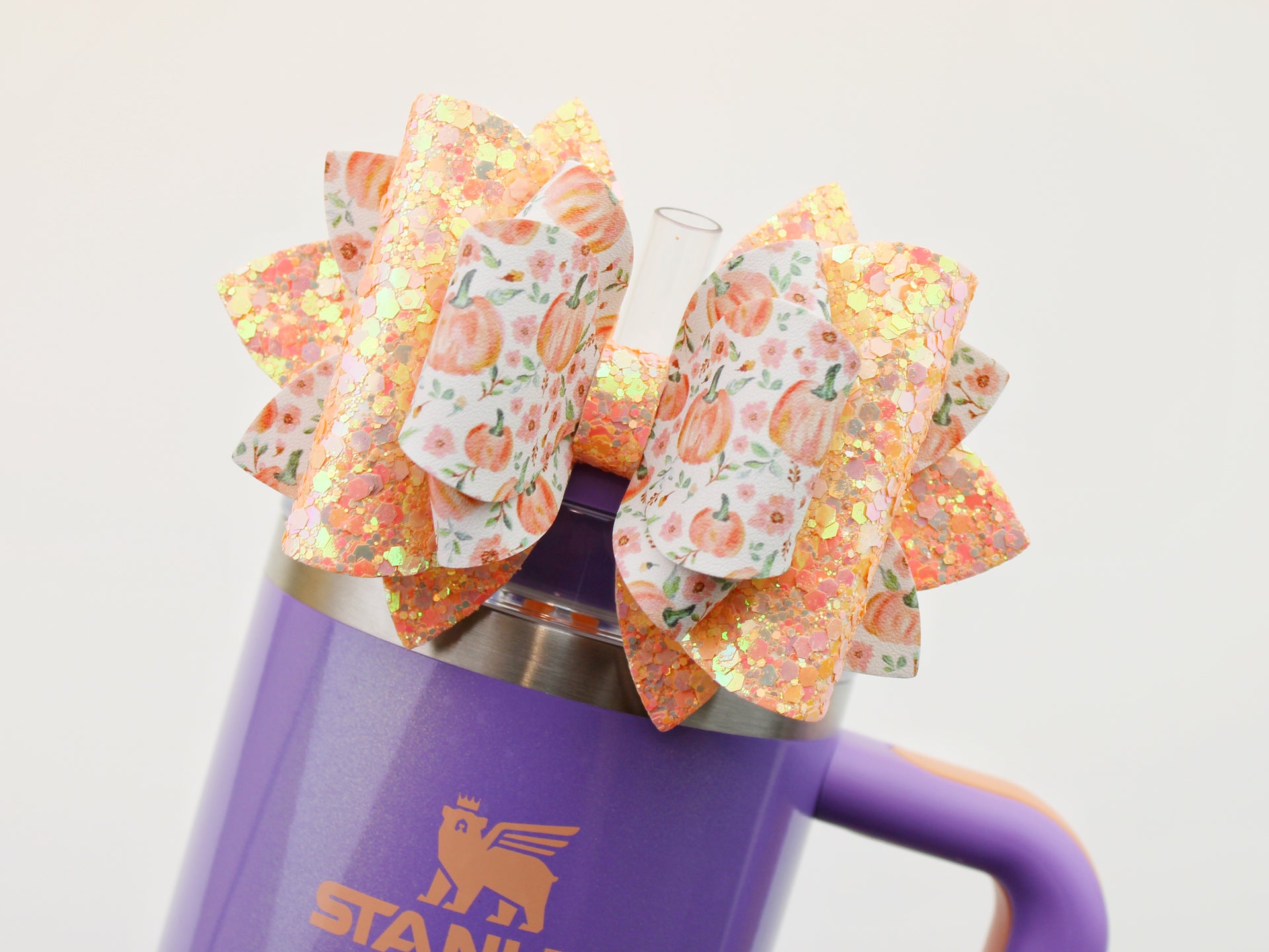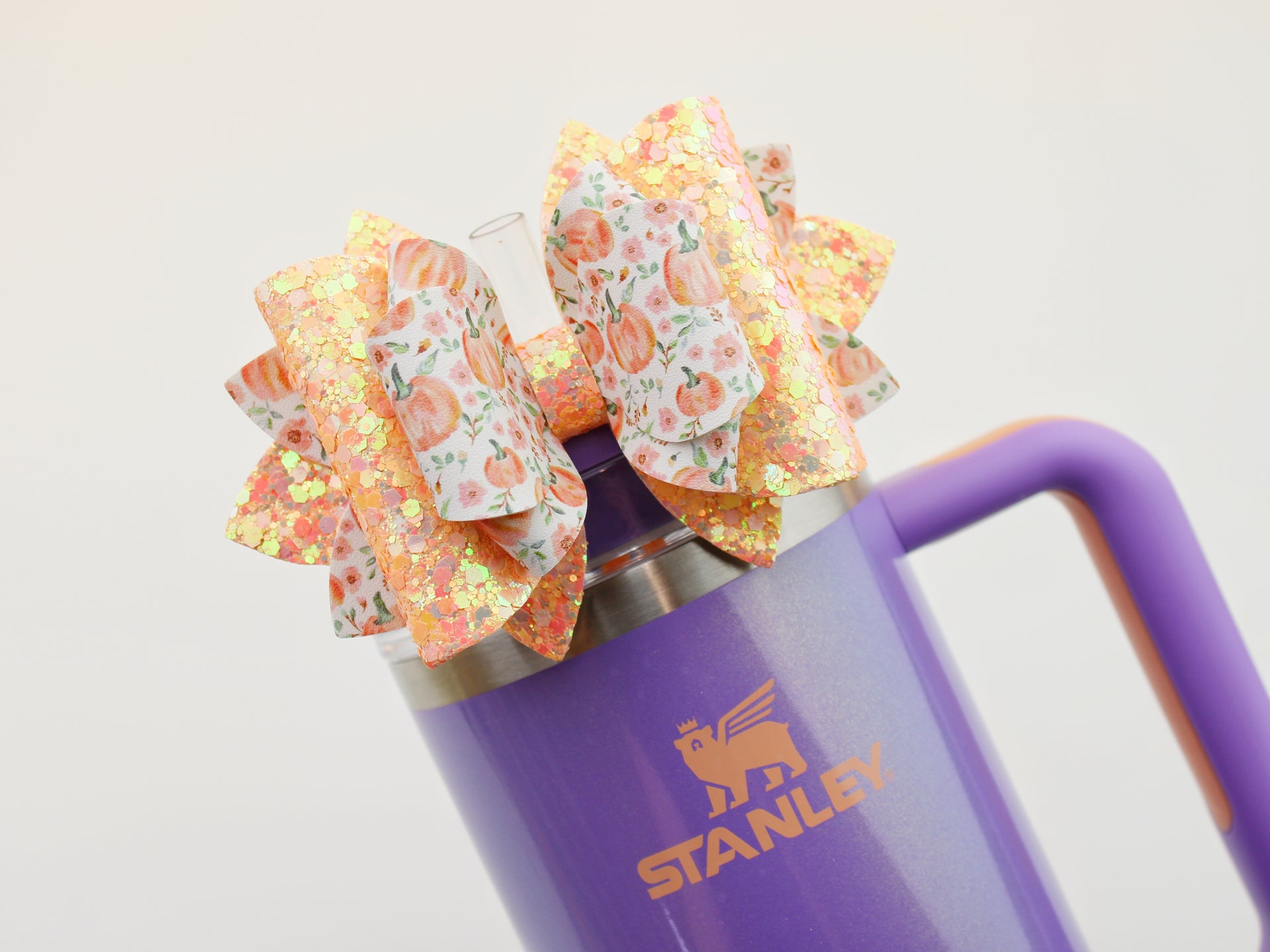 🎀 This Beautiful Bow is made out of faux leather, glitter fabric and designed to fit Stanley straws. Size: 4.5 inches. Each bow is handmade, ensuring a unique touch in every creation. 🎨 Due to screen variations, actual colors may slightly differ. 📦 This listing is for the bow only.