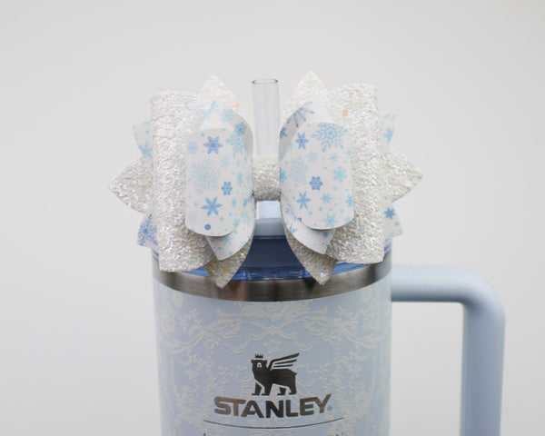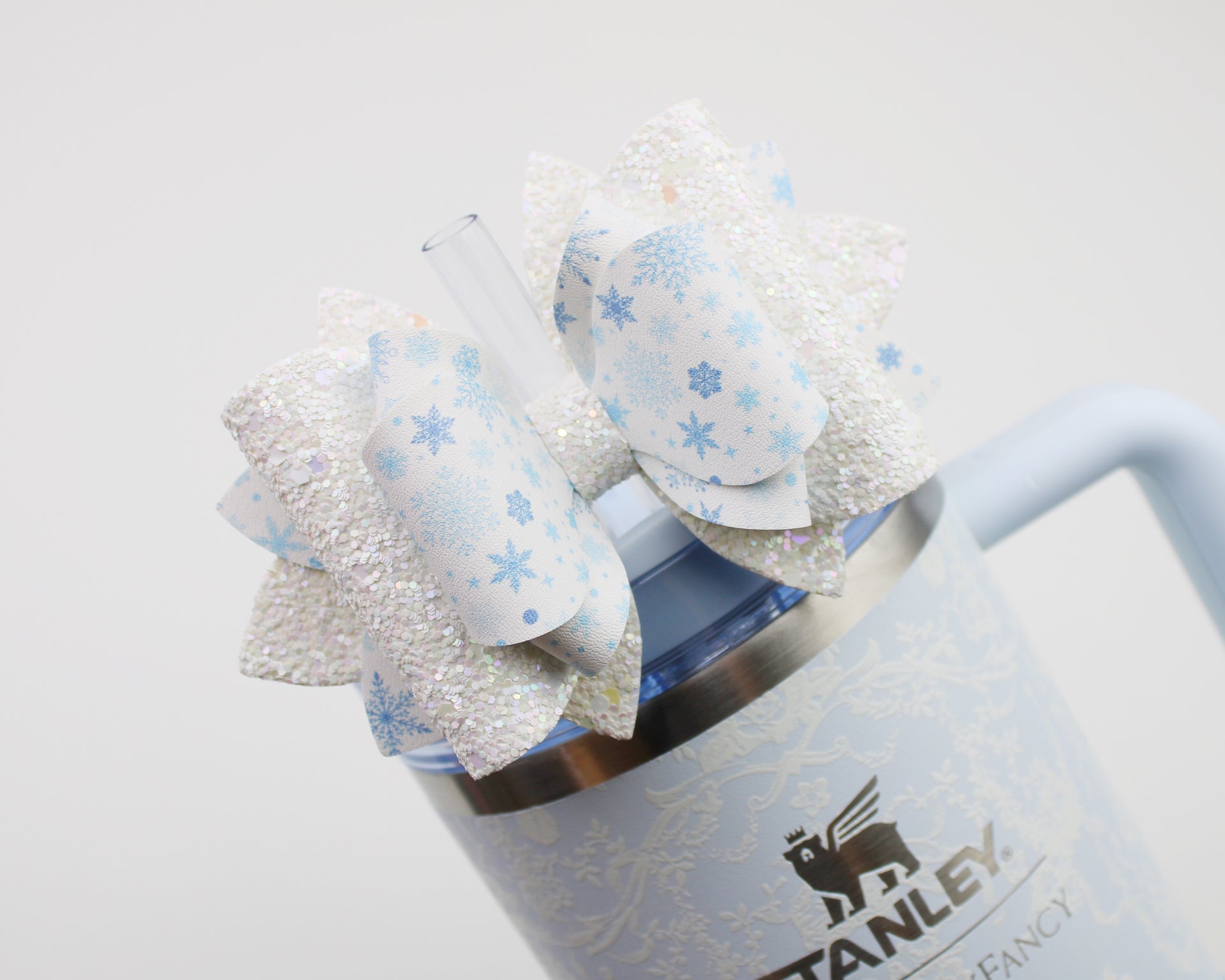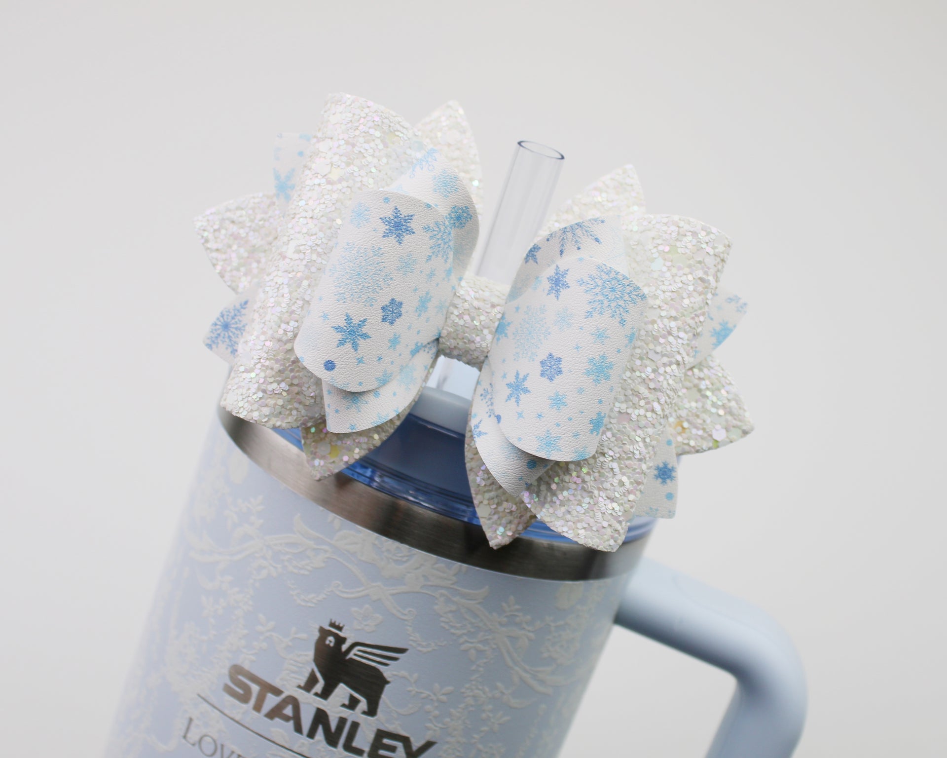 🎀 This Beautiful Bow is made out of faux leather, glitter fabric and designed to fit Stanley straws. Size: 4.5 inches. Each bow is handmade, ensuring a unique touch in every creation. 🎨 Due to screen variations, actual colors may slightly differ. 📦 This listing is for the bow only.