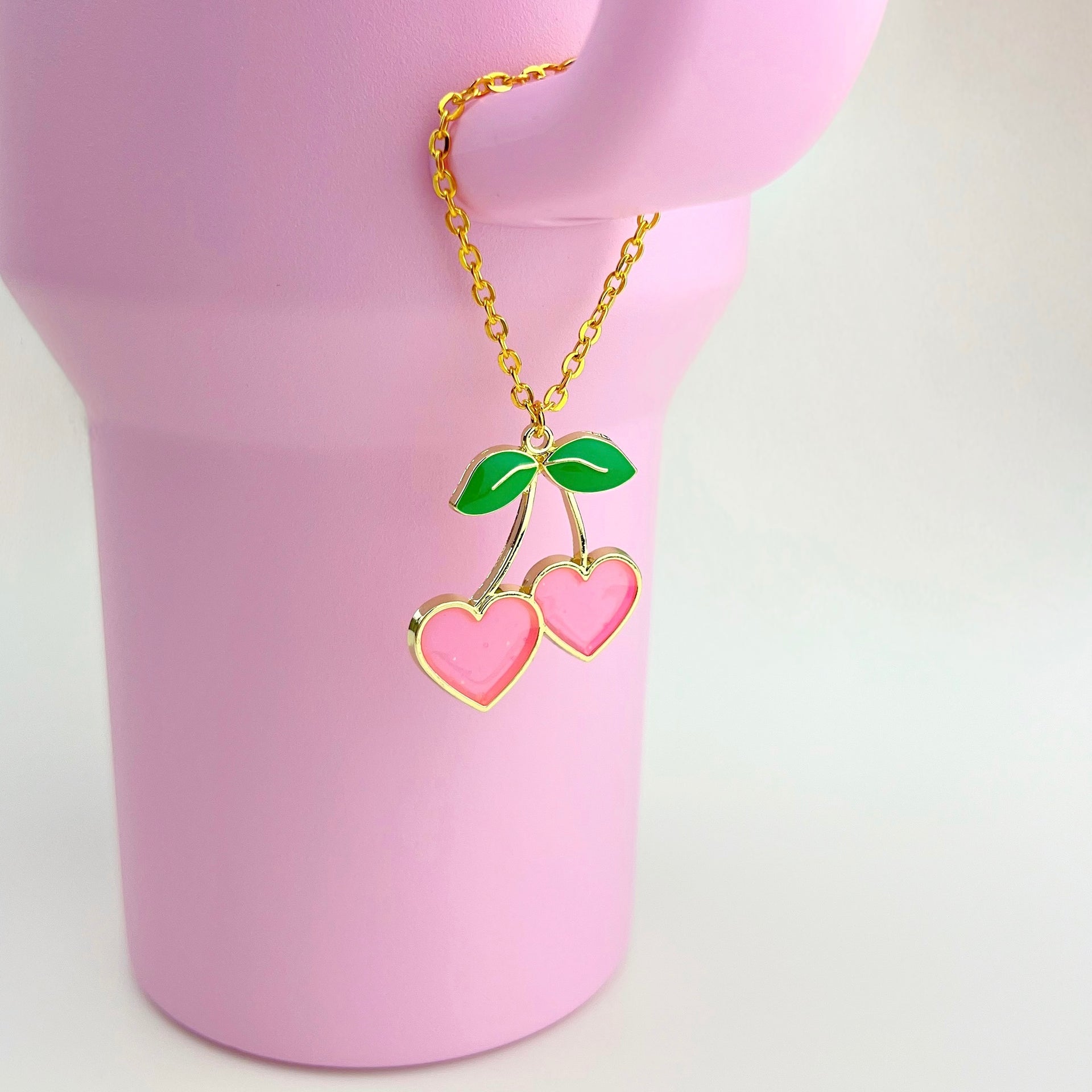Cherry Hearts Tumbler Charm ✨ Enamel cherry hearts charm with gold finishes. ✨ Gold chain with an easy-to-use lobster clasp. ✨ Fits any tumbler or water bottle with a handle. ⚠️ Care Tip: Remove the charm before washing the tumbler to maintain shine.