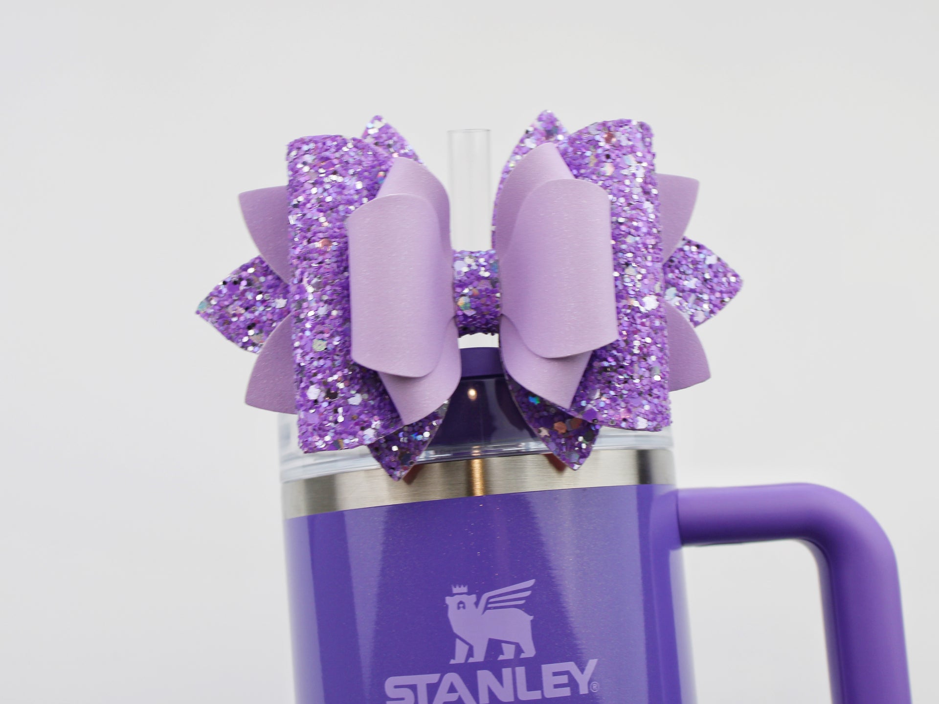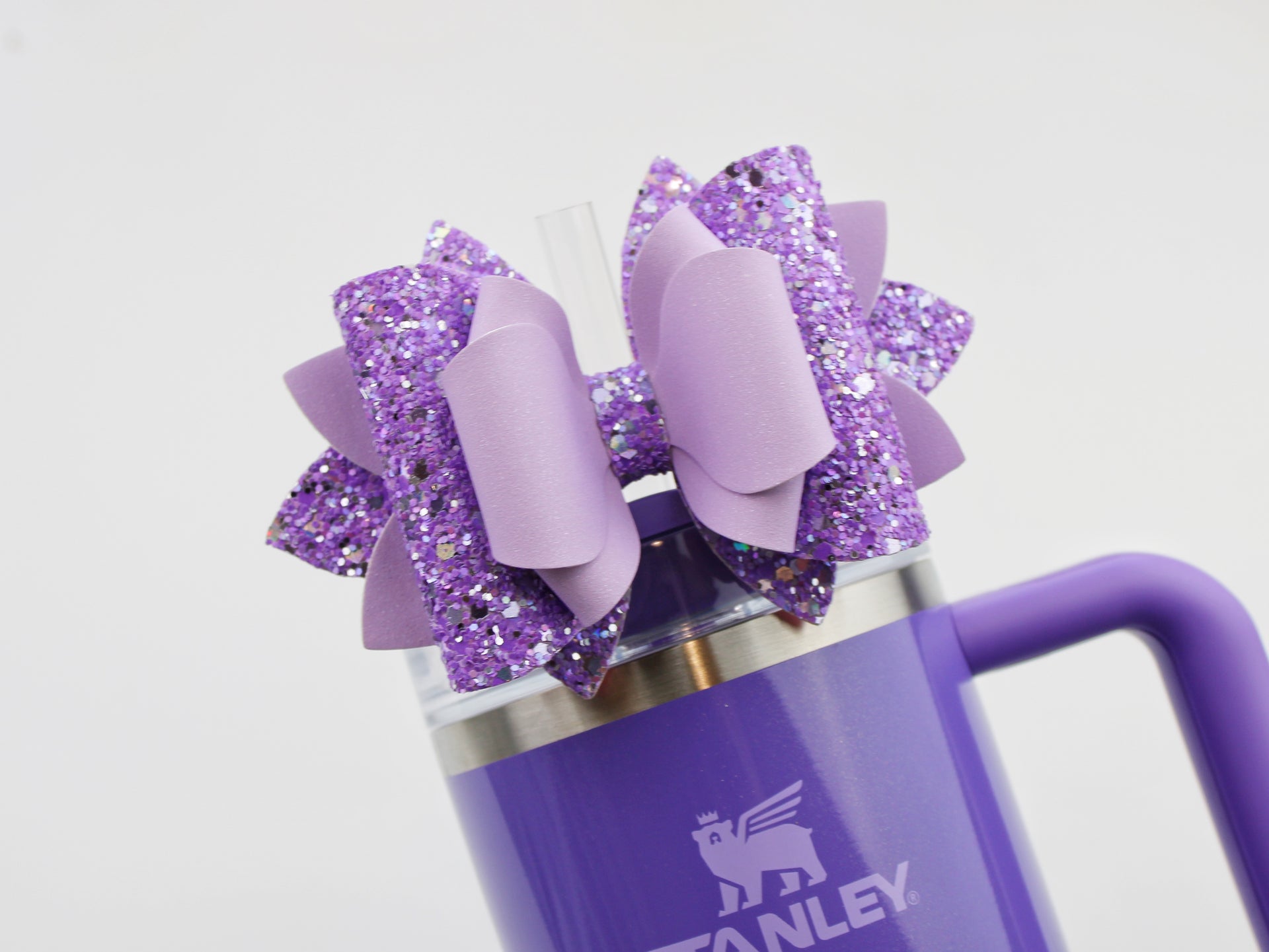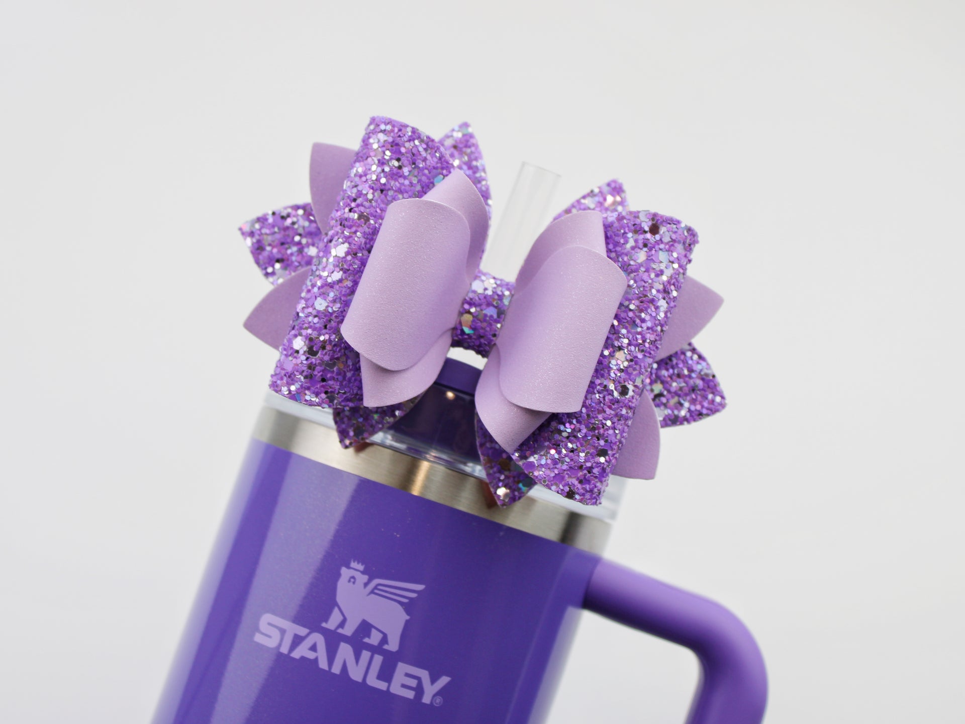 🎀 This Beautiful Bow is made out of faux leather, glitter fabric and designed to fit Stanley straws. Size: 4.5 inches. Each bow is handmade, ensuring a unique touch in every creation. 🎨 Due to screen variations, actual colors may slightly differ. 📦 This listing is for the bow only.