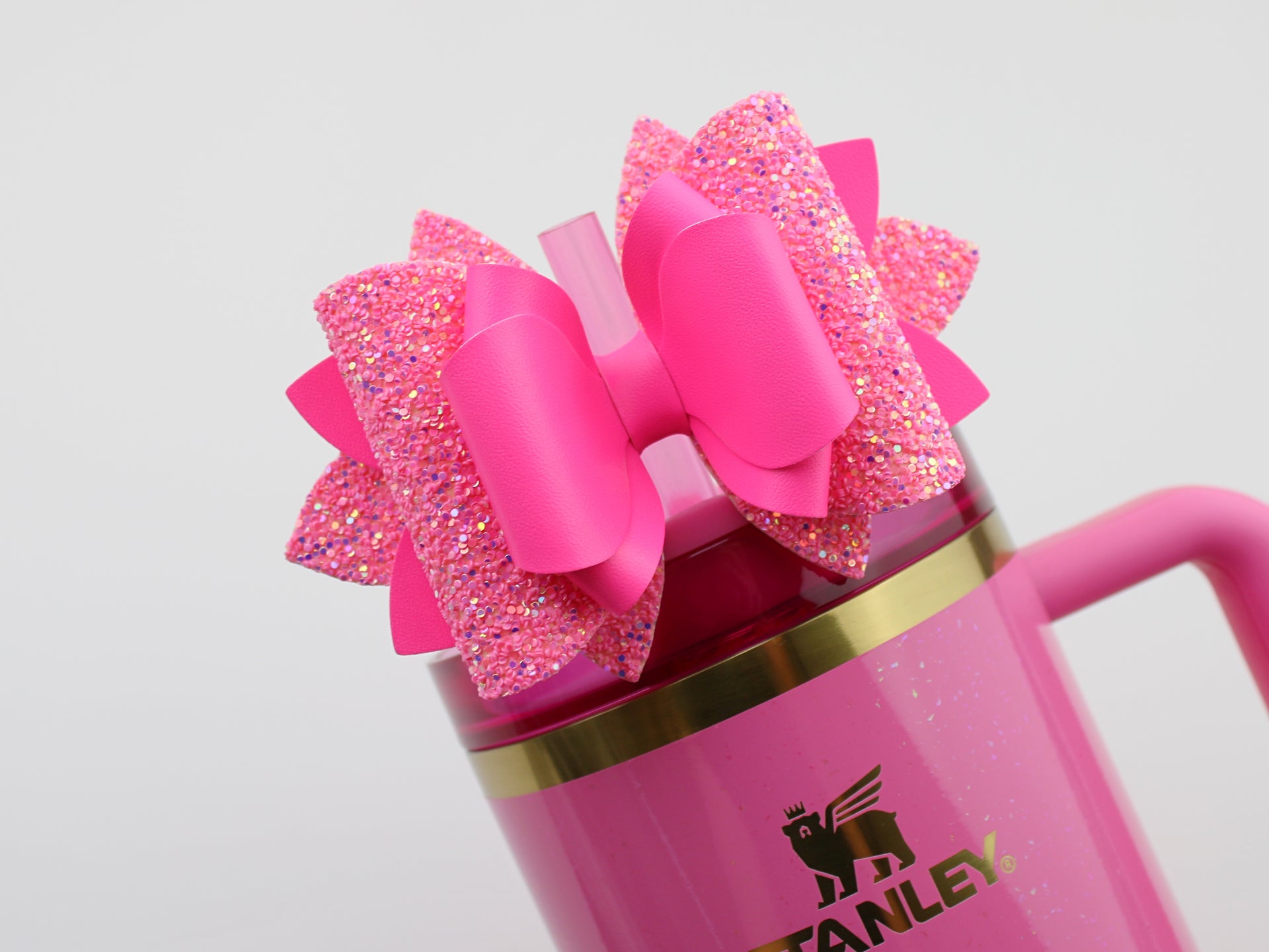 🎀 This Beautiful Bow is made out of faux leather, glitter fabric and designed to fit Stanley straws. Size: 4.5 inches. Each bow is handmade, ensuring a unique touch in every creation. 🎨 Due to screen variations, actual colors may slightly differ. 📦 This listing is for the bow only.