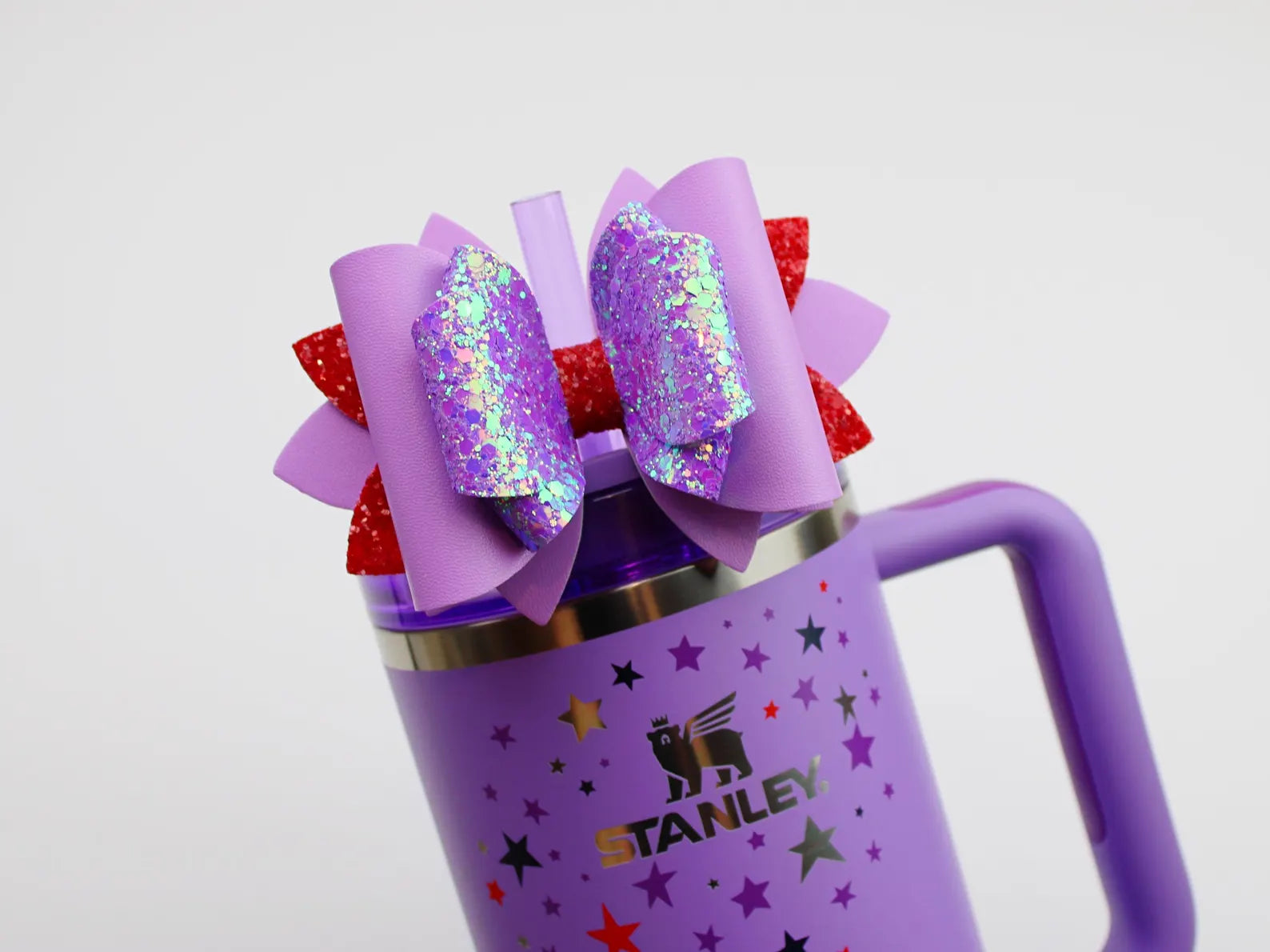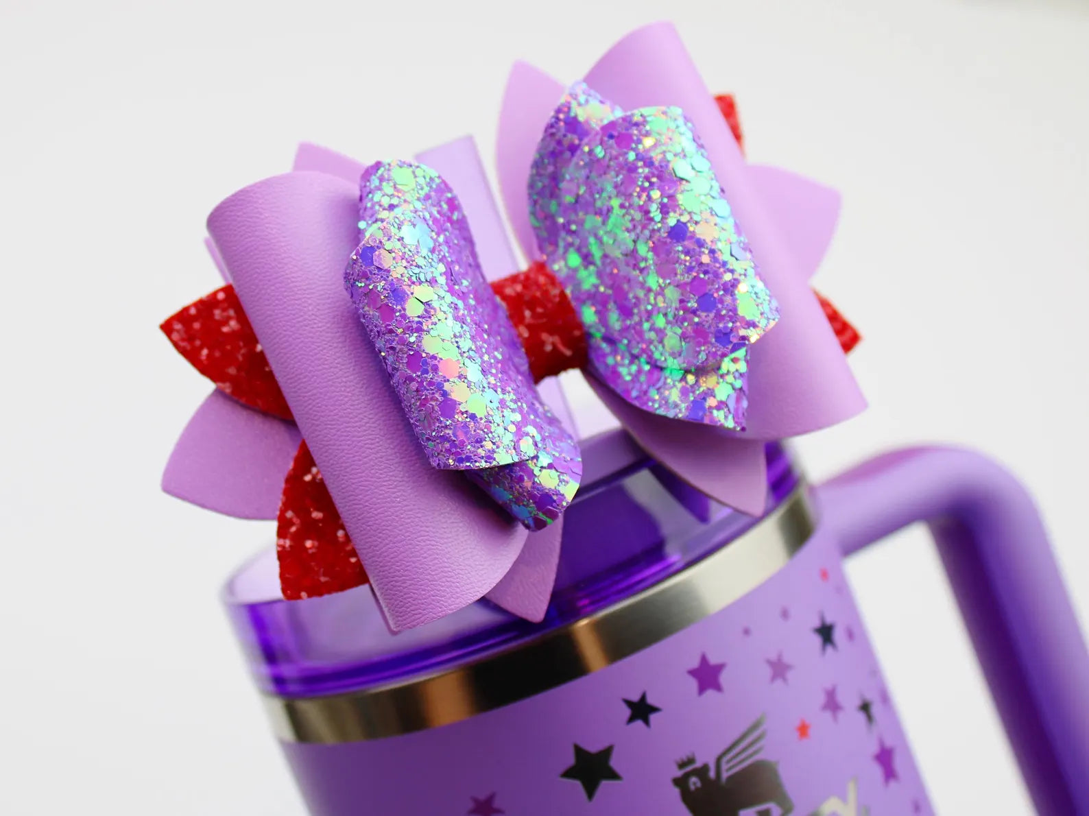 🎀 This Beautiful Bow is made out of faux leather, glitter fabric and designed to fit Stanley straws. Size: 4.5 inches. Each bow is handmade, ensuring a unique touch in every creation.  🎨 Due to screen variations, actual colors may slightly differ. 📦 This listing is for the bow only.