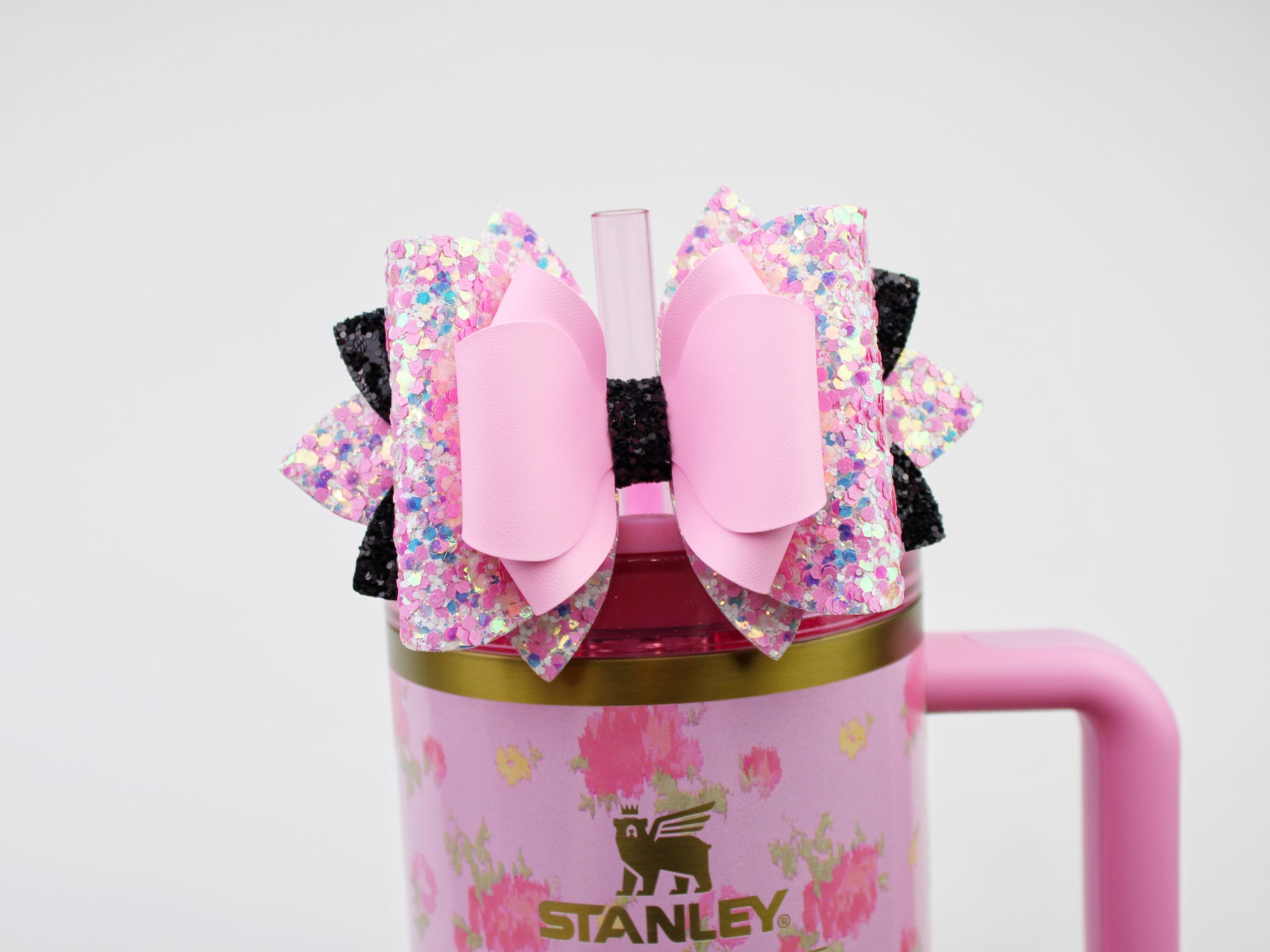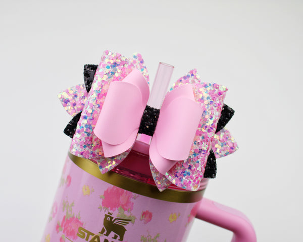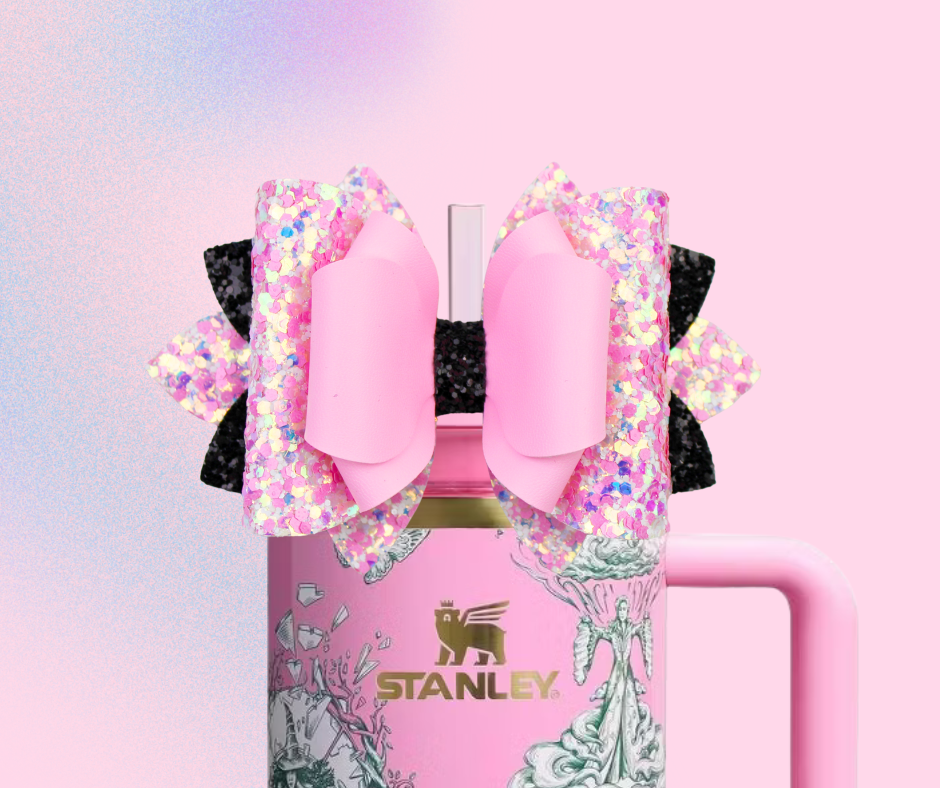 🎀 This Beautiful Bow is made out of faux leather, glitter fabric and designed to fit Stanley straws. Size: 4.5 inches. Each bow is handmade, ensuring a unique touch in every creation. 🎨 Due to screen variations, actual colors may slightly differ. 📦 This listing is for the bow only.
