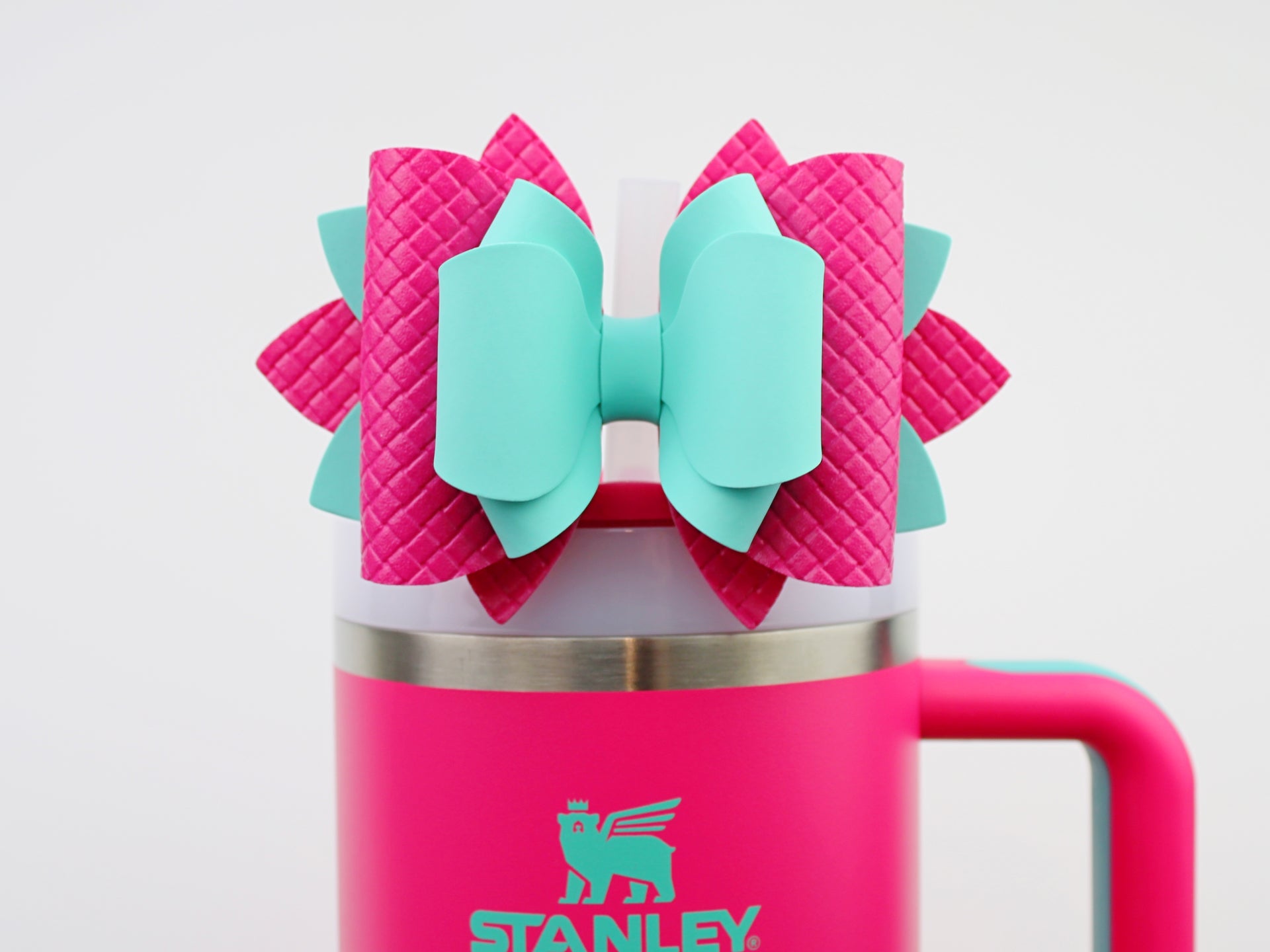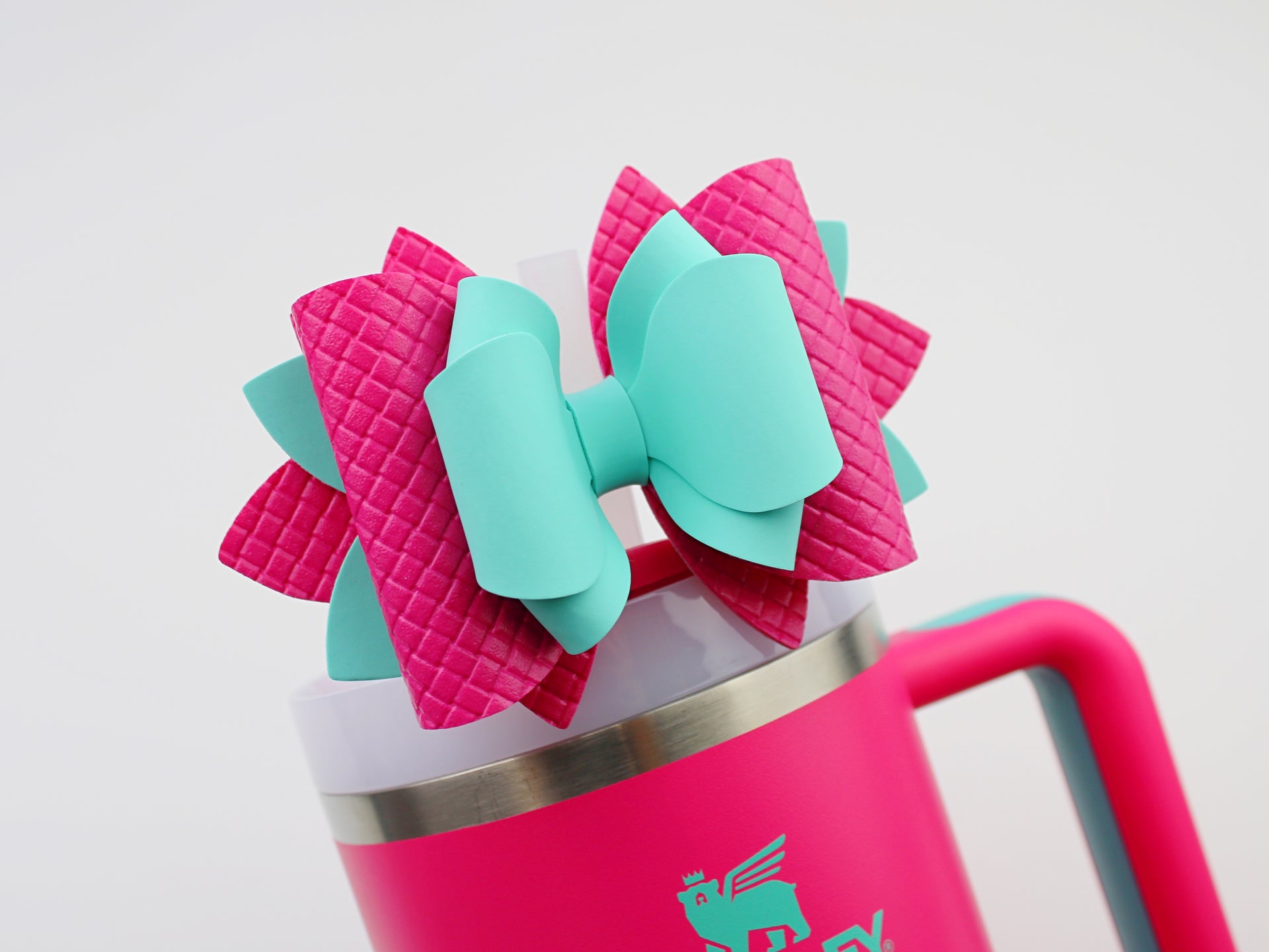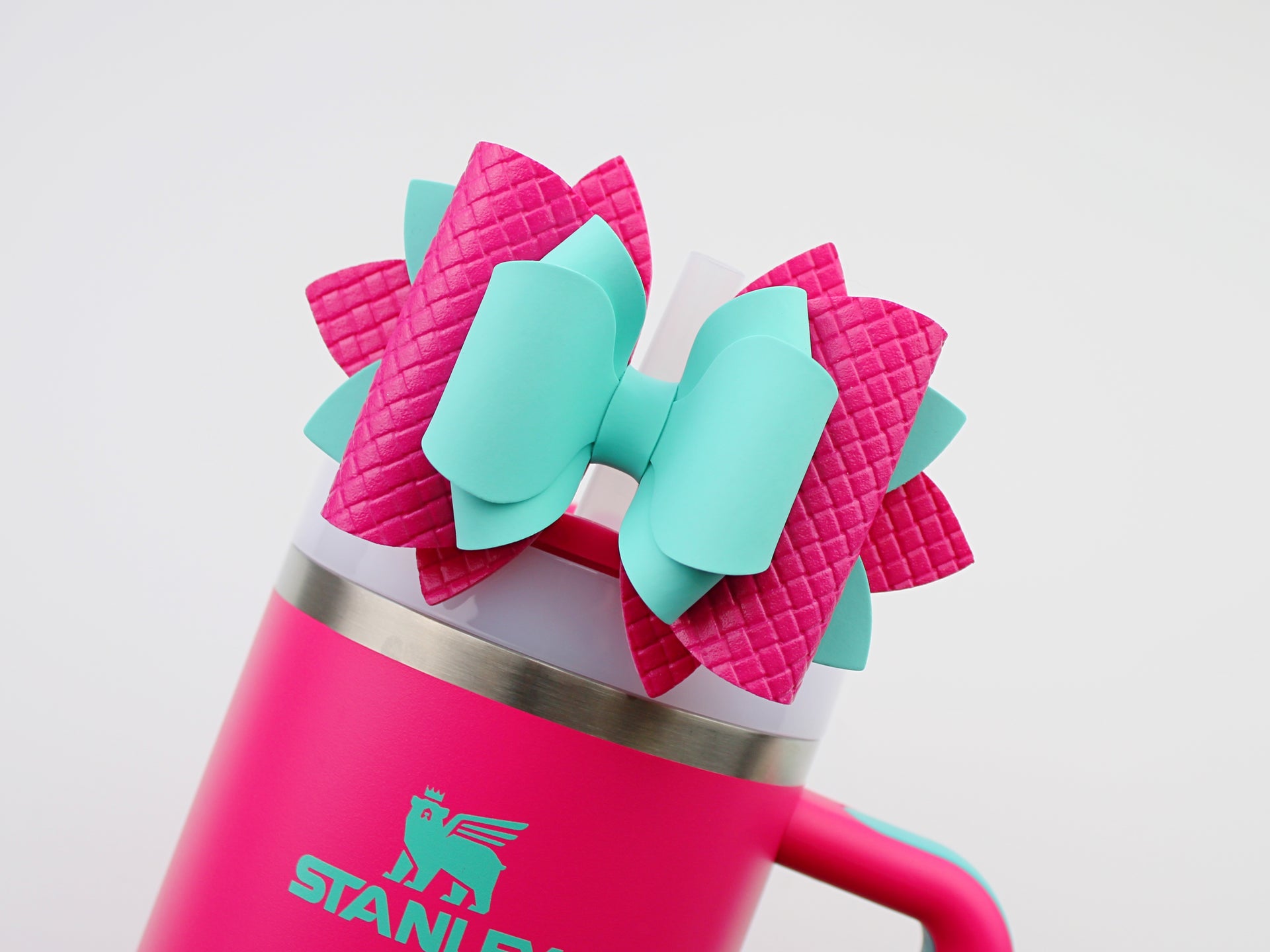 🎀 This Beautiful Bow is made out of faux leather, glitter fabric and designed to fit Stanley straws. Size: 4.5 inches. Each bow is handmade, ensuring a unique touch in every creation. 🎨 Due to screen variations, actual colors may slightly differ. 📦 This listing is for the bow only.