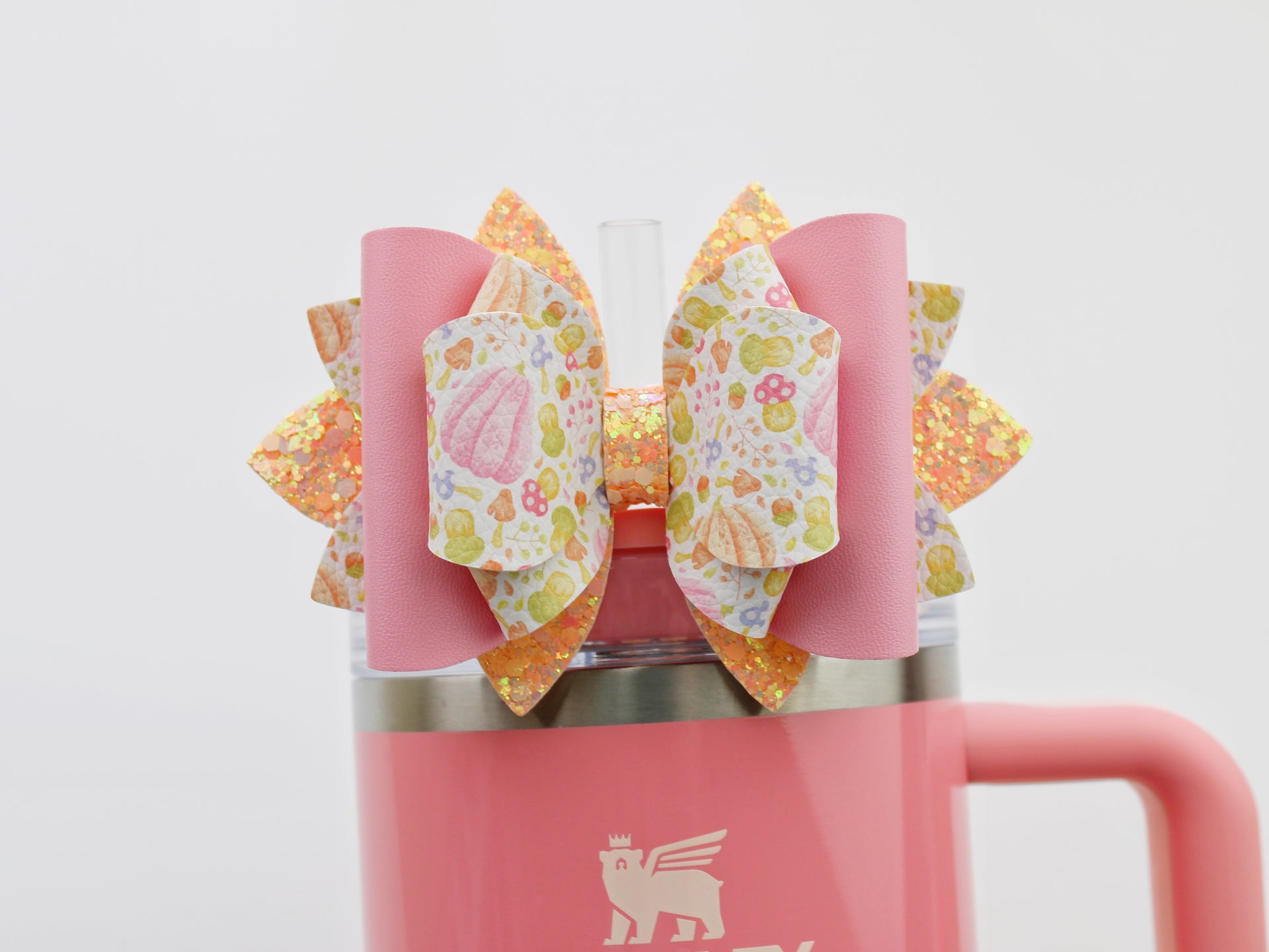 🎀 This Beautiful Bow is made out of faux leather, glitter fabric and designed to fit Stanley straws. Size: 4.5 inches. Each bow is handmade, ensuring a unique touch in every creation.  🎨 Due to screen variations, actual colors may slightly differ. 📦 This listing is for the bow only.