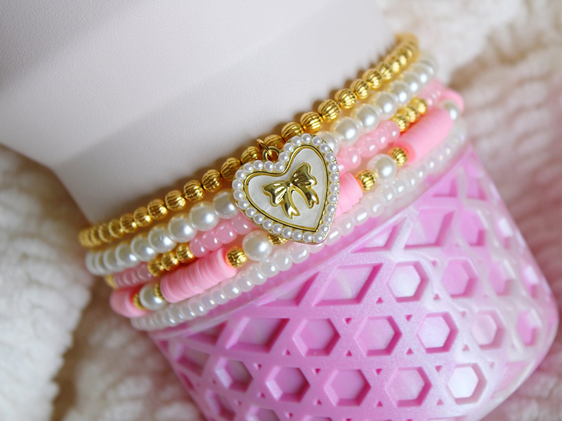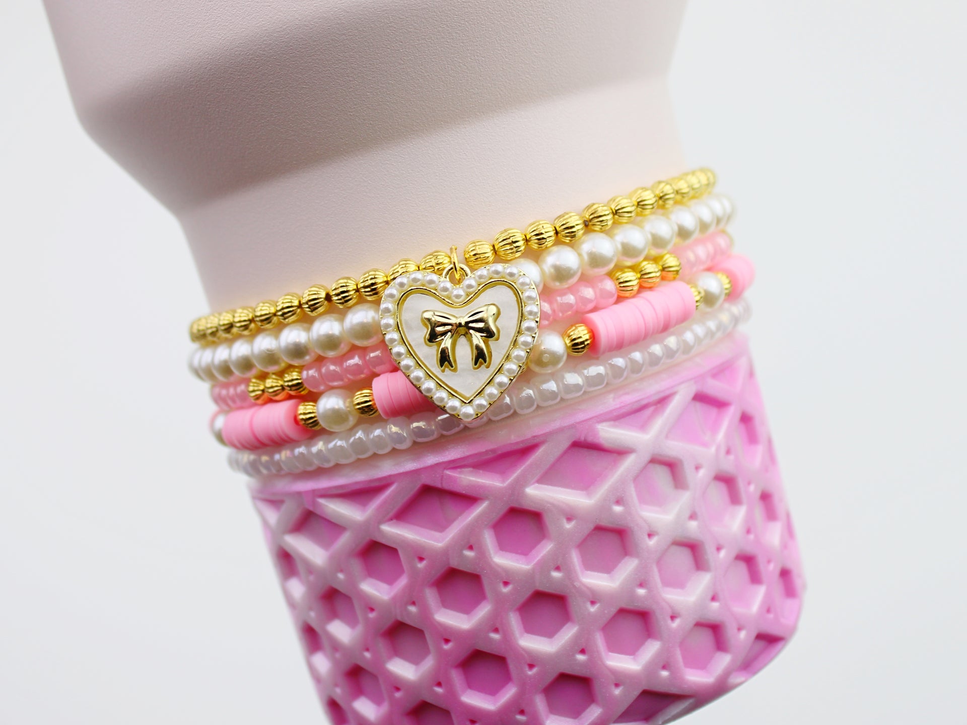 Elevate your Stanley cup with this beautiful bracelet stack! This stunning set includes five elegant bracelets in pink, gold, and pearl tones, featuring a vintage-style heart charm with a delicate bow. Designed for a touch of timeless charm, this stack adds the perfect blend of sophistication and style to your favorite tumbler! 💕 Care Tips: Handle with care to prevent overstretching. For a secure fit, we highly...