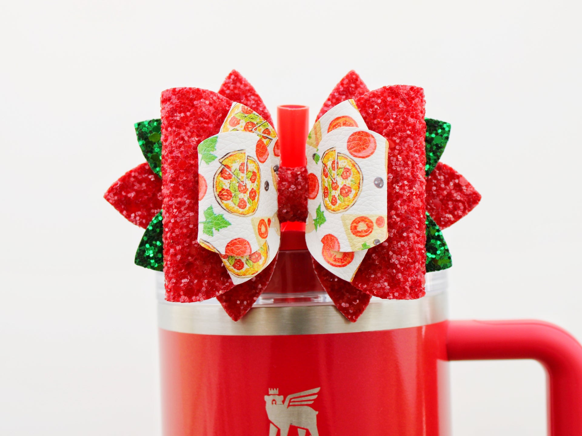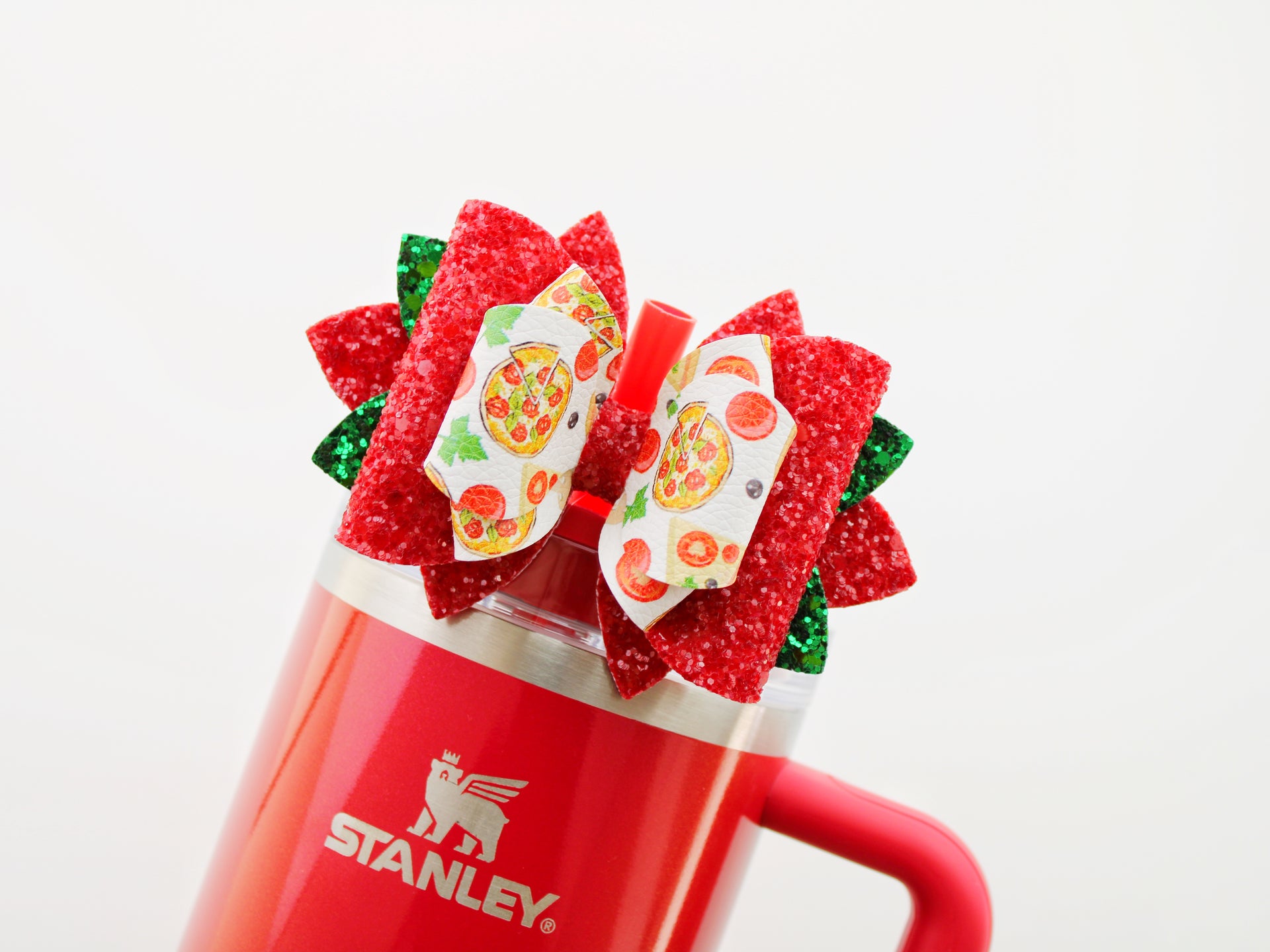 🎀 This Beautiful Bow is made out of faux leather, glitter fabric and designed to fit Stanley straws. Size: 4.5 inches. Each bow is handmade, ensuring a unique touch in every creation. 🎨 Due to screen variations, actual colors may slightly differ. 📦 This listing is for the bow only.
