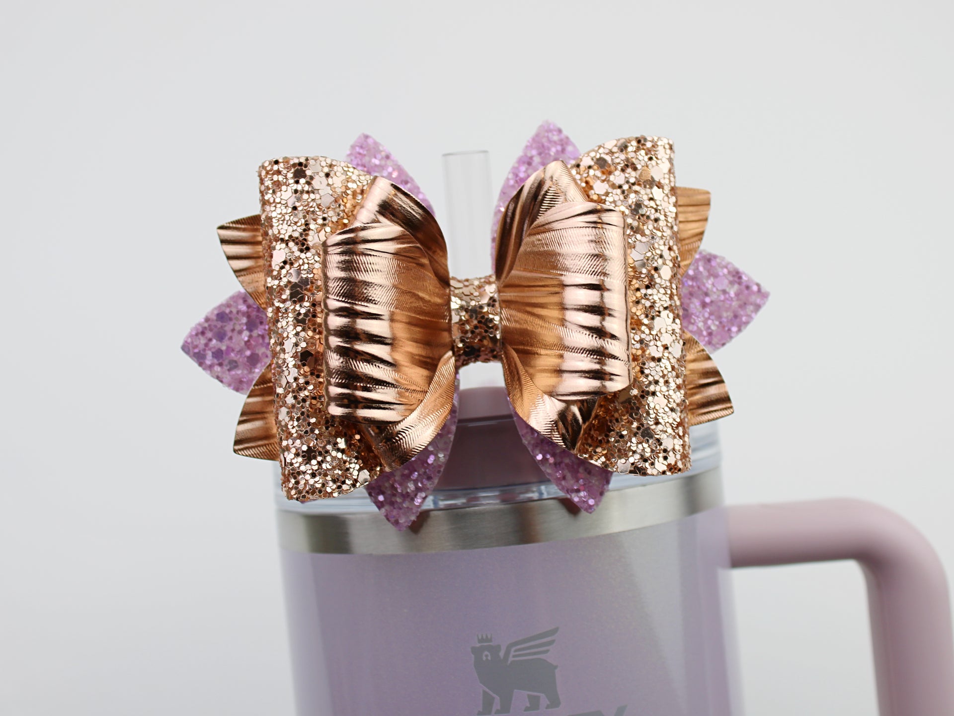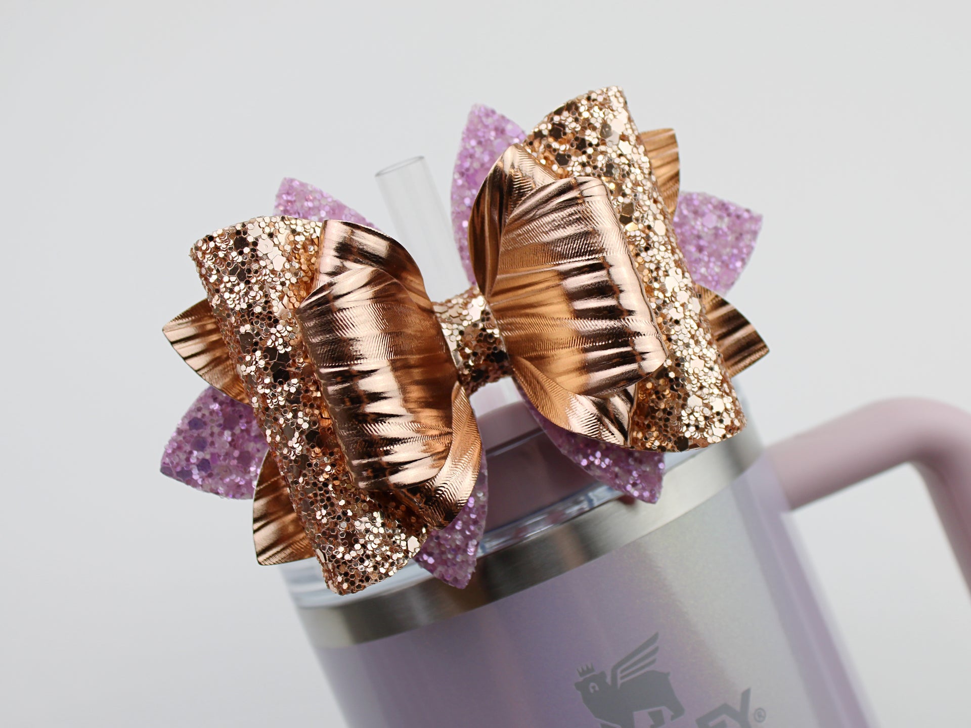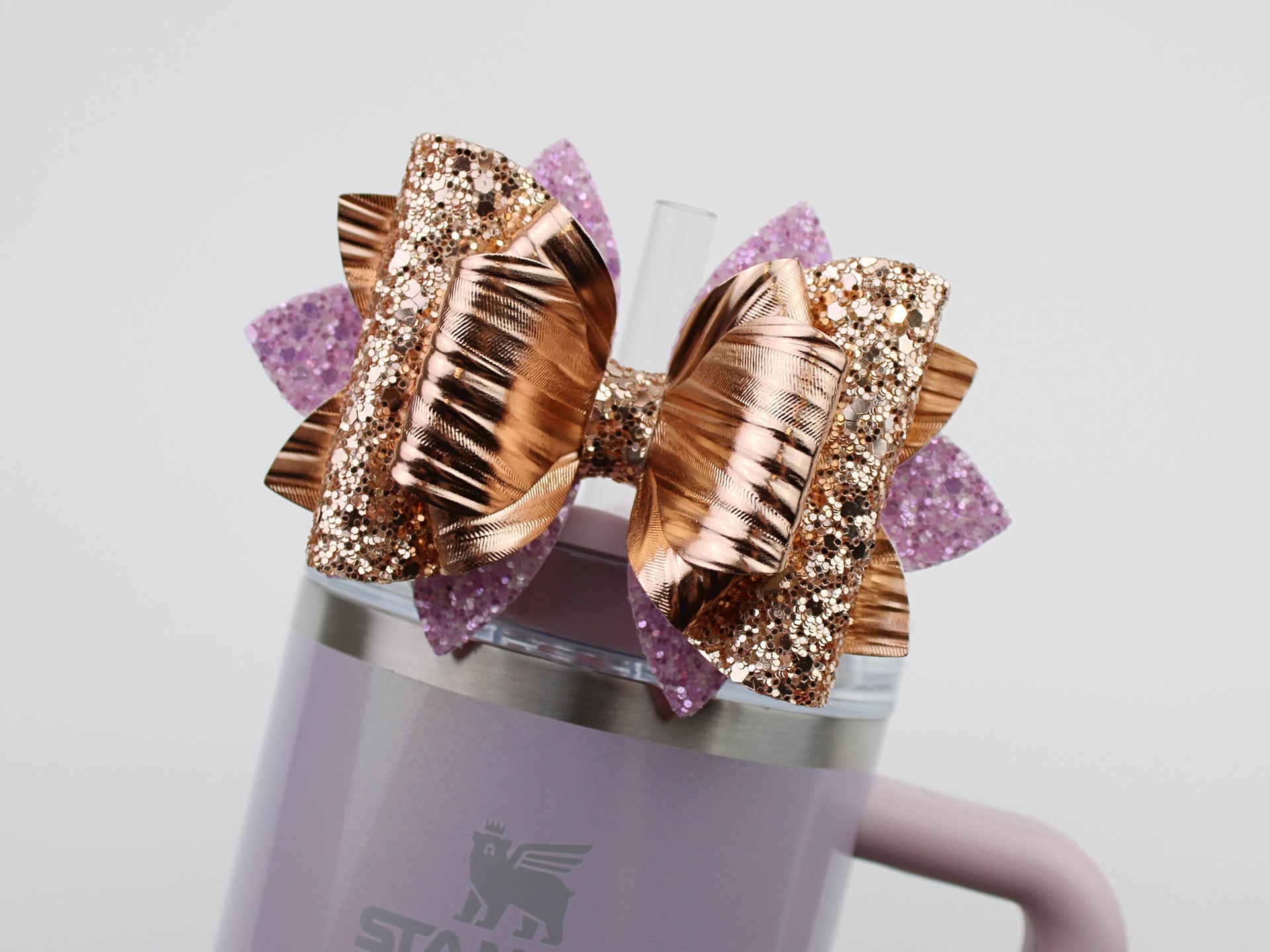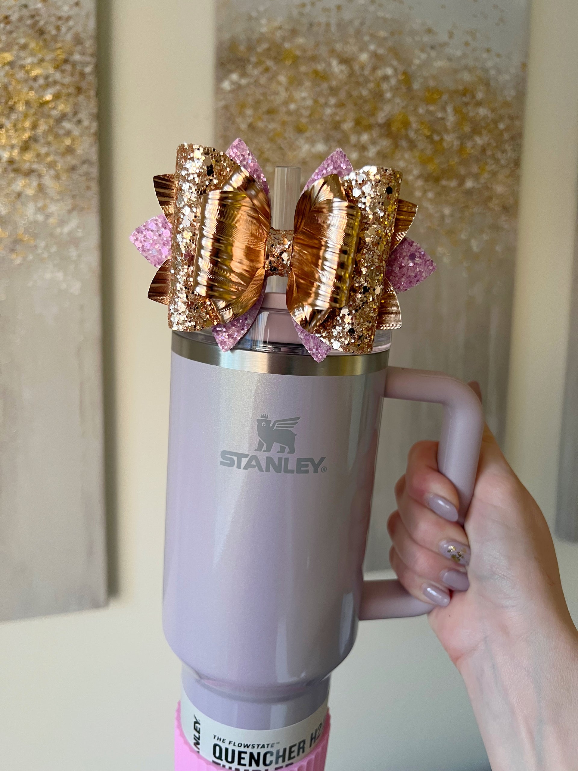 🎀 This Beautiful Bow is made out of faux leather, glitter fabric and designed to fit Stanley straws. Size: 4.5 inches. Each bow is handmade, ensuring a unique touch in every creation. 🎨 Due to screen variations, actual colors may slightly differ. 📦 This listing is for the bow only.