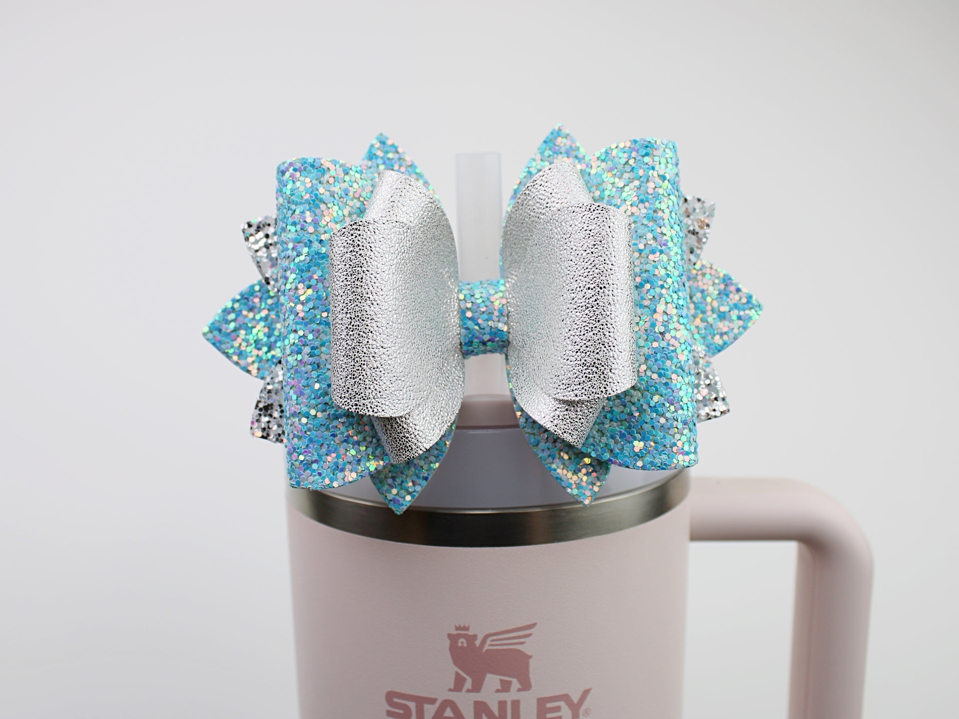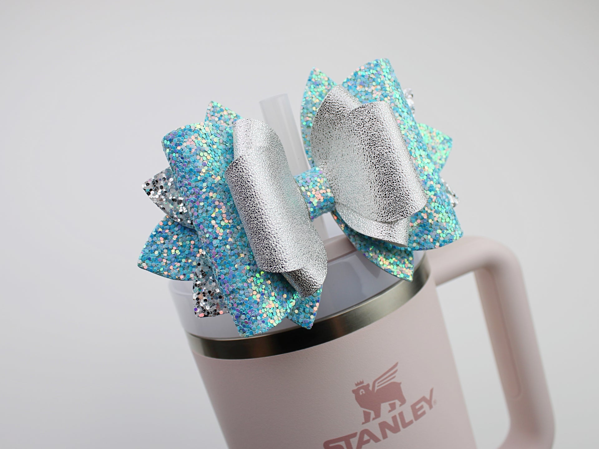 🎀 This Beautiful Bow is made out of faux leather, glitter fabric and designed to fit Stanley straws. Size: 4.5 inches. Each bow is handmade, ensuring a unique touch in every creation. 🎨 Due to screen variations, actual colors may slightly differ. 🎀 This listing is for the bow only.