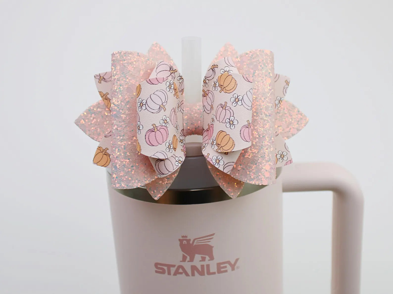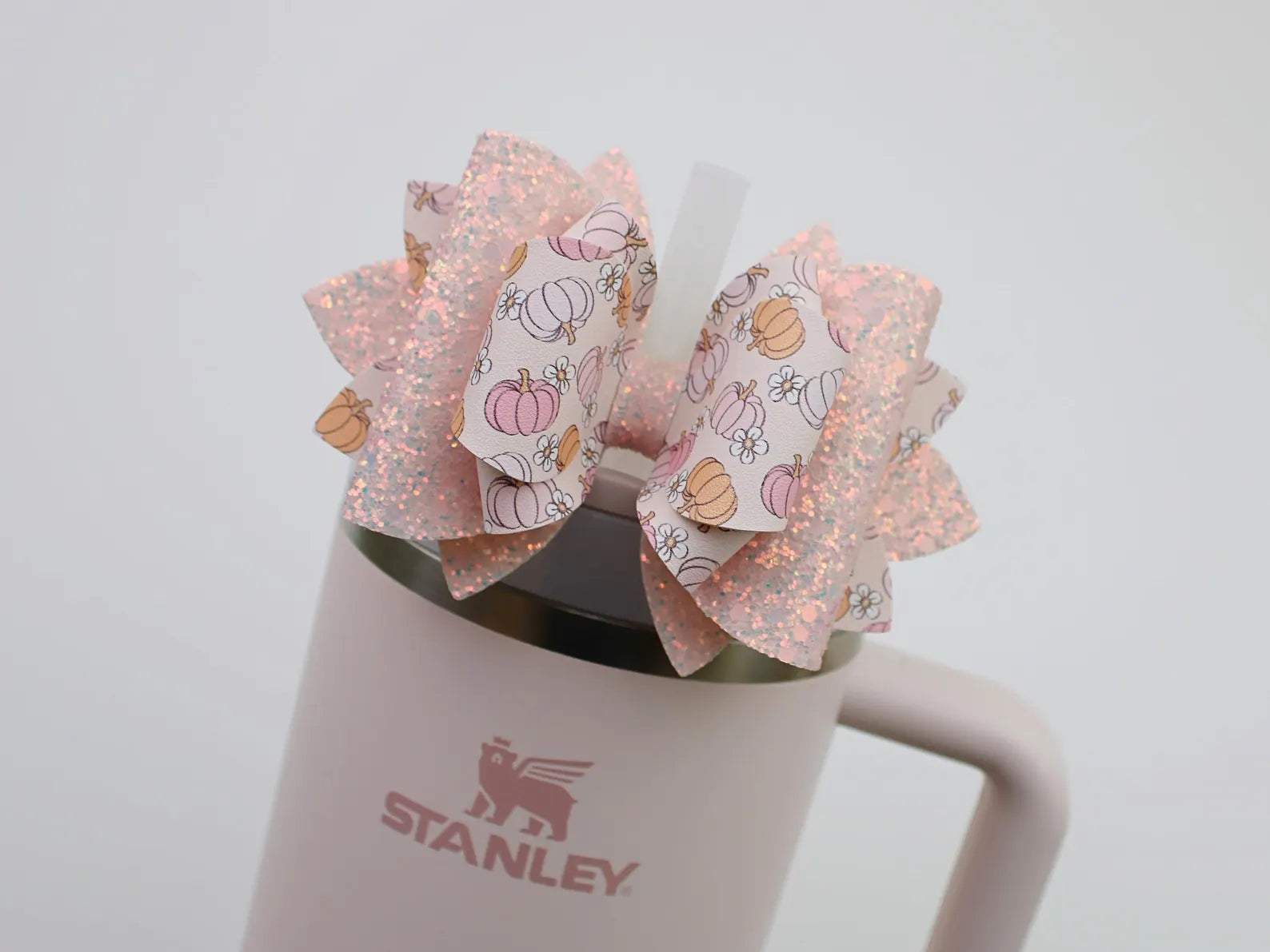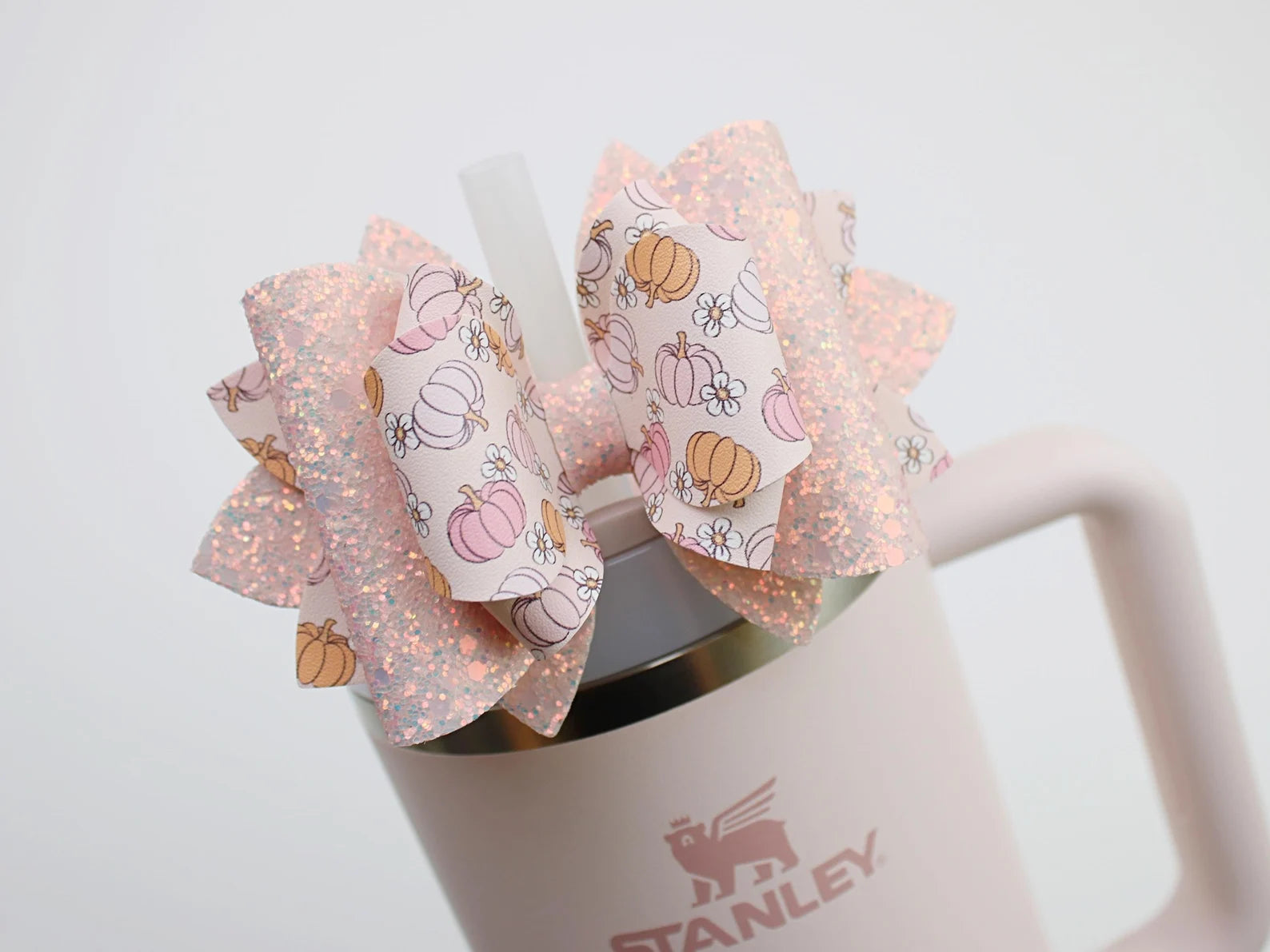 🎀 This Beautiful Bow is made out of faux leather, glitter fabric and designed to fit Stanley straws. Size: 4.5 inches. Each bow is handmade, ensuring a unique touch in every creation.  🎨 Due to screen variations, actual colors may slightly differ. 📦 This listing is for the bow only.