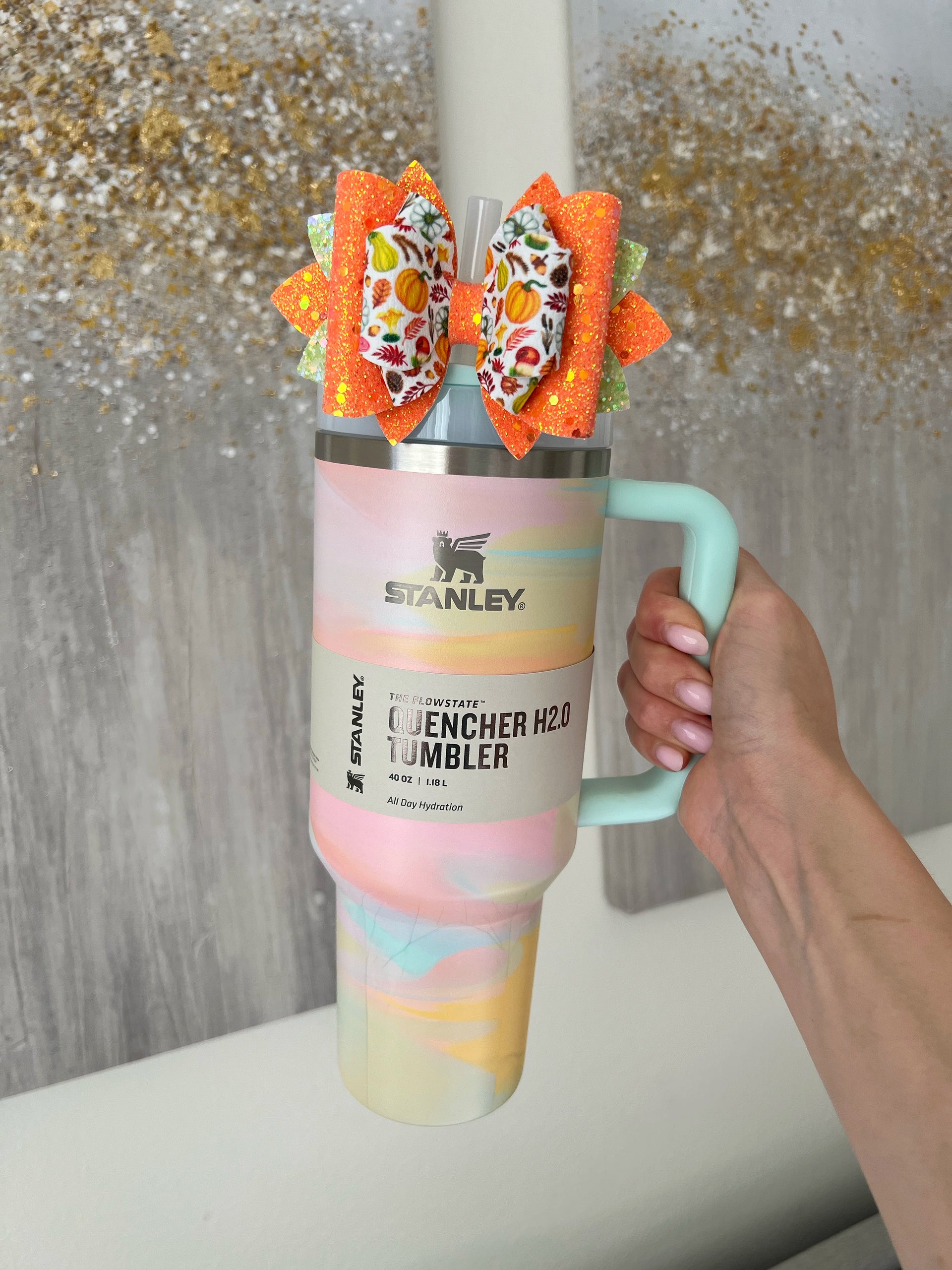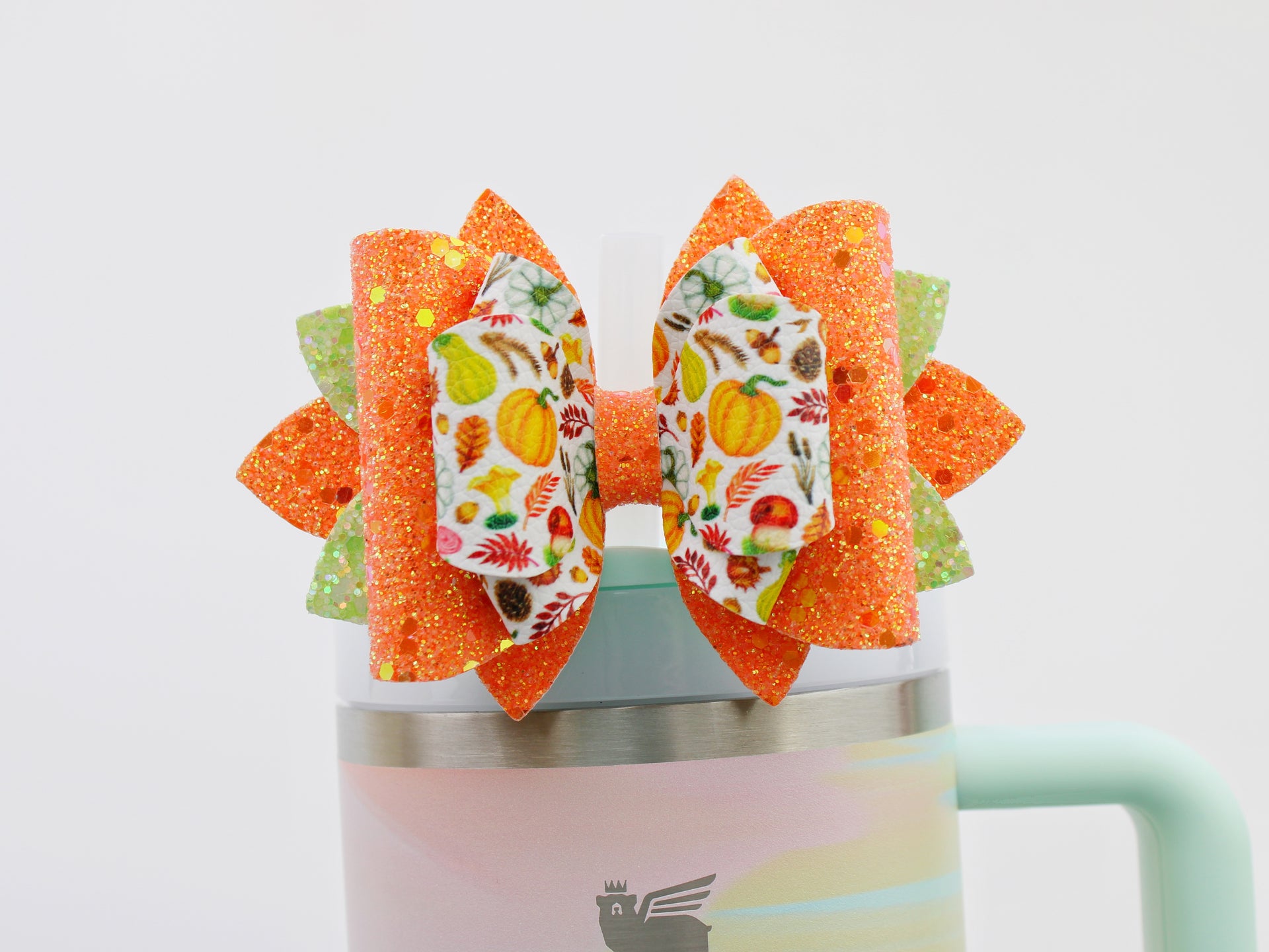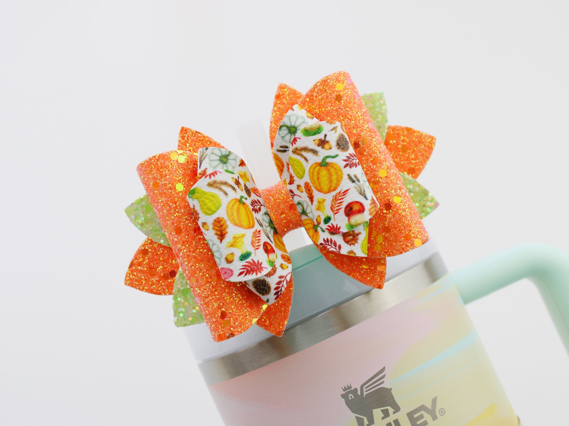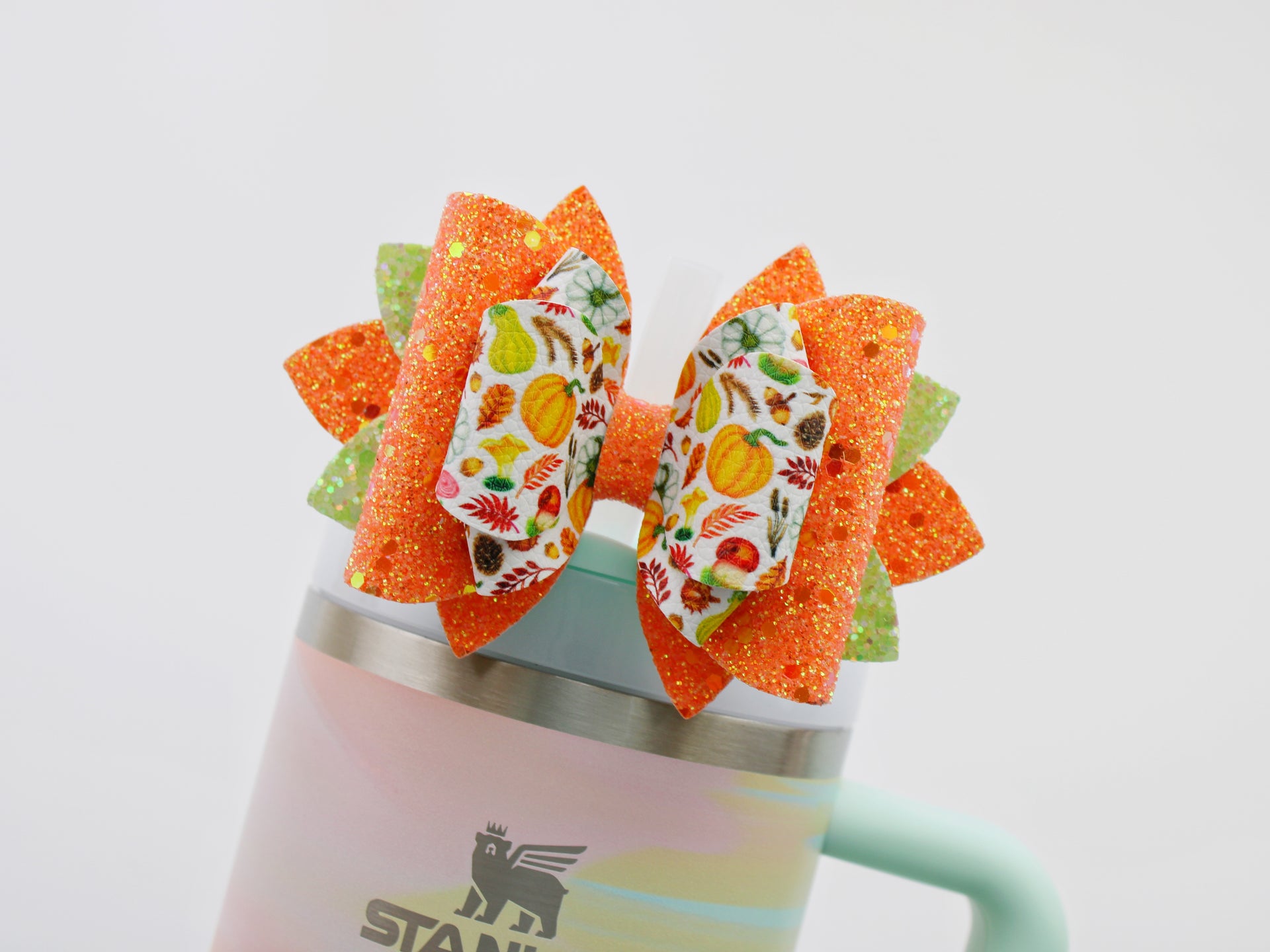 🎀 This Beautiful Bow is made out of faux leather, glitter fabric and designed to fit Stanley straws. Size: 4.5 inches. Each bow is handmade, ensuring a unique touch in every creation.  🎨 Due to screen variations, actual colors may slightly differ. 📦 This listing is for the bow only.
