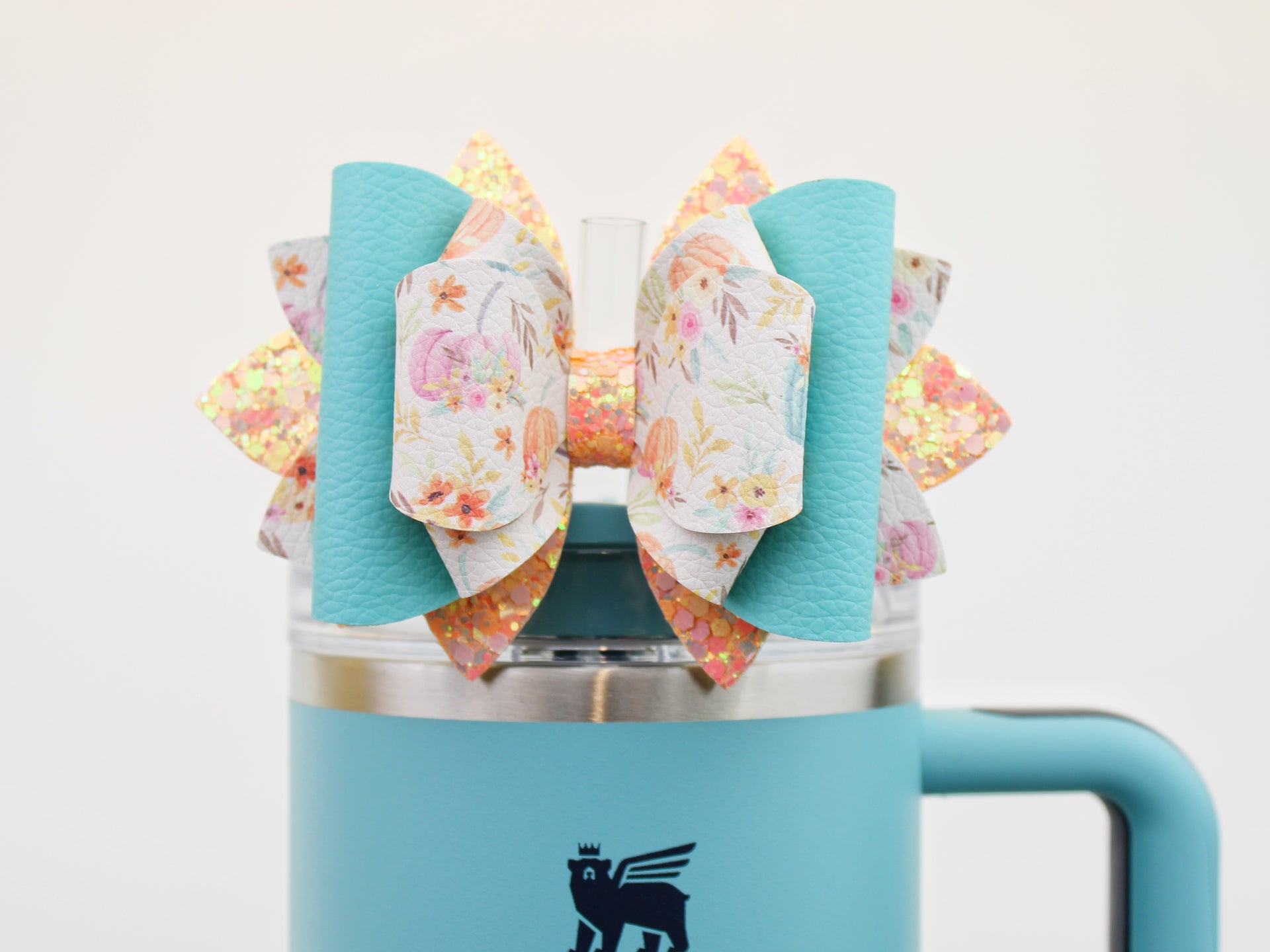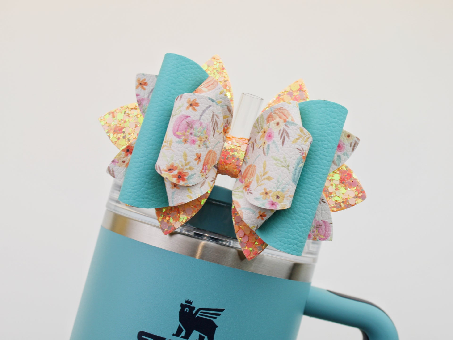 🎀 This Beautiful Bow is made out of faux leather, glitter fabric and designed to fit Stanley straws. Size: 4.5 inches. Each bow is handmade, ensuring a unique touch in every creation. 🎨 Due to screen variations, actual colors may slightly differ. 📦 This listing is for the bow only.