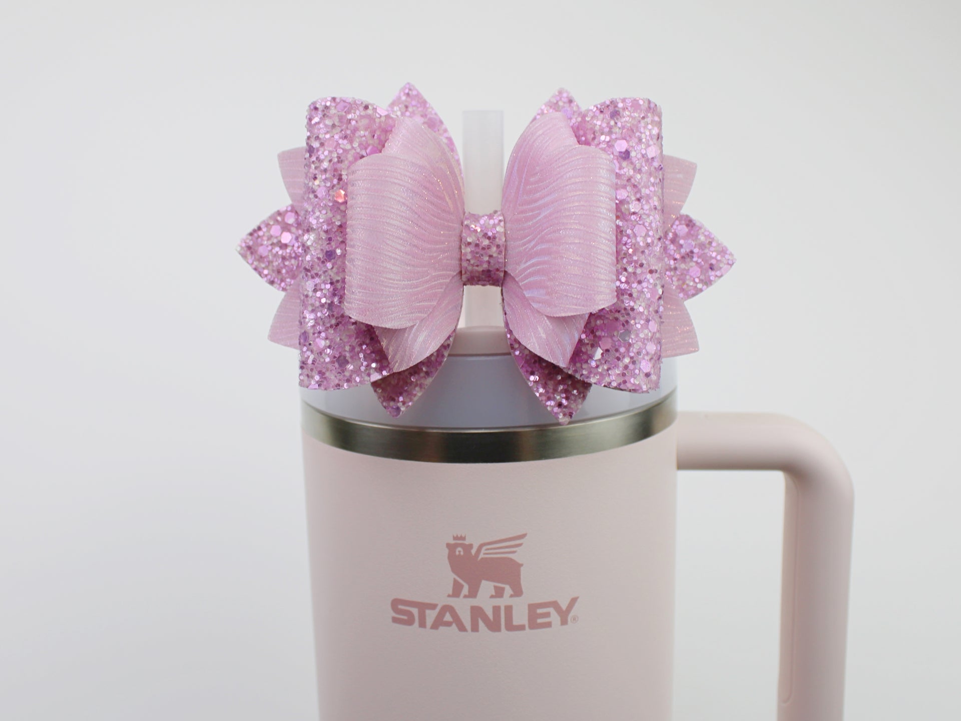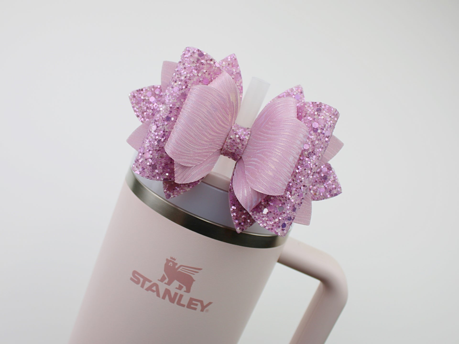 🎀 This Beautiful Bow is made out of faux leather, glitter fabric and designed to fit Stanley straws. Size: 4.5 inches. Each bow is handmade, ensuring a unique touch in every creation.  🎨 Due to screen variations, actual colors may slightly differ. 🎀 This listing is for the bow only.