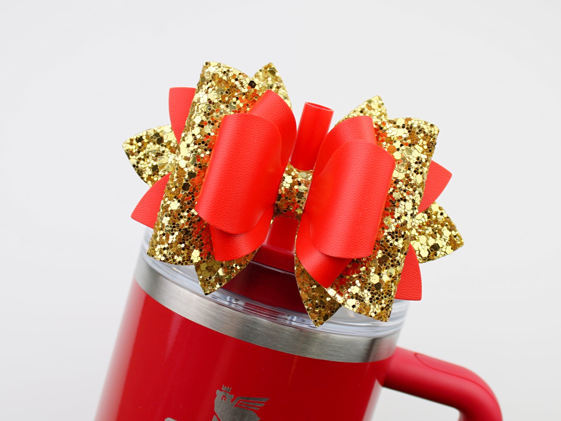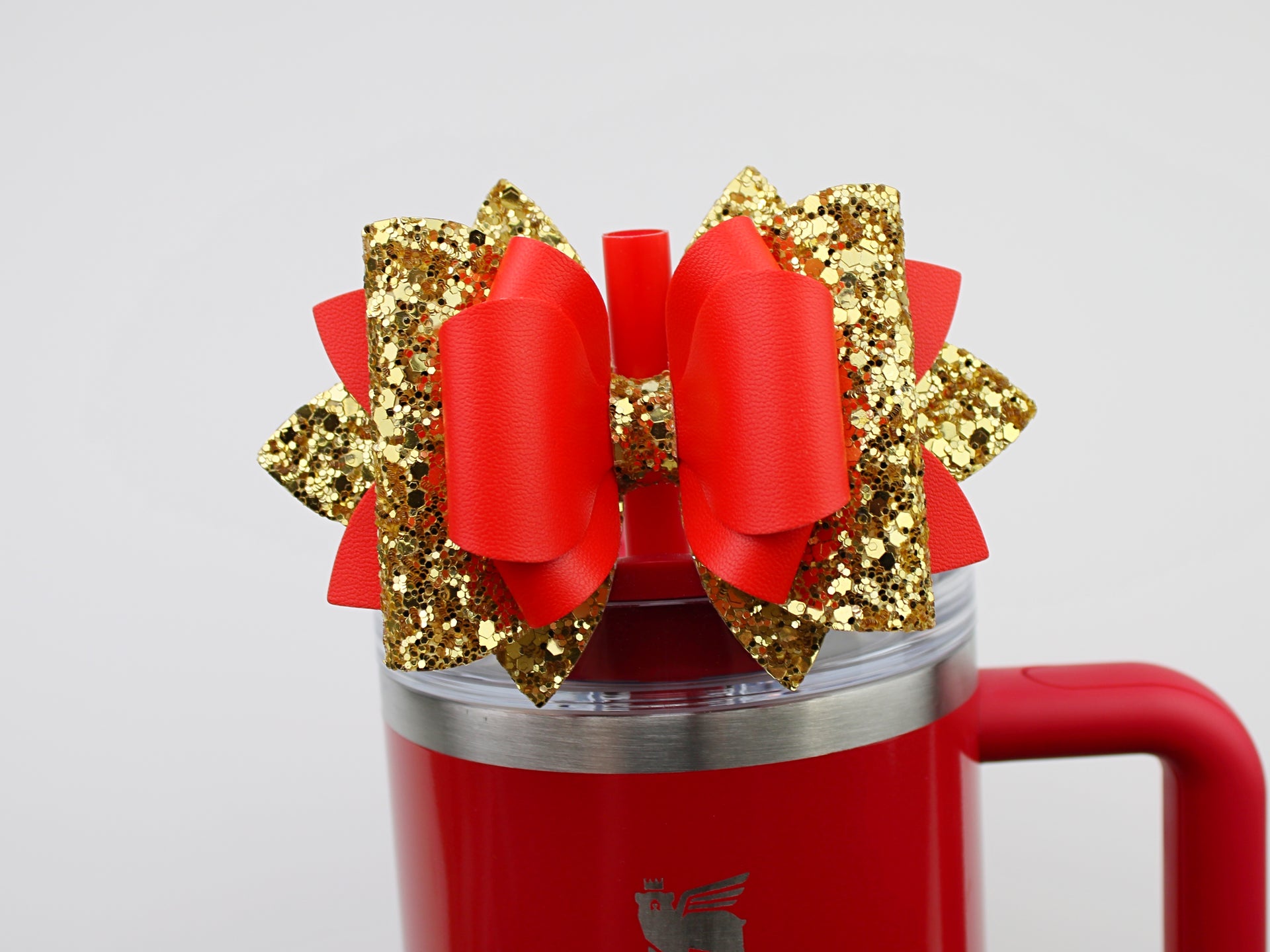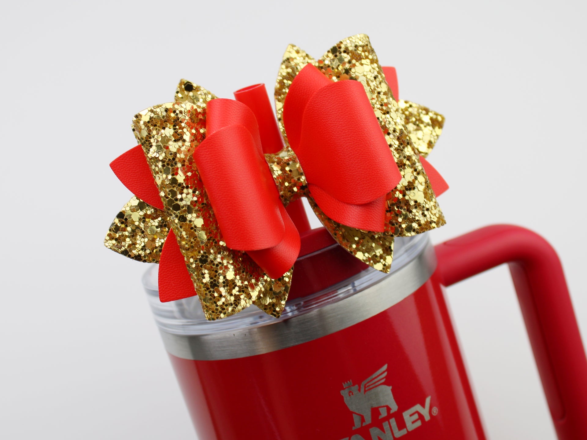🎀 This Beautiful Bow is made out of faux leather, glitter fabric and designed to fit Stanley straws. Size: 4.5 inches. Each bow is handmade, ensuring a unique touch in every creation. 🎨 Due to screen variations, actual colors may slightly differ. 📦 This listing is for the bow only.