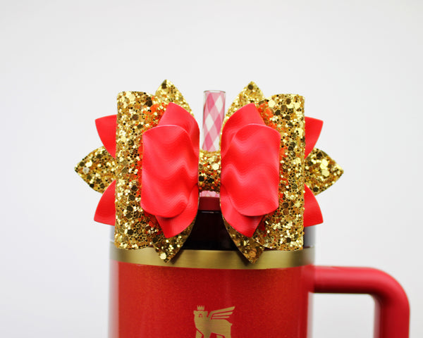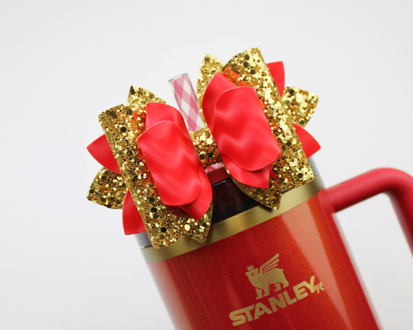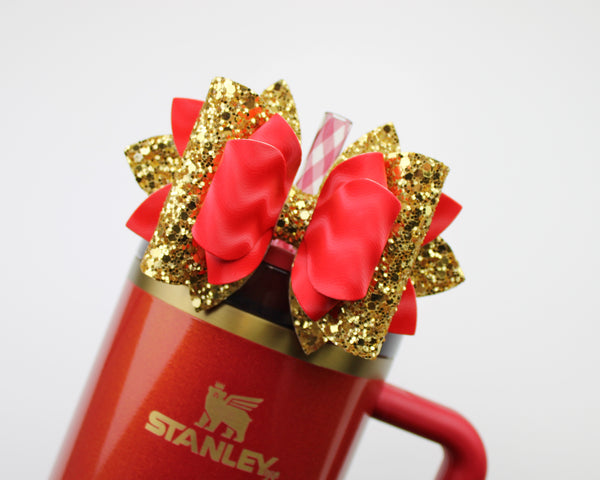 🎀 This Beautiful Bow is made out of faux leather, glitter fabric and designed to fit Stanley straws. Size: 4.5 inches. Each bow is handmade, ensuring a unique touch in every creation.  🎨 Due to screen variations, actual colors may slightly differ. 📦 This listing is for the bow only.