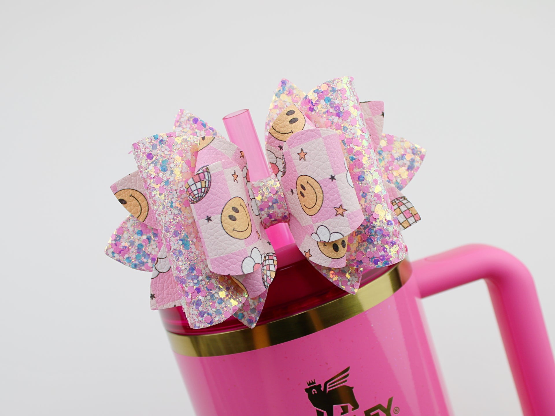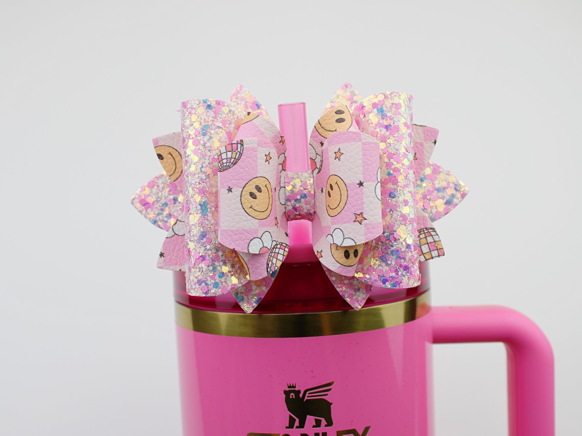 🎀 This Beautiful Bow is made out of faux leather, glitter fabric and designed to fit Stanley straws. Size: 4.5 inches. Each bow is handmade, ensuring a unique touch in every creation.  🎨 Due to screen variations, actual colors may slightly differ. 📦 This listing is for the bow only.