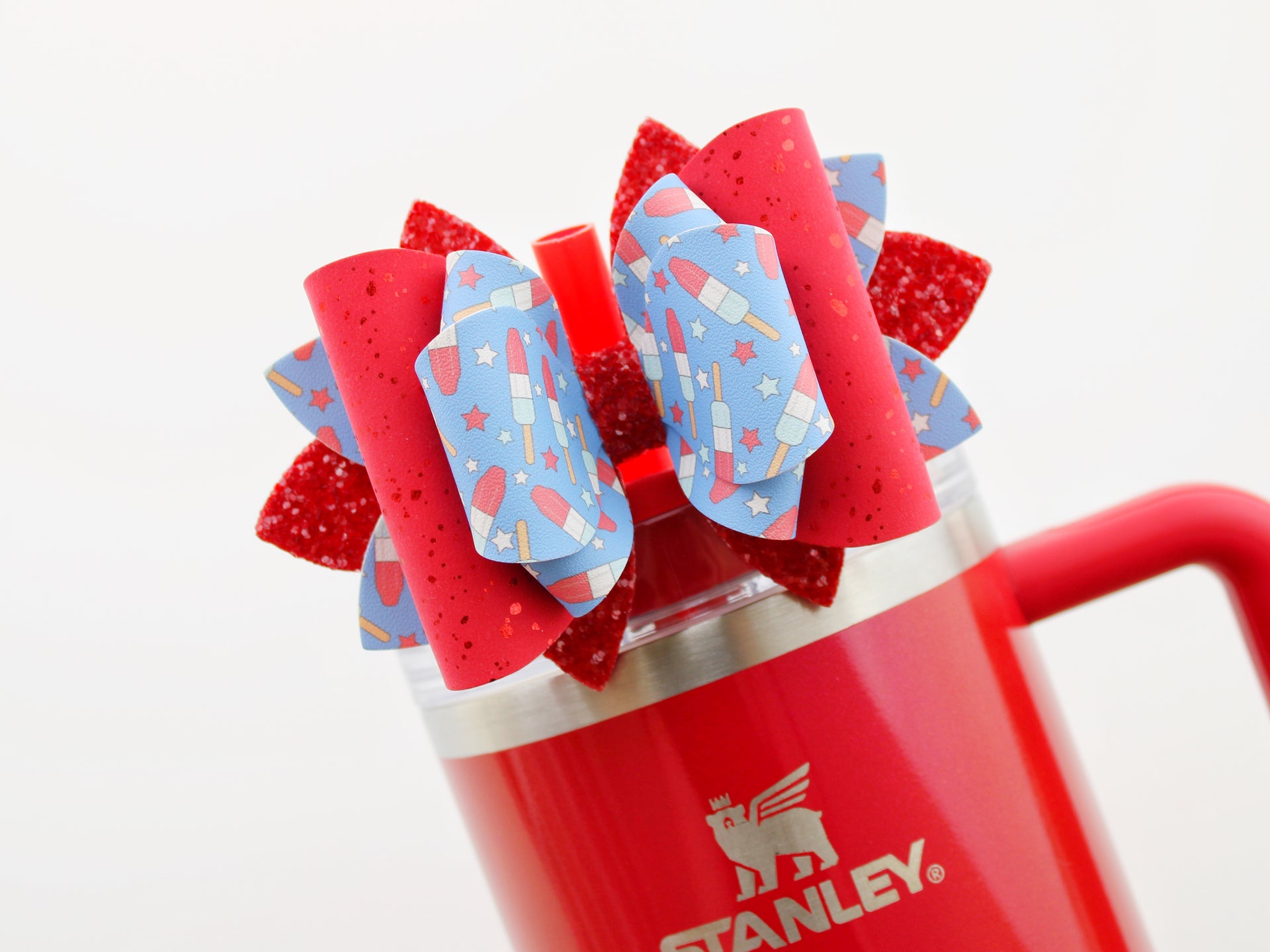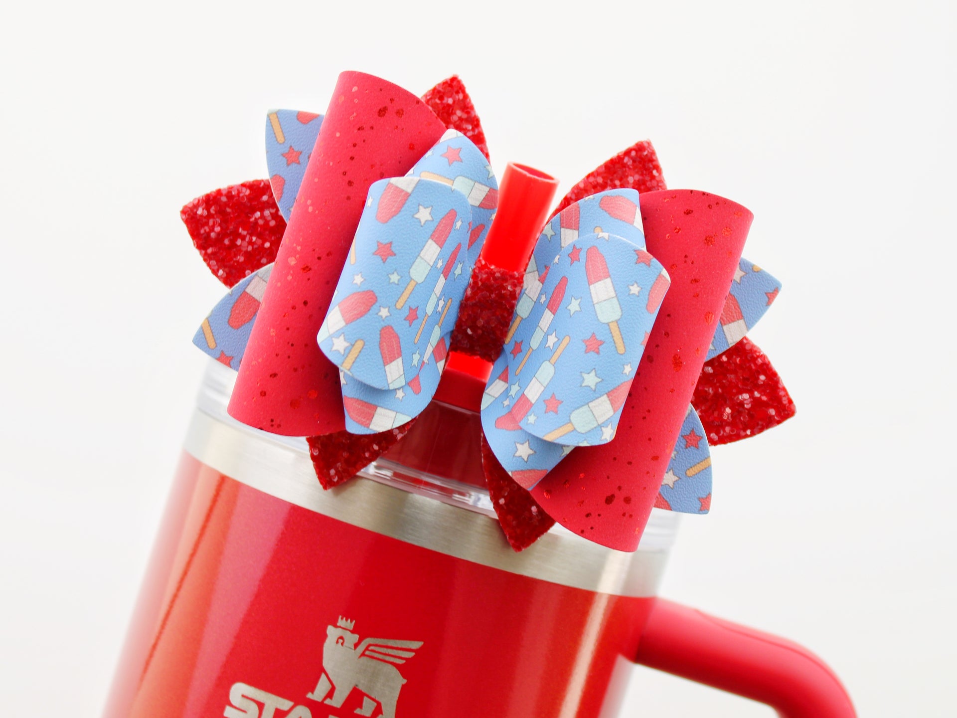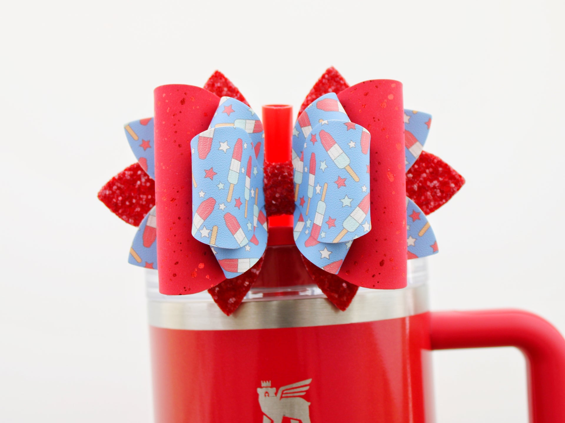 🎀 This Beautiful Bow is made out of faux leather, glitter fabric and designed to fit Stanley straws. Size: 4.5 inches. Each bow is handmade, ensuring a unique touch in every creation.  🎨 Due to screen variations, actual colors may slightly differ. 📦 This listing is for the bow only.