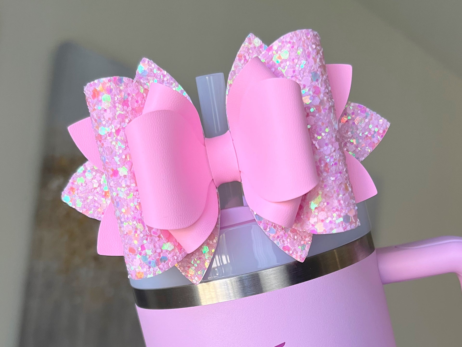 🎀 This Beautiful Bow is made out of faux leather, glitter fabric and designed to fit Stanley straws. Size: 4.5 inches. Each bow is handmade, ensuring a unique touch in every creation.  🎨 Due to screen variations, actual colors may slightly differ. 📦 This listing is for the bow only.