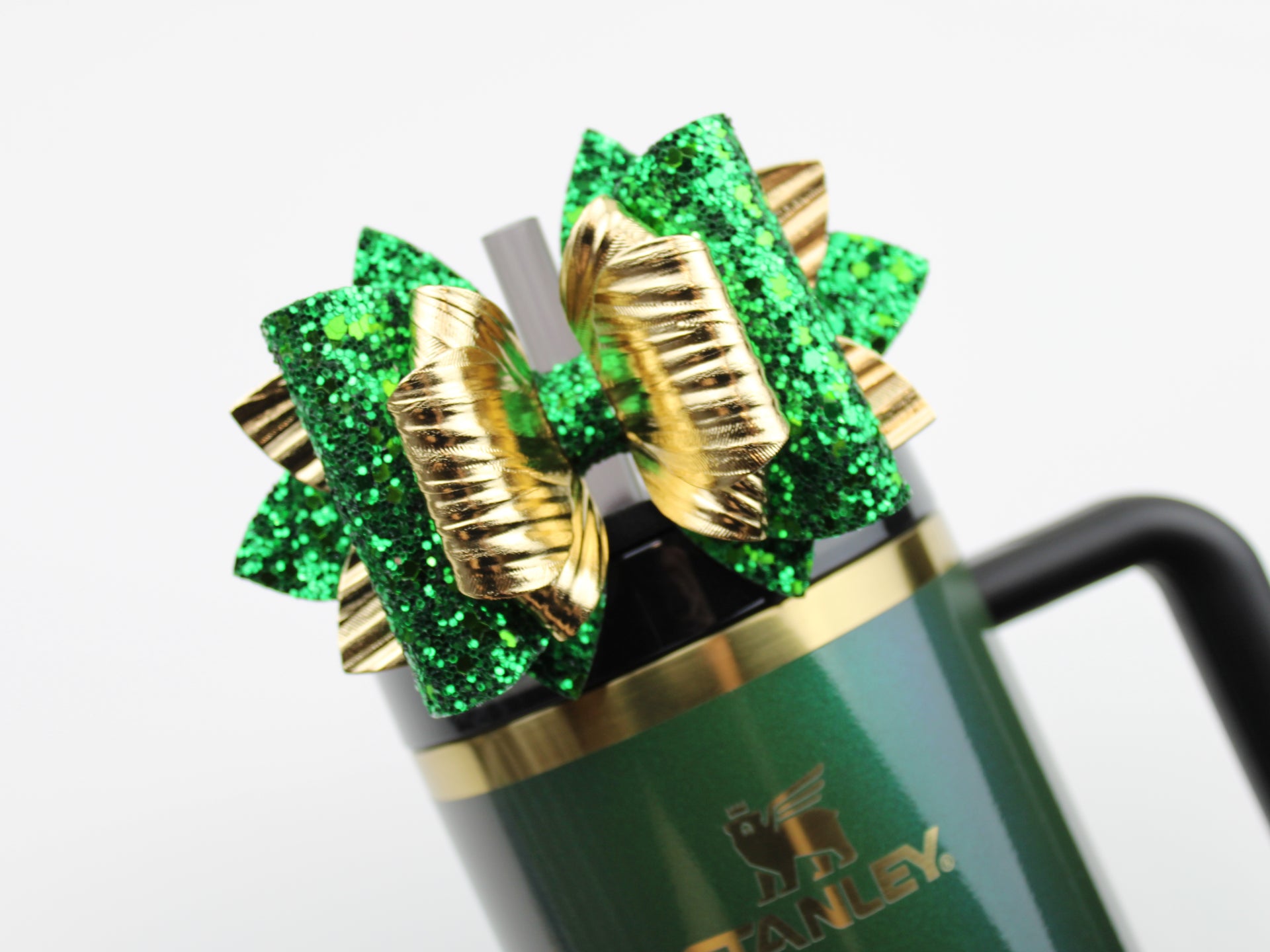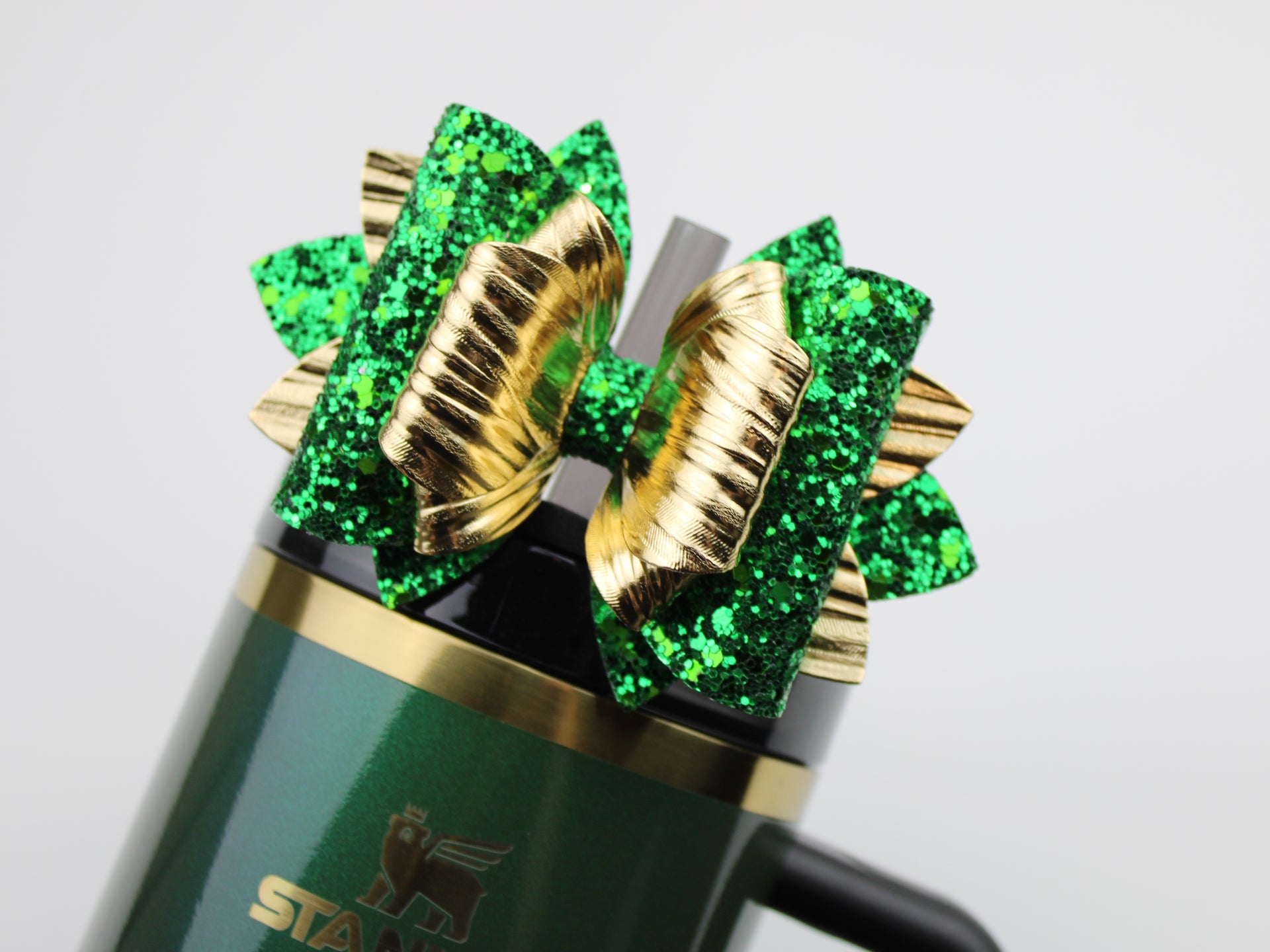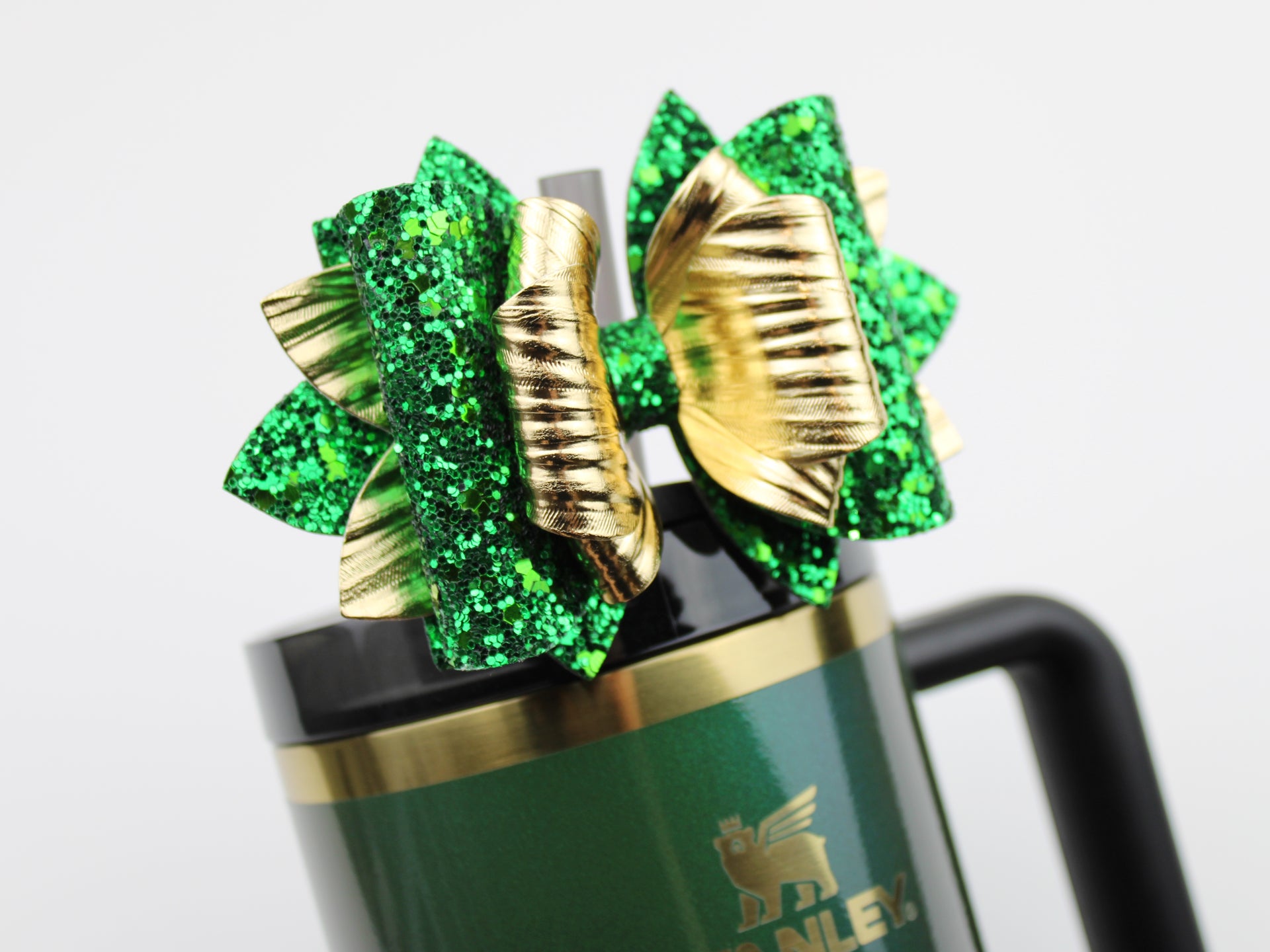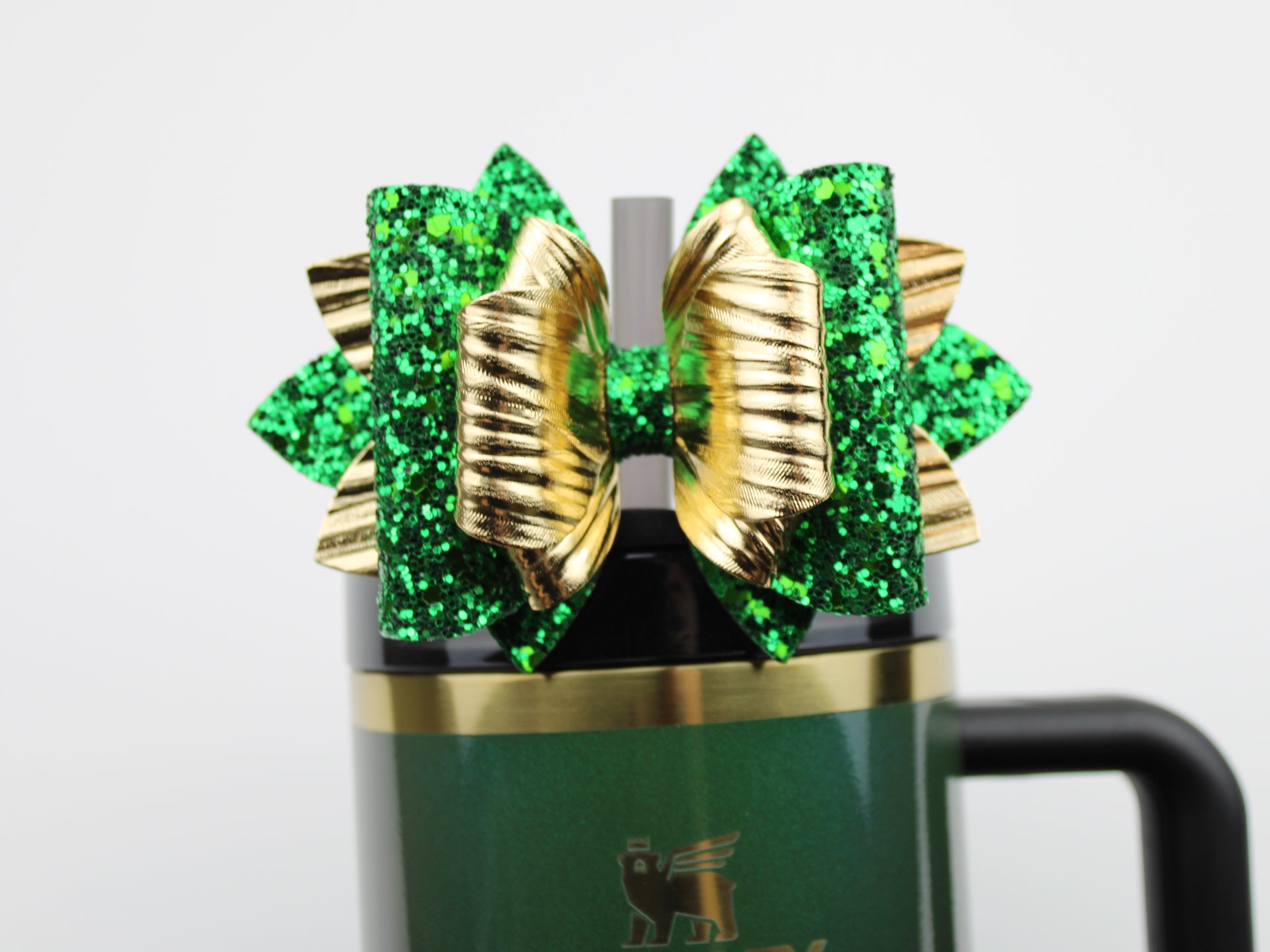 🎀 This Beautiful Bow is made out of faux leather, glitter fabric and designed to fit Stanley straws. Size: 4.5 inches. Each bow is handmade, ensuring a unique touch in every creation.  🎨 Due to screen variations, actual colors may slightly differ. 🎀 This listing is for the bow only.