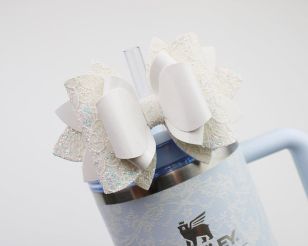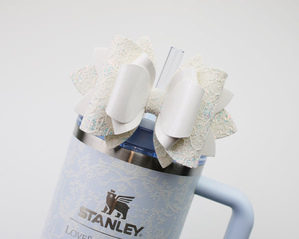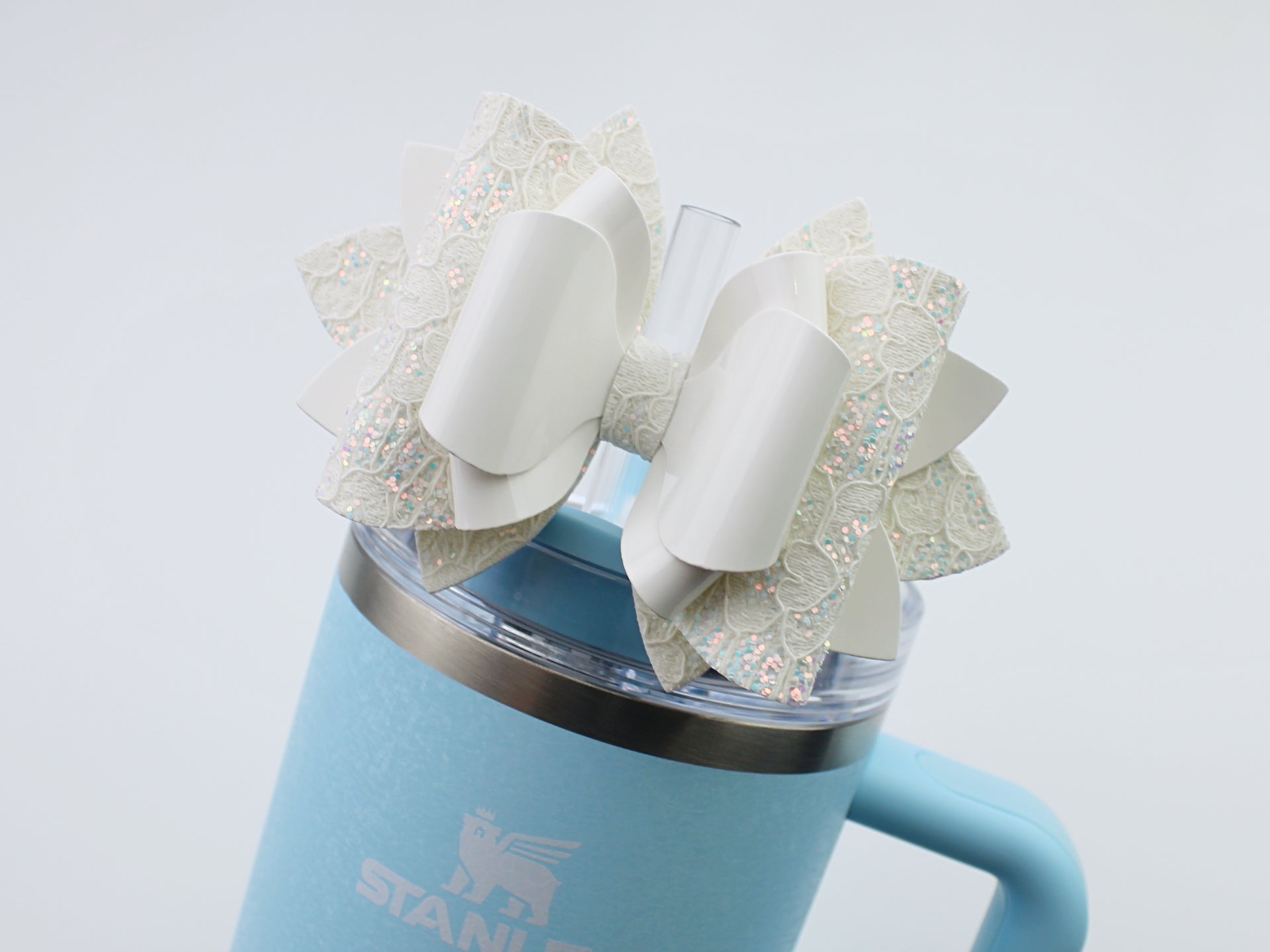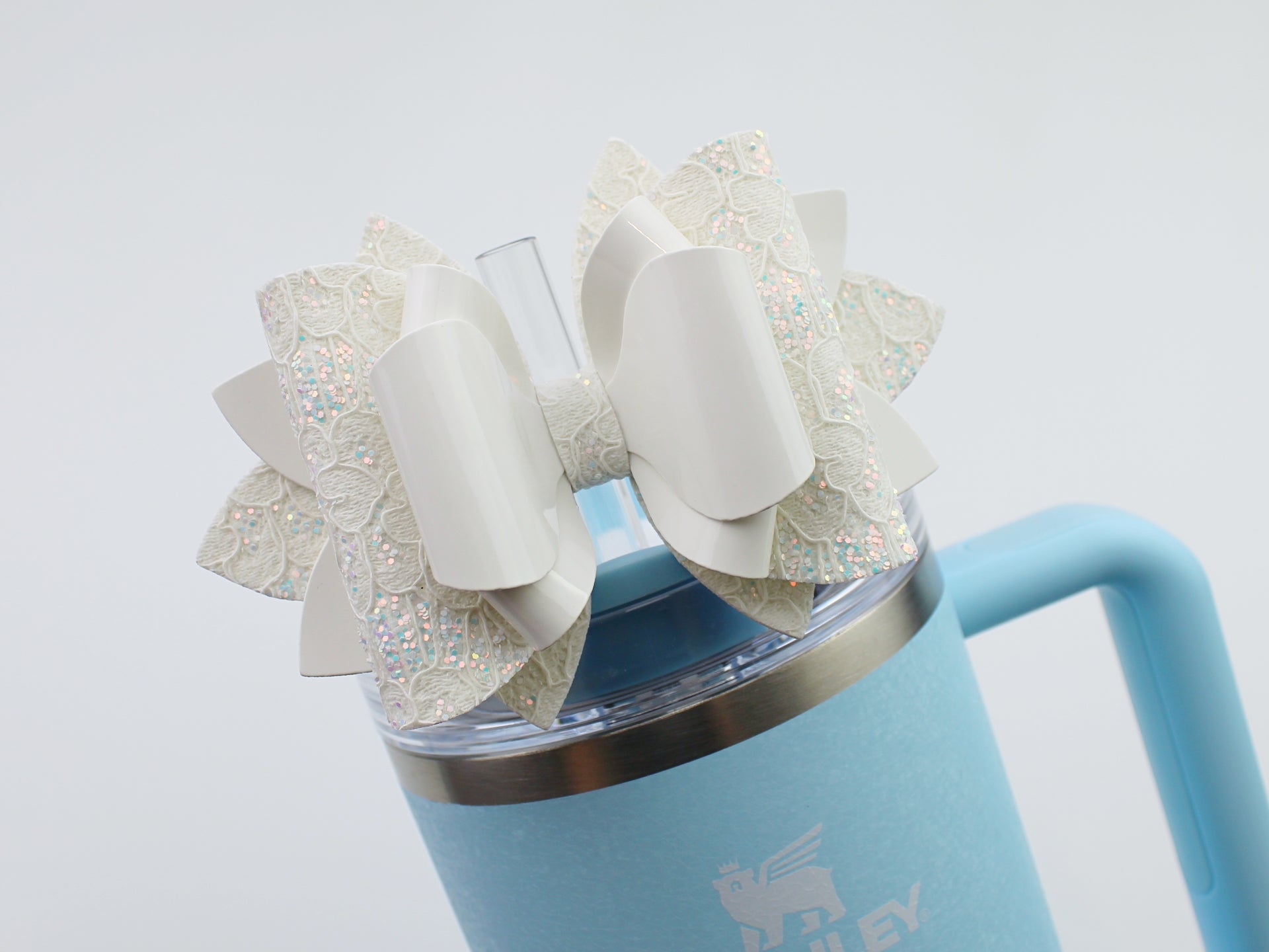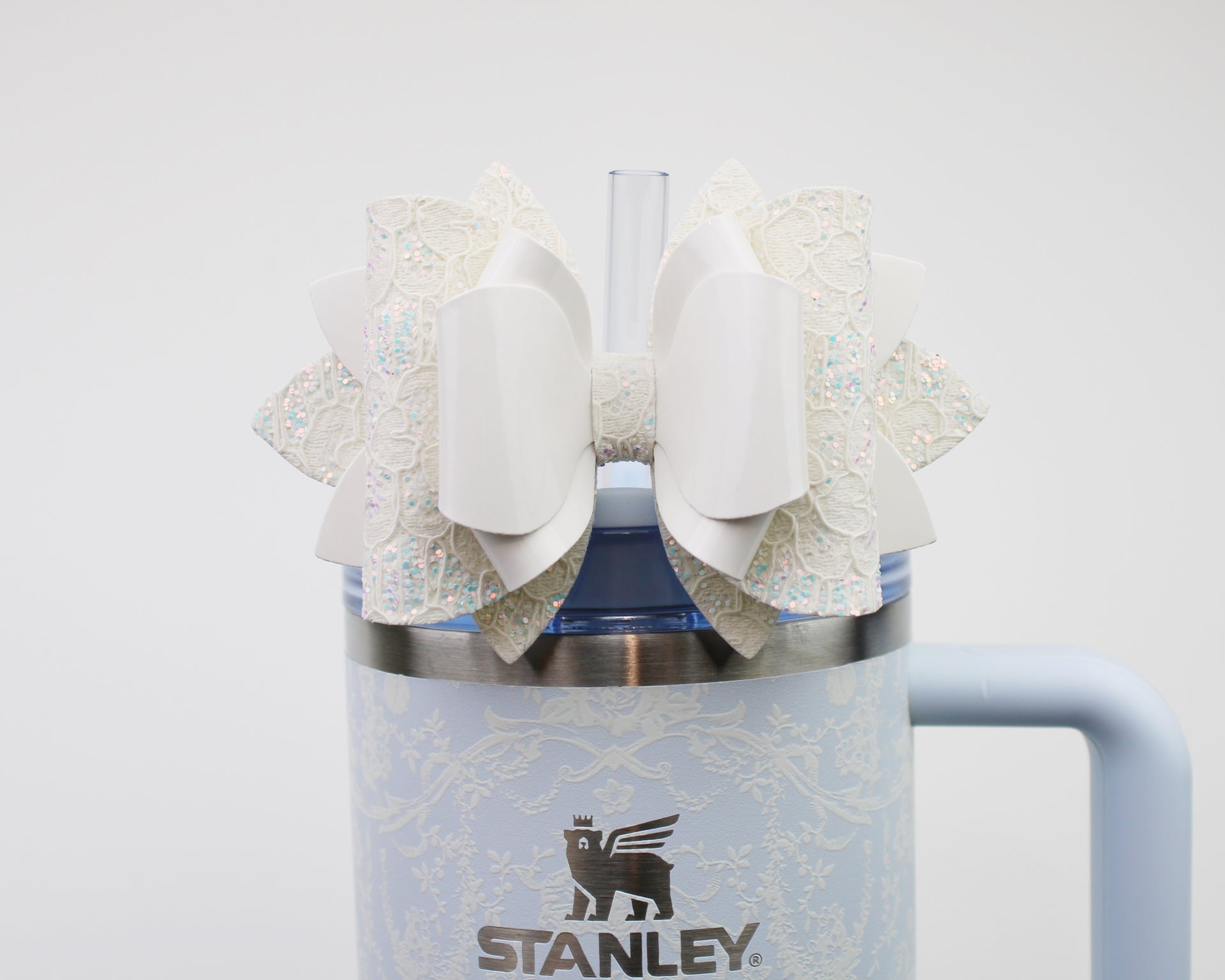 🎀 This Beautiful Bow is made out of faux leather, glitter fabric and designed to fit Stanley straws. Size: 4.5 inches. Each bow is handmade, ensuring a unique touch in every creation. 🎨 Due to screen variations, actual colors may slightly differ. 🎀 This listing is for the bow only.