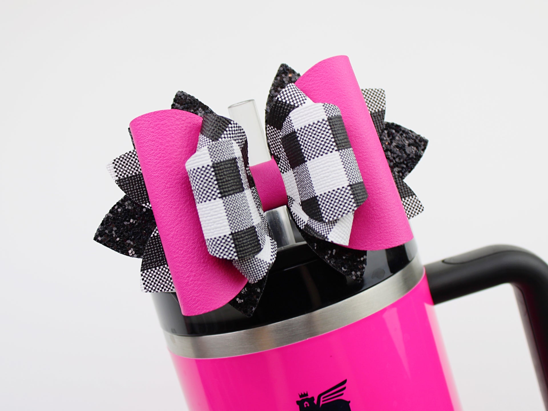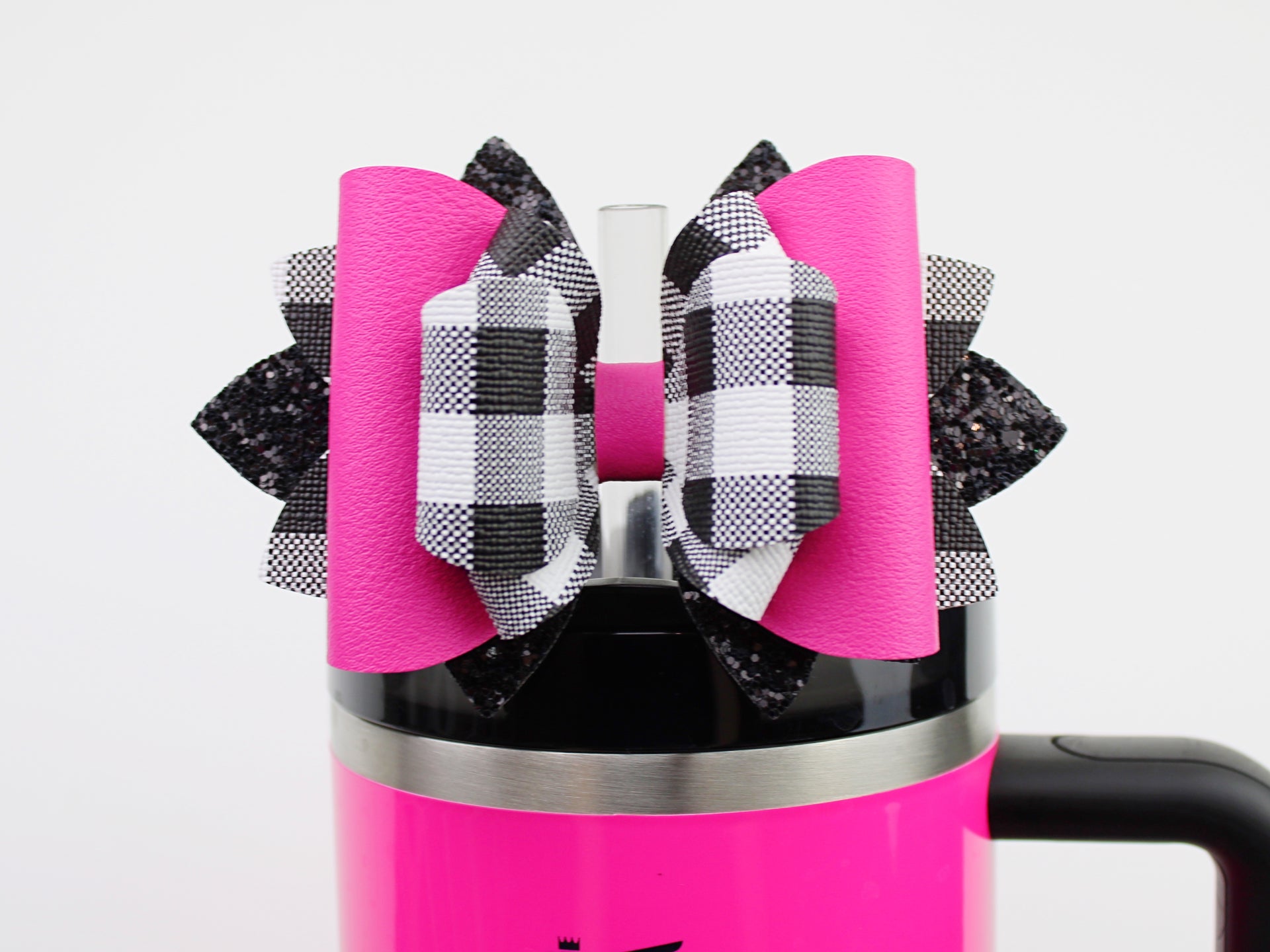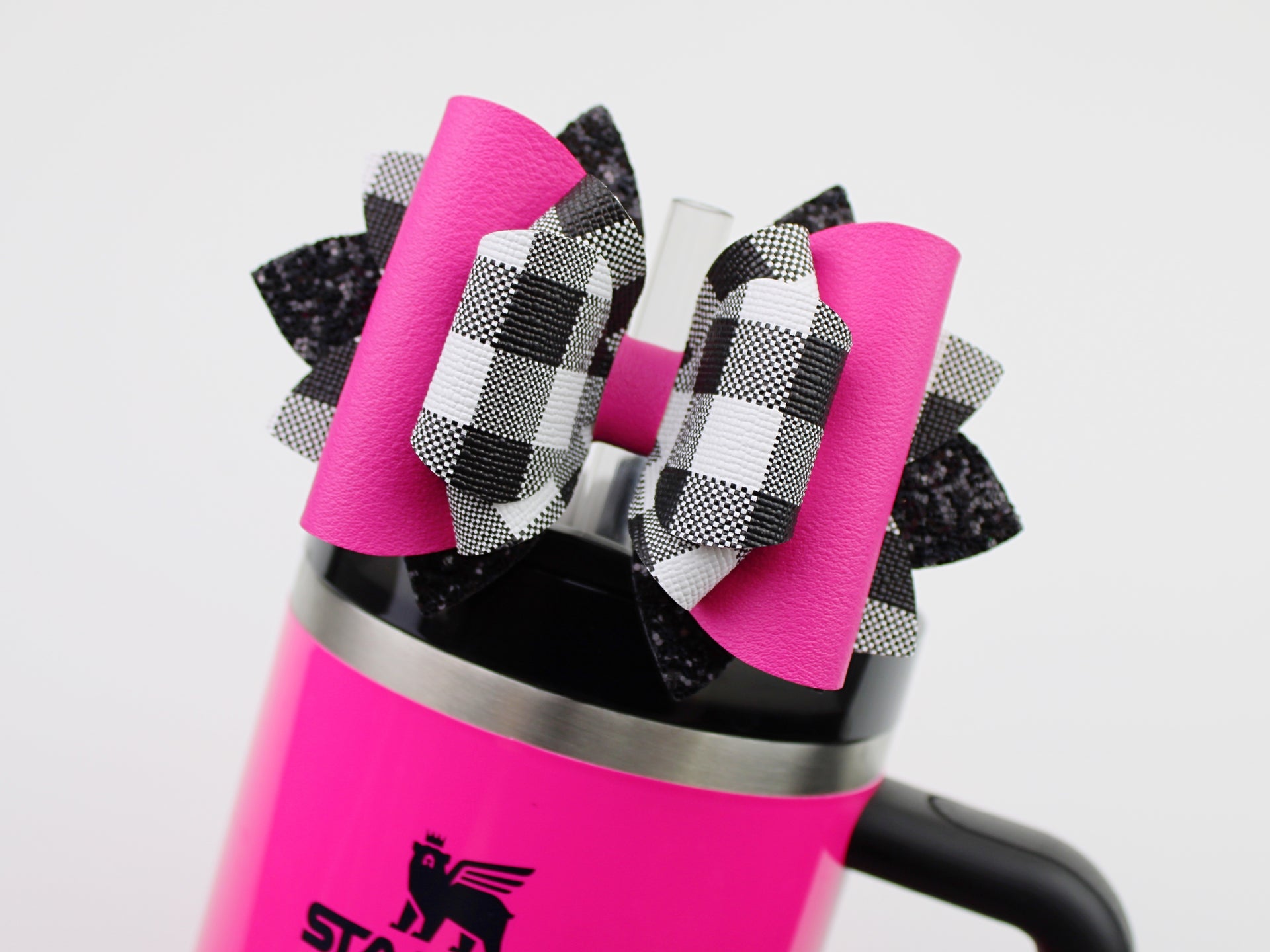 🎀 This Beautiful Bow is made out of faux leather, glitter fabric and designed to fit Stanley straws. Size: 4.5 inches. Each bow is handmade, ensuring a unique touch in every creation. 🎨 Due to screen variations, actual colors may slightly differ. 🎀 This listing is for the bow only.