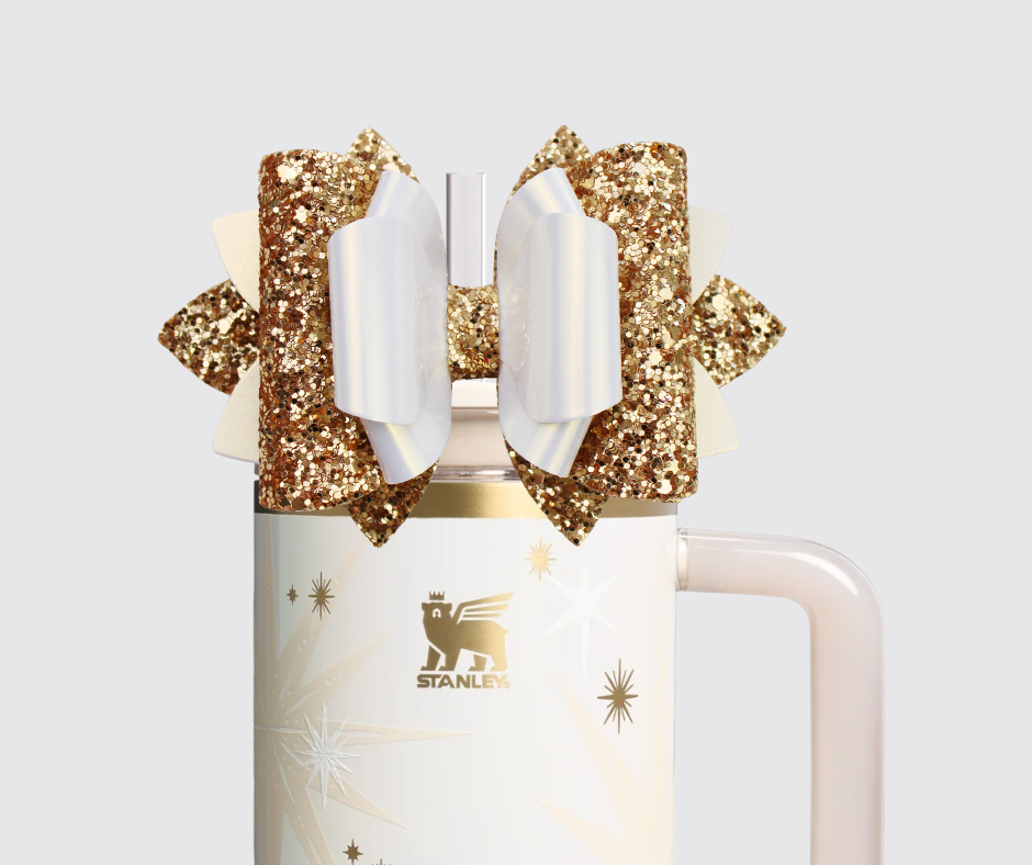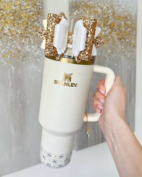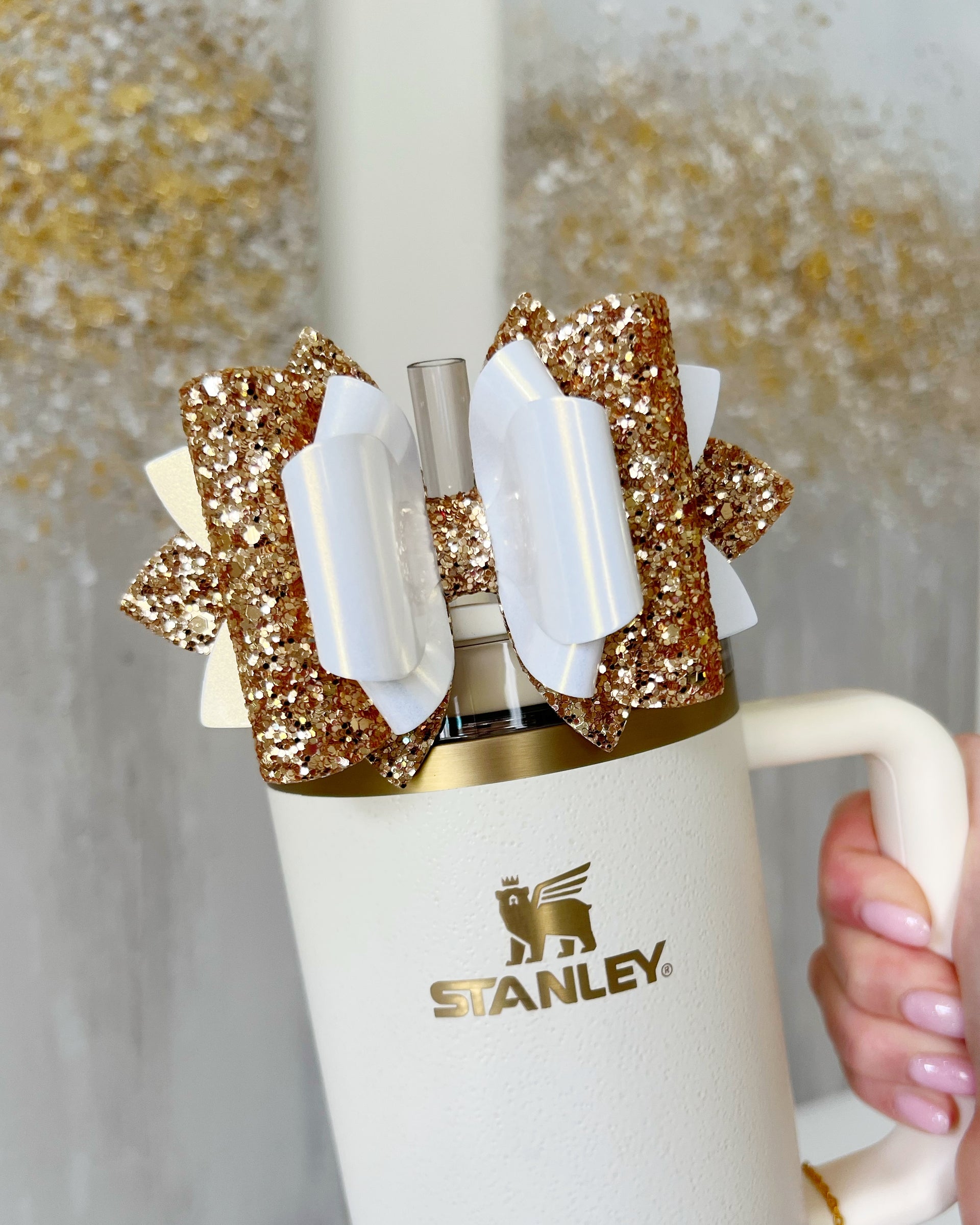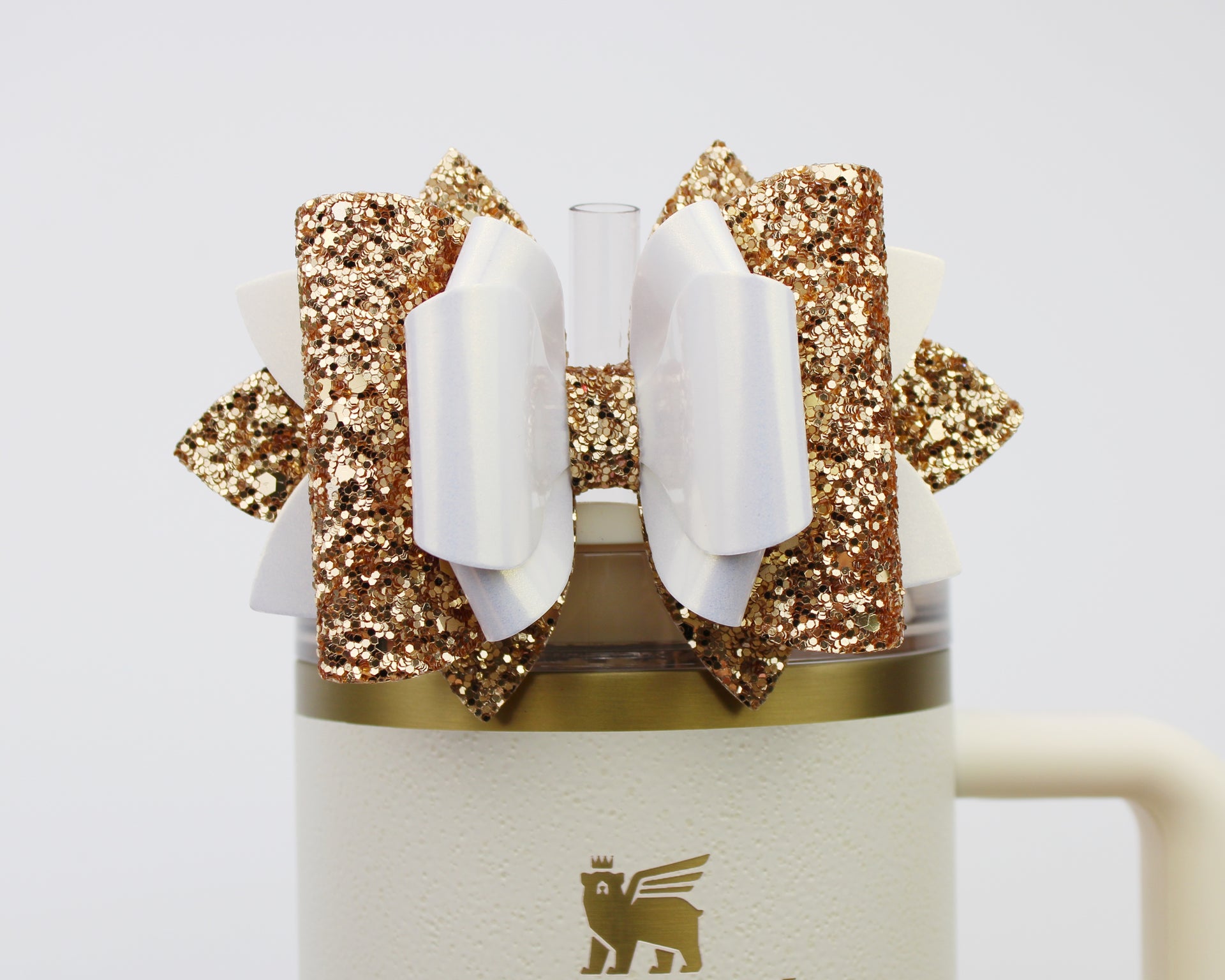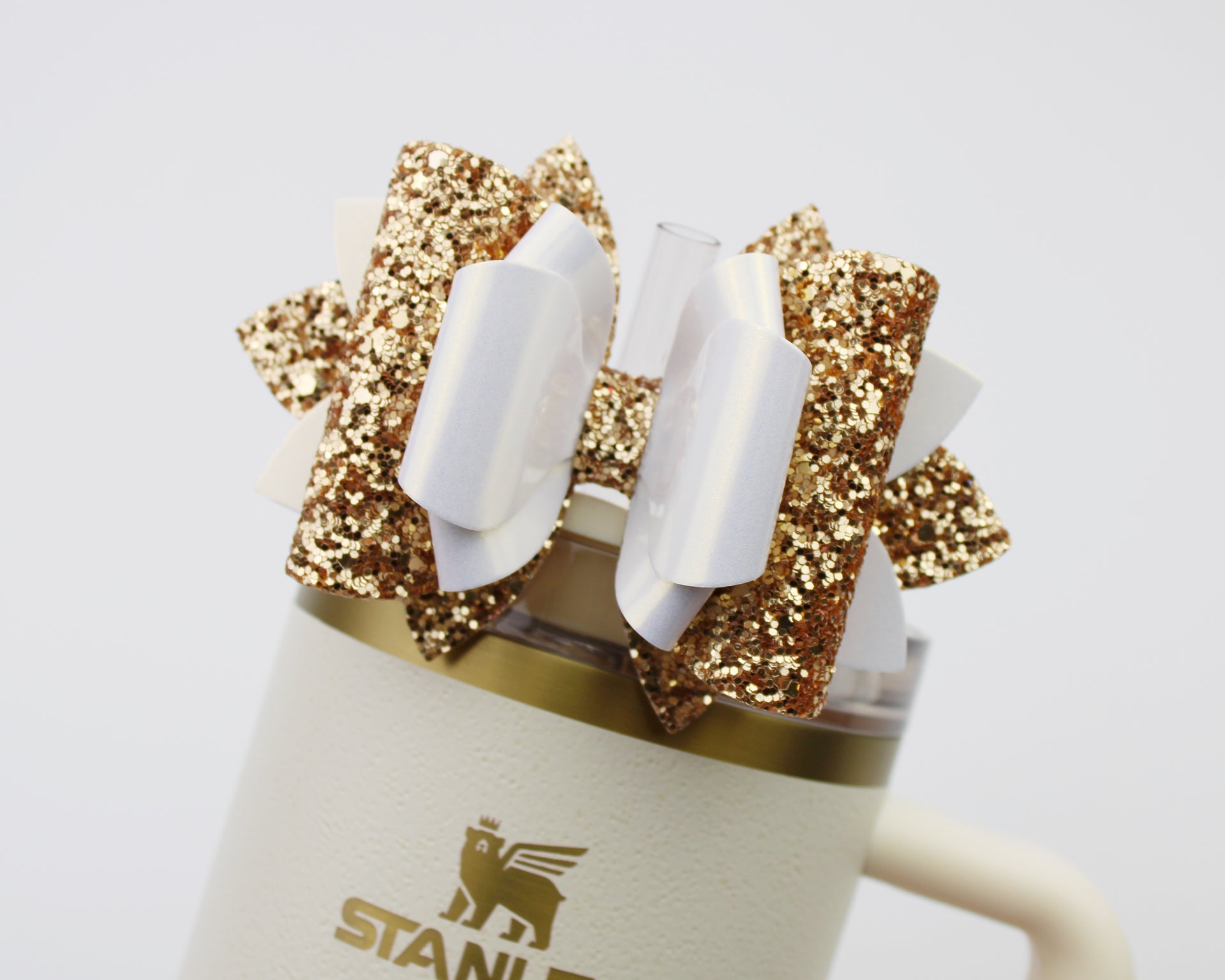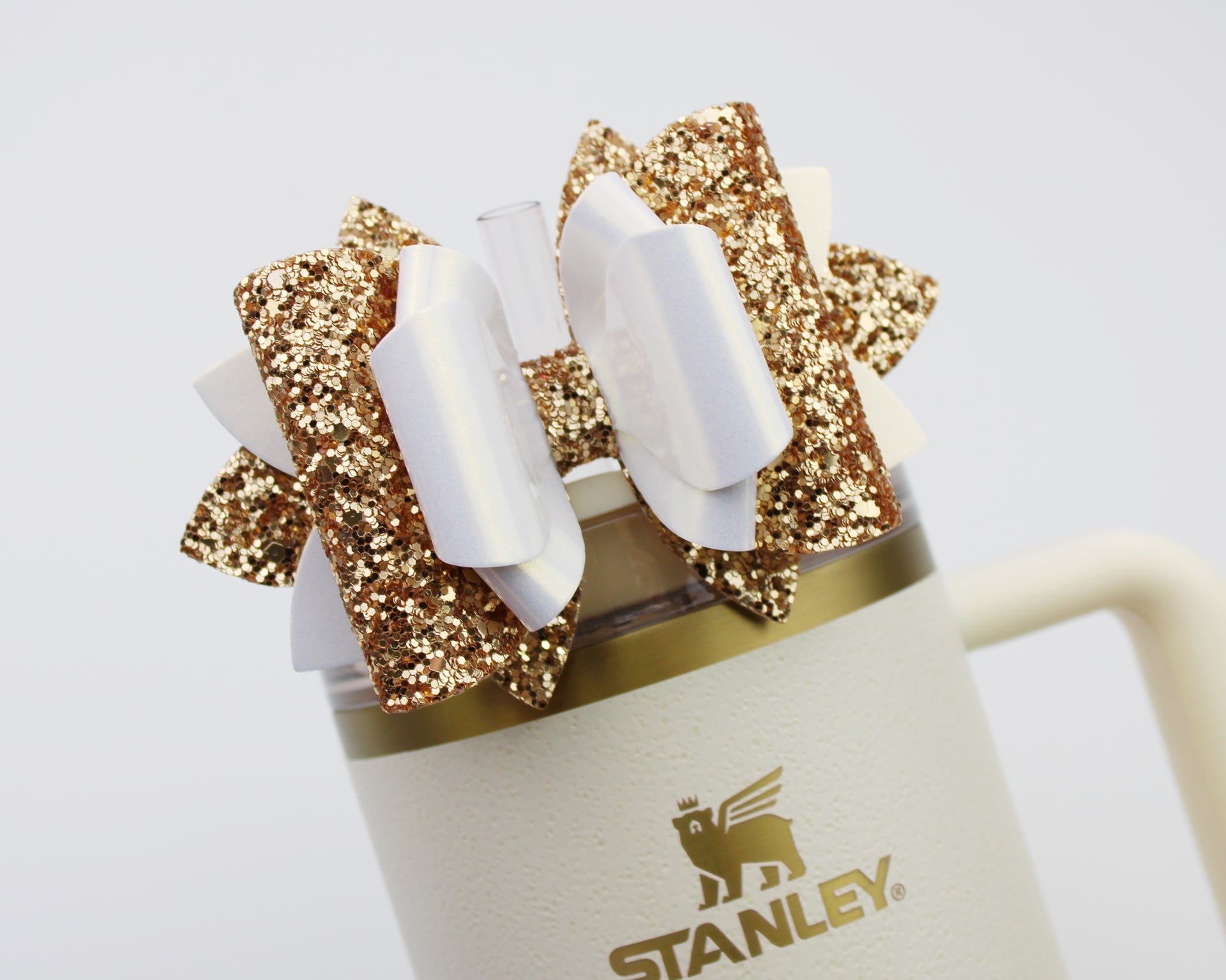 🎀 This Beautiful Bow is made out of faux leather, glitter fabric and designed to fit Stanley straws. Size: 4.5 inches. Each bow is handmade, ensuring a unique touch in every creation. 🎨 Due to screen variations, actual colors may slightly differ. 📦 This listing is for the bow only.