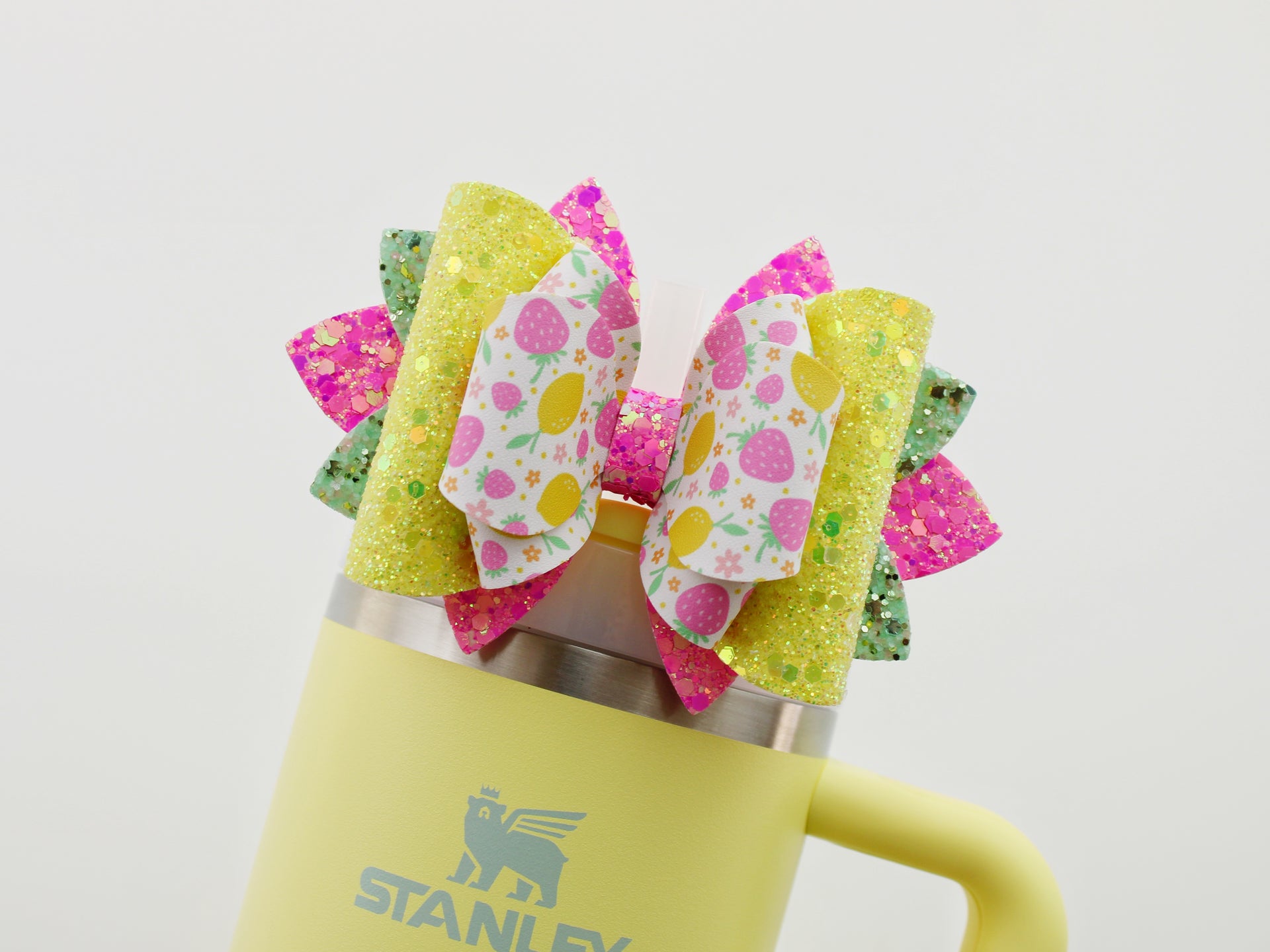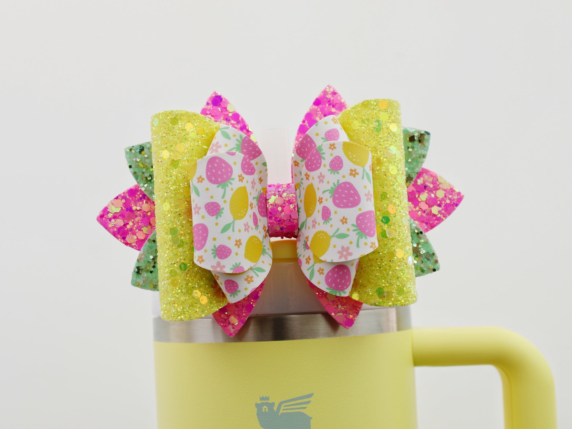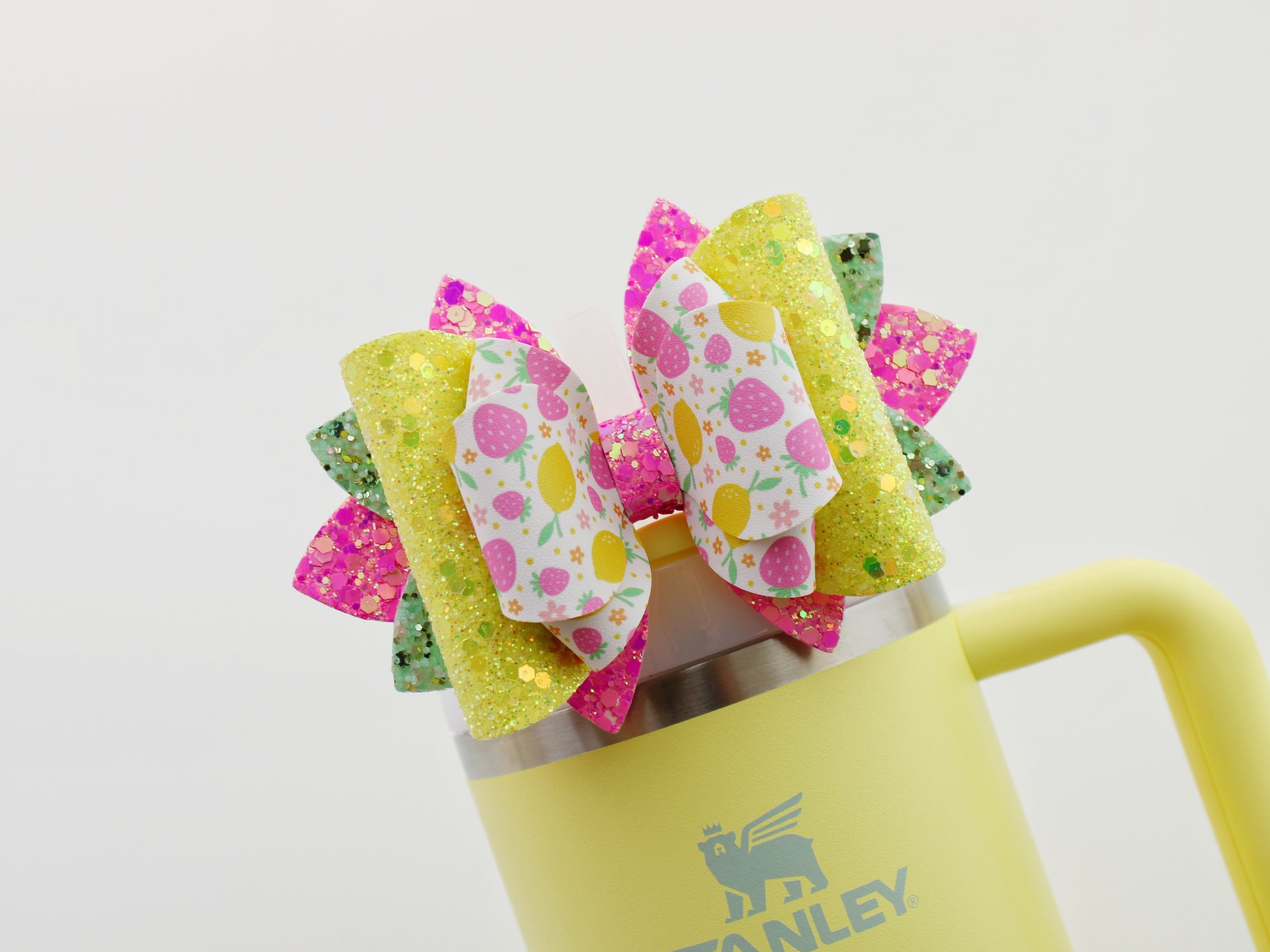 🎀 This Beautiful Bow is made out of faux leather, glitter fabric and designed to fit Stanley straws. Size: 4.5 inches. Each bow is handmade, ensuring a unique touch in every creation. 🎨 Due to screen variations, actual colors may slightly differ. 📦 This listing is for the bow only.