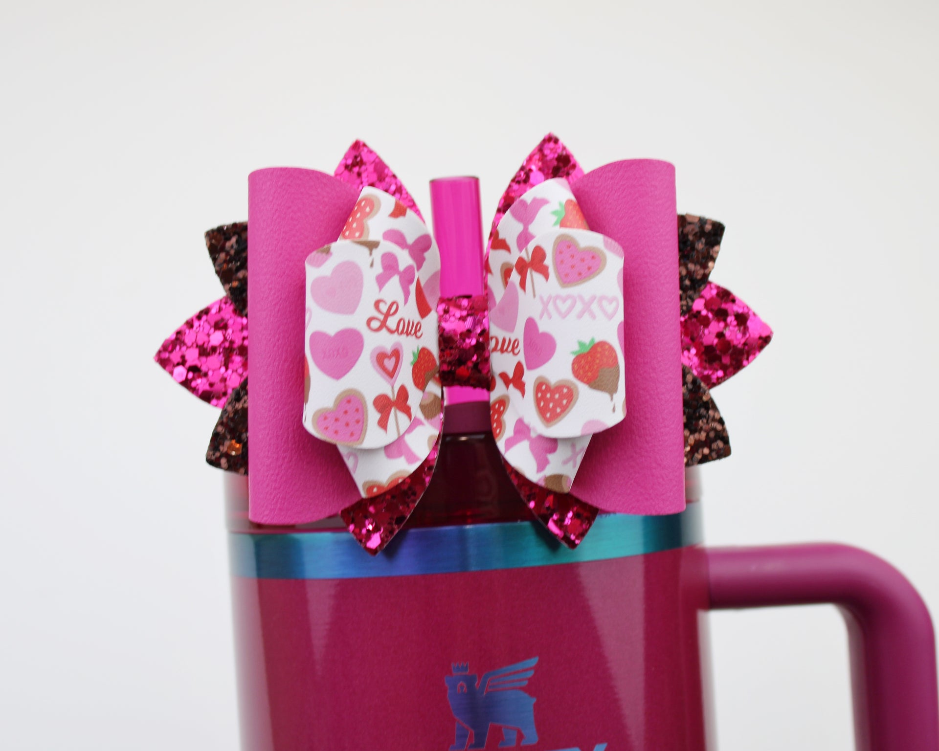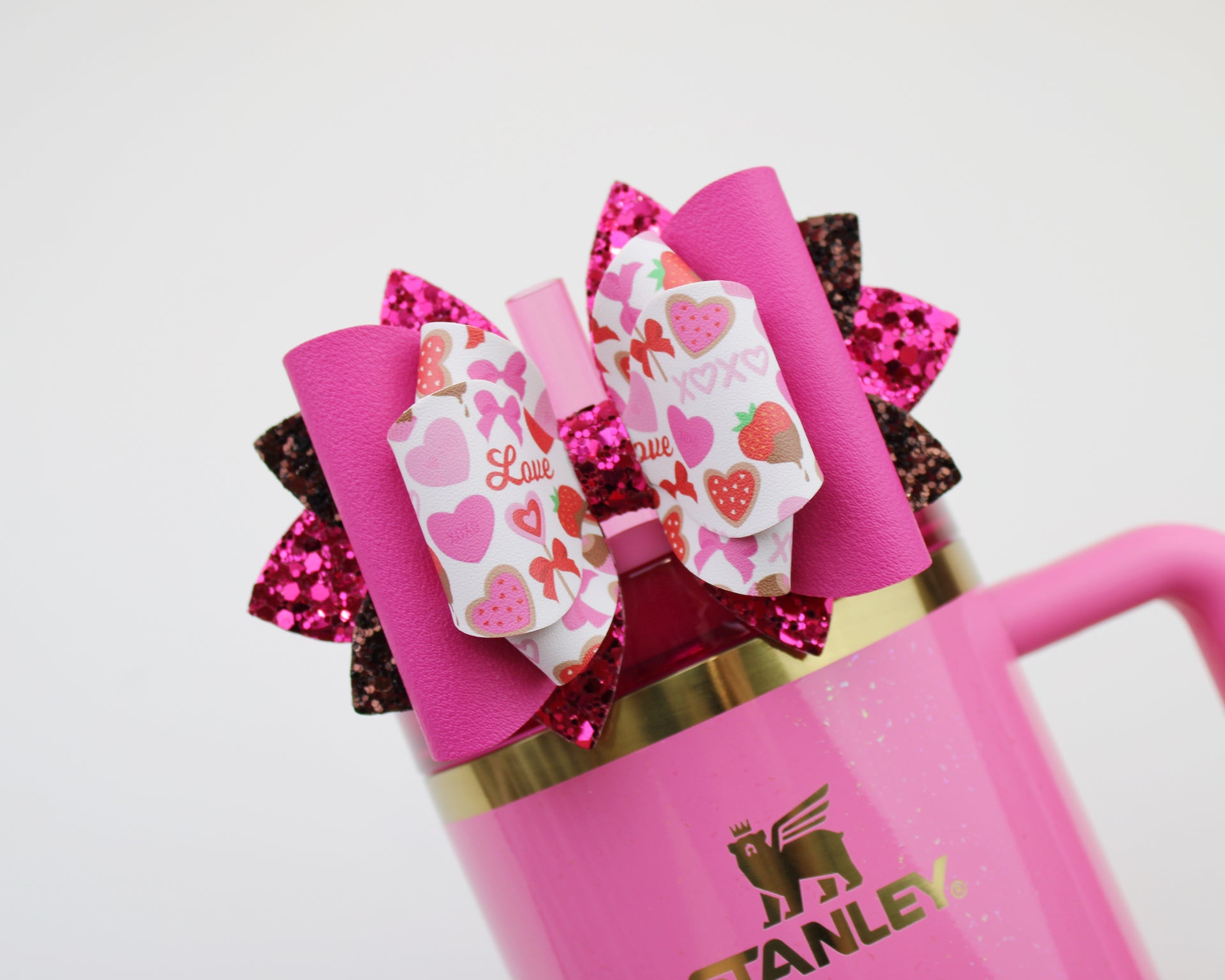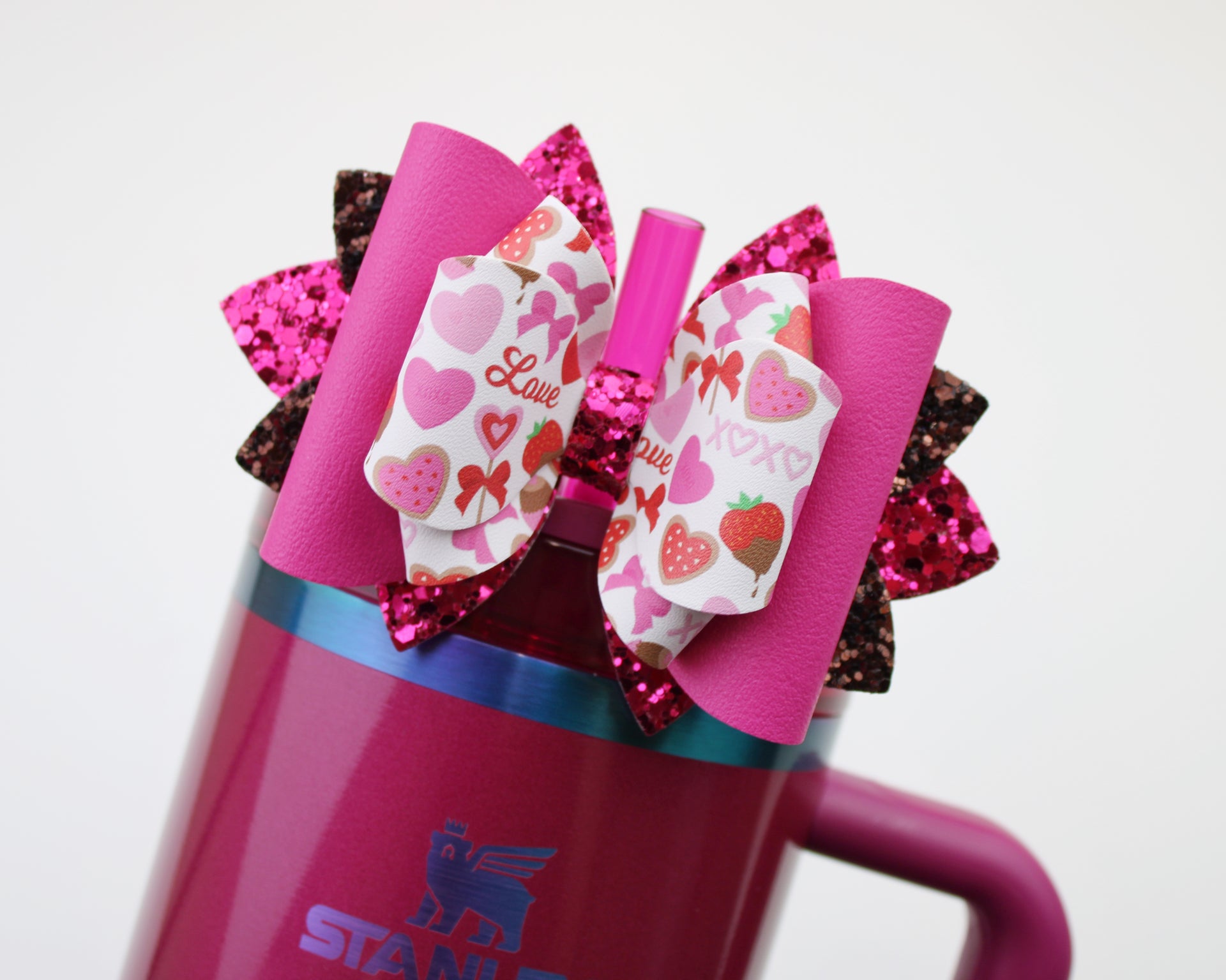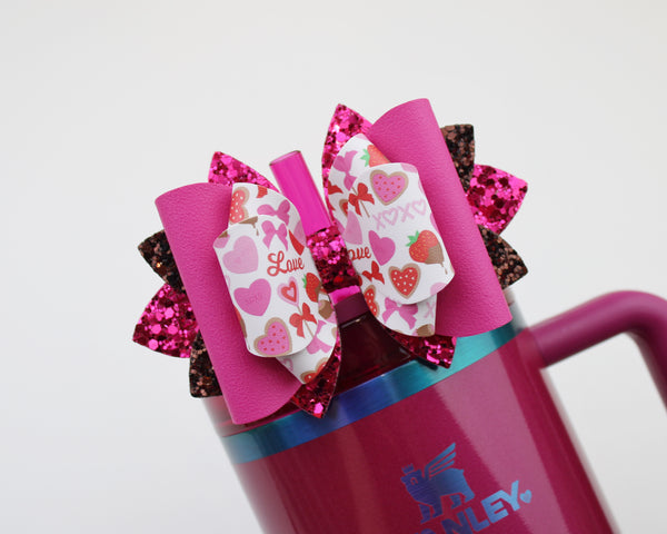 🎀 This Beautiful Bow is made out of faux leather, glitter fabric and designed to fit Stanley straws. Size: 4.5 inches. Each bow is handmade, ensuring a unique touch in every creation.  🎨 Due to screen variations, actual colors may slightly differ. 🎀 This listing is for the bow only.