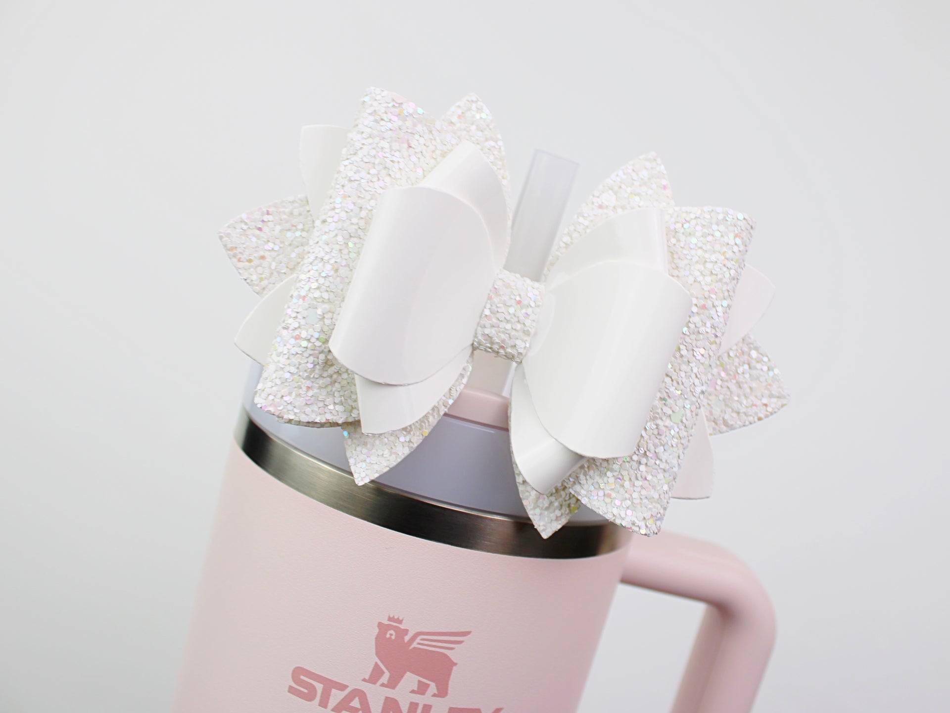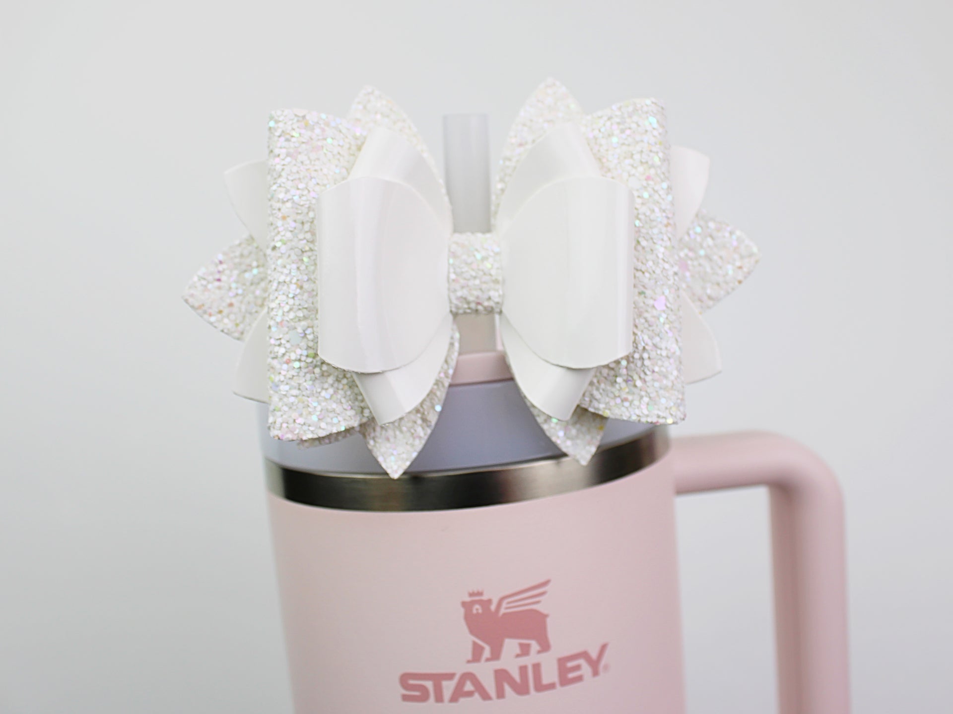 🎀 This Beautiful Bow is made out of faux leather, glitter fabric and designed to fit Stanley straws. Size: 4.5 inches. Each bow is handmade, ensuring a unique touch in every creation. 🎨 Due to screen variations, actual colors may slightly differ. 🎀 This listing is for the bow only.